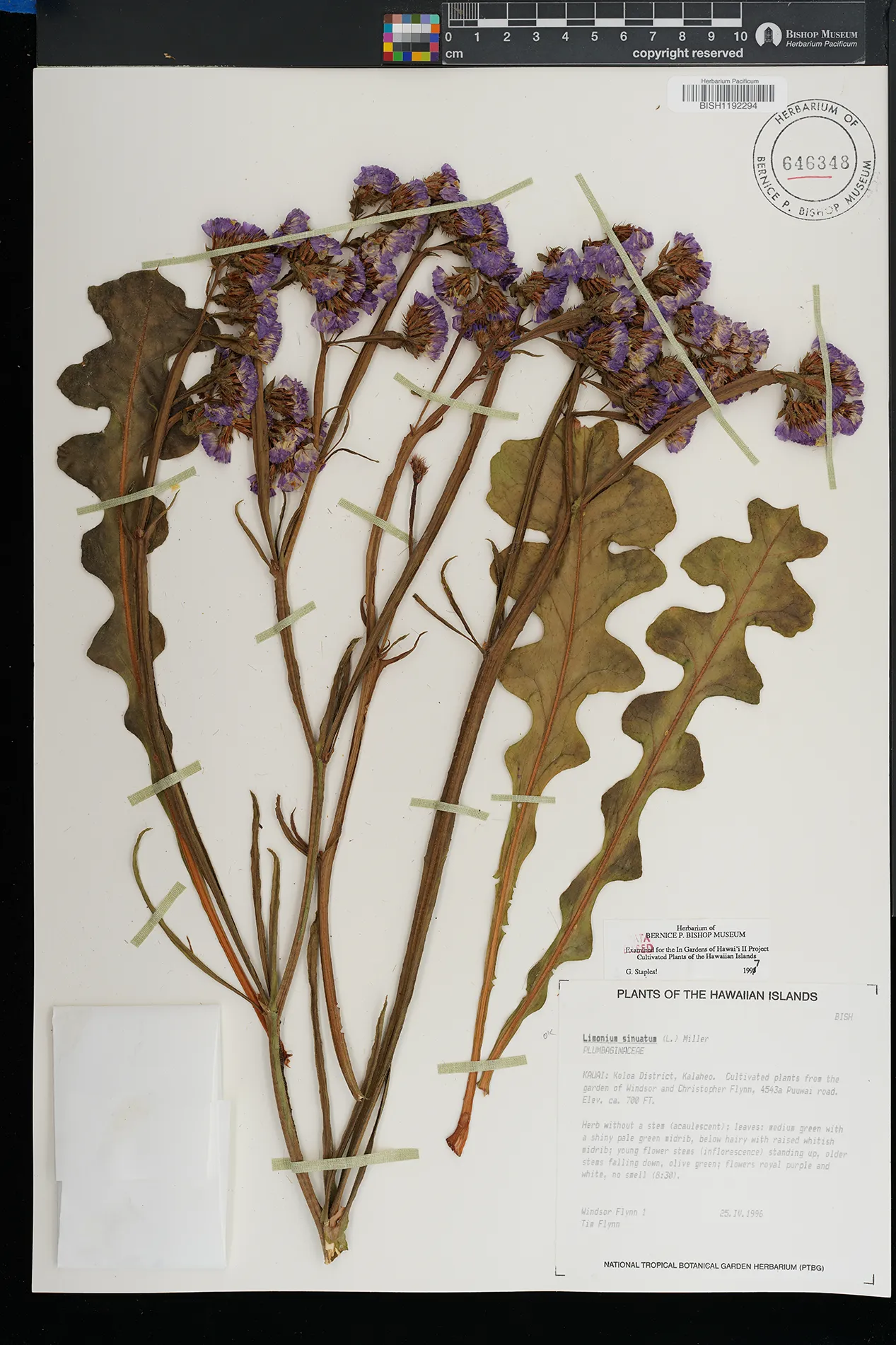 | 7 | Limonium sinuatum | (L.) Mill. | Koloa District, Kalaheo. Cultivated plants from the garden of Windsor and Christopher Flynn, 4543a Puuwai road | PRESERVED_SPECIMEN | Flynn, W. | 1 | Kauai | BISH | 4/25/1996 | |