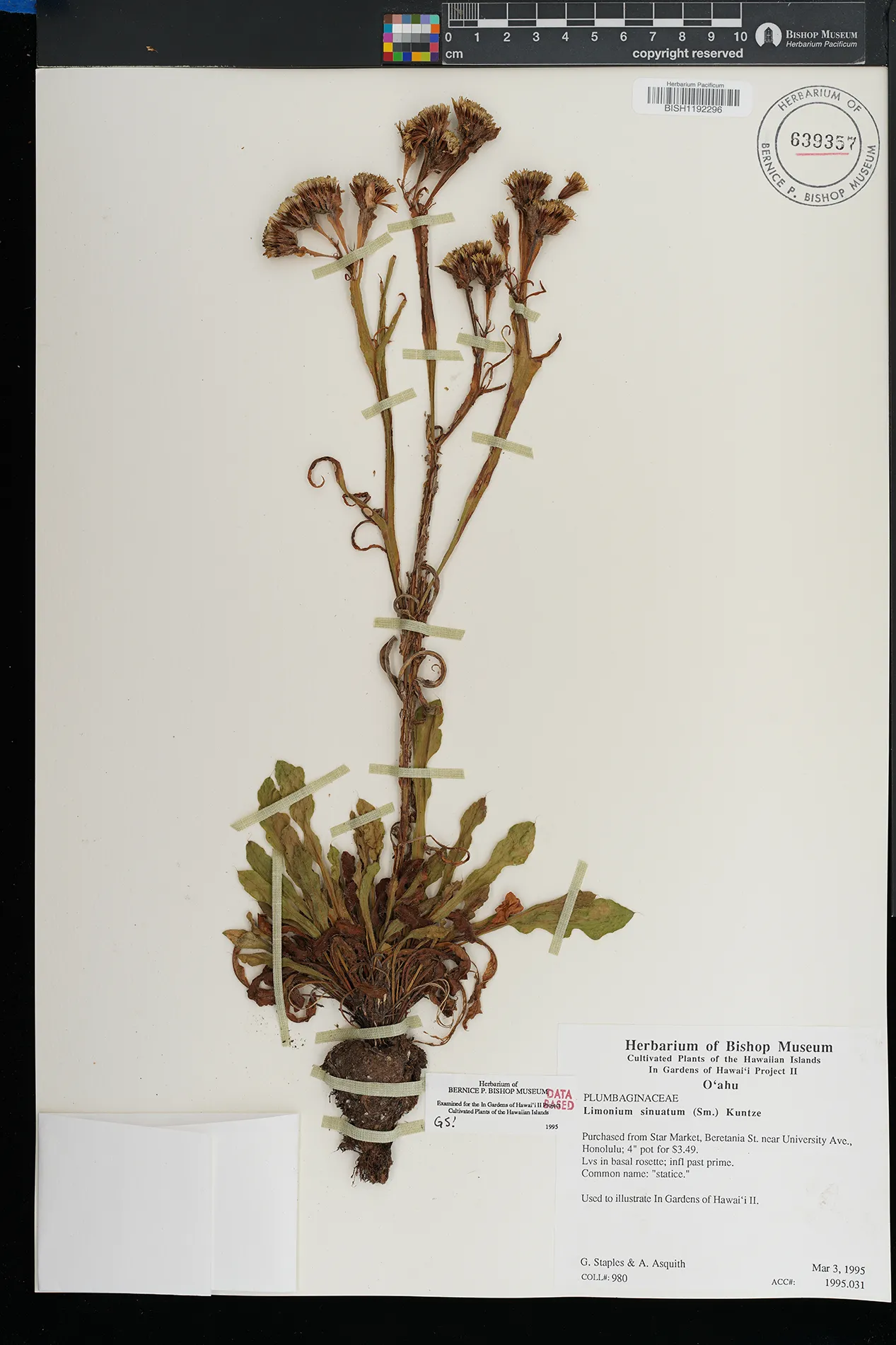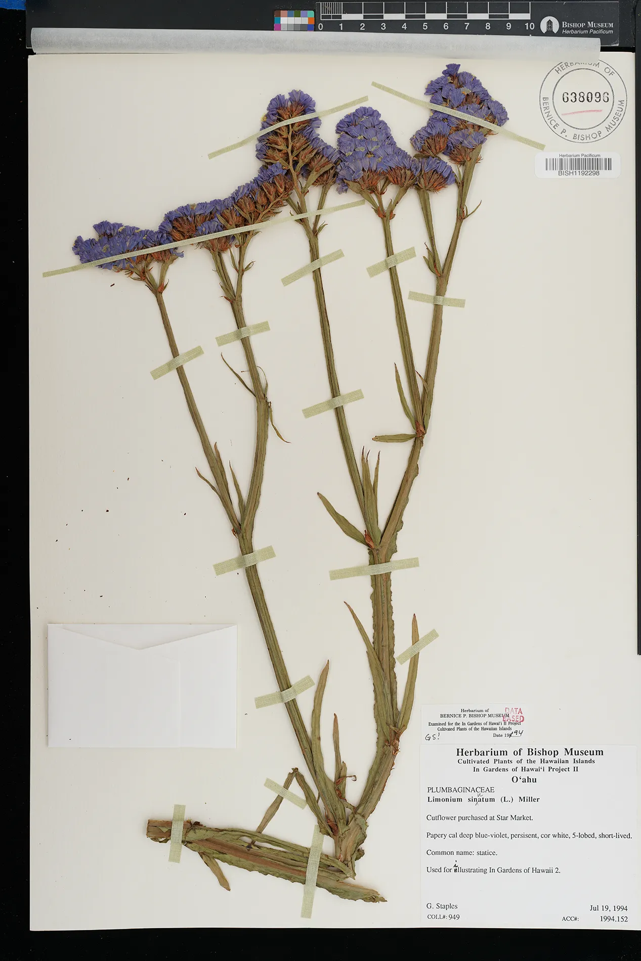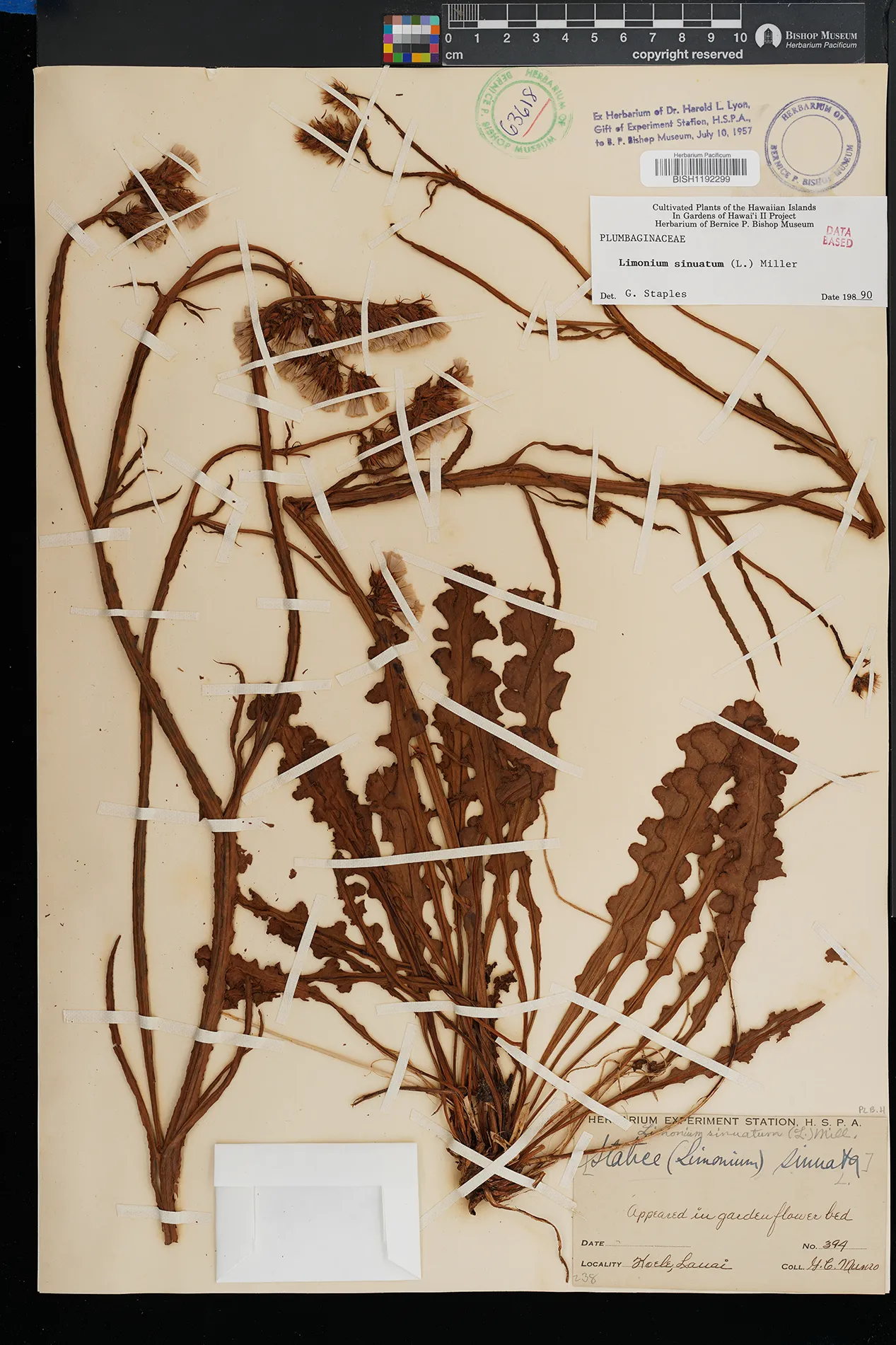 | 2 | Limonium sinuatum | (L.) Mill. | Kailua | PRESERVED_SPECIMEN | Staples, G.W. | Collector Number: 996 | Oahu | BISH | 3/19/1995 | |