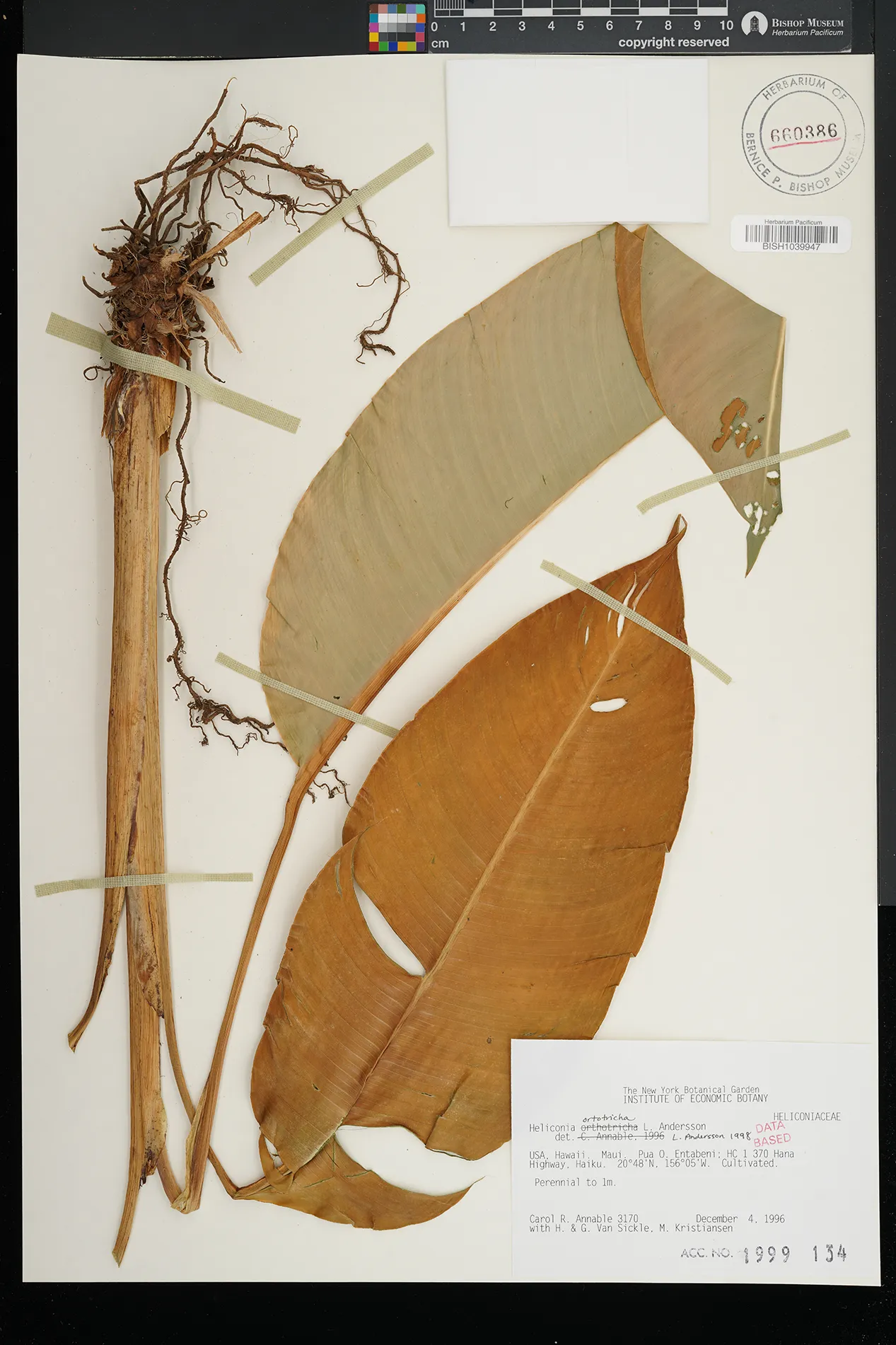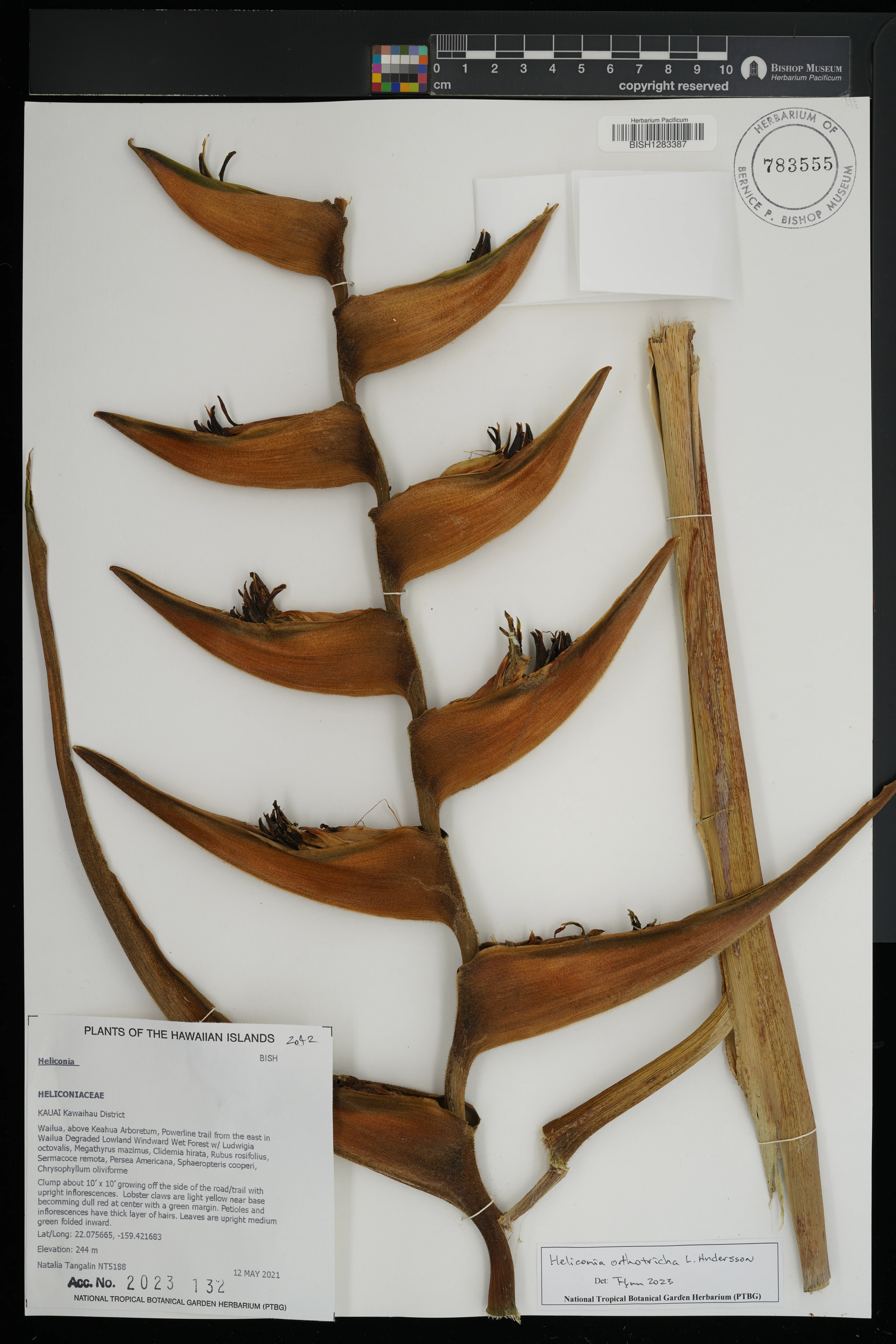 | 3 | Heliconia orthotricha | Lyon Arboretum | Preserved_Specimen | 1.75m ht; stems 4cm diam at base; blades elliptic, 80-100x22cm, the midrib villous beneath; petiole bronzy, villous, 35-45cm; sheath w. conspicuously expanded, chartaceous margin; peduncle c 5cm; bracts 6, pubescent, red w. green toward apex along lip; flowers green, 6cm, strongly upcurved. | Nagata, K.M. | 3162 | Oahu | BISH | 1985-01-18 | |
