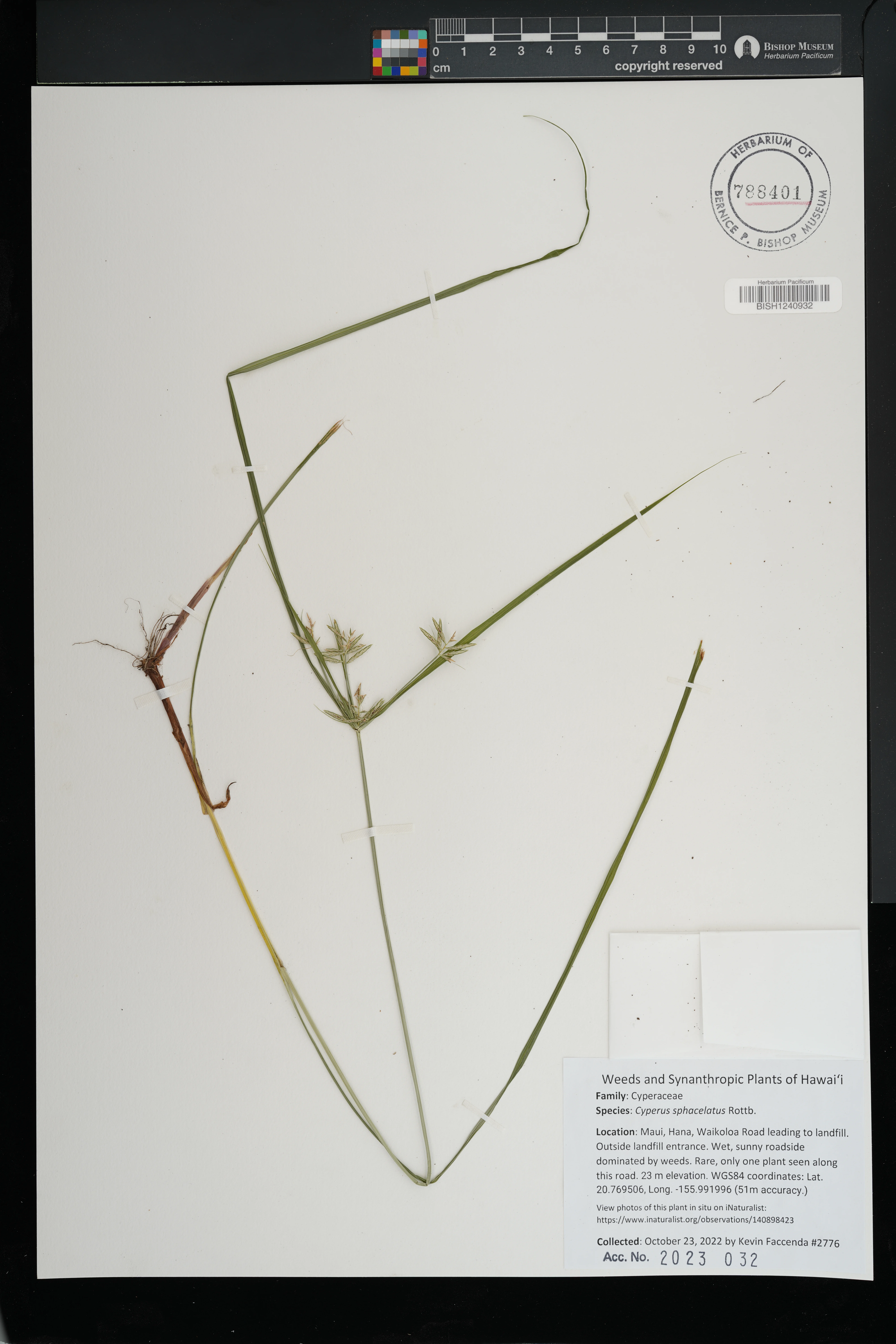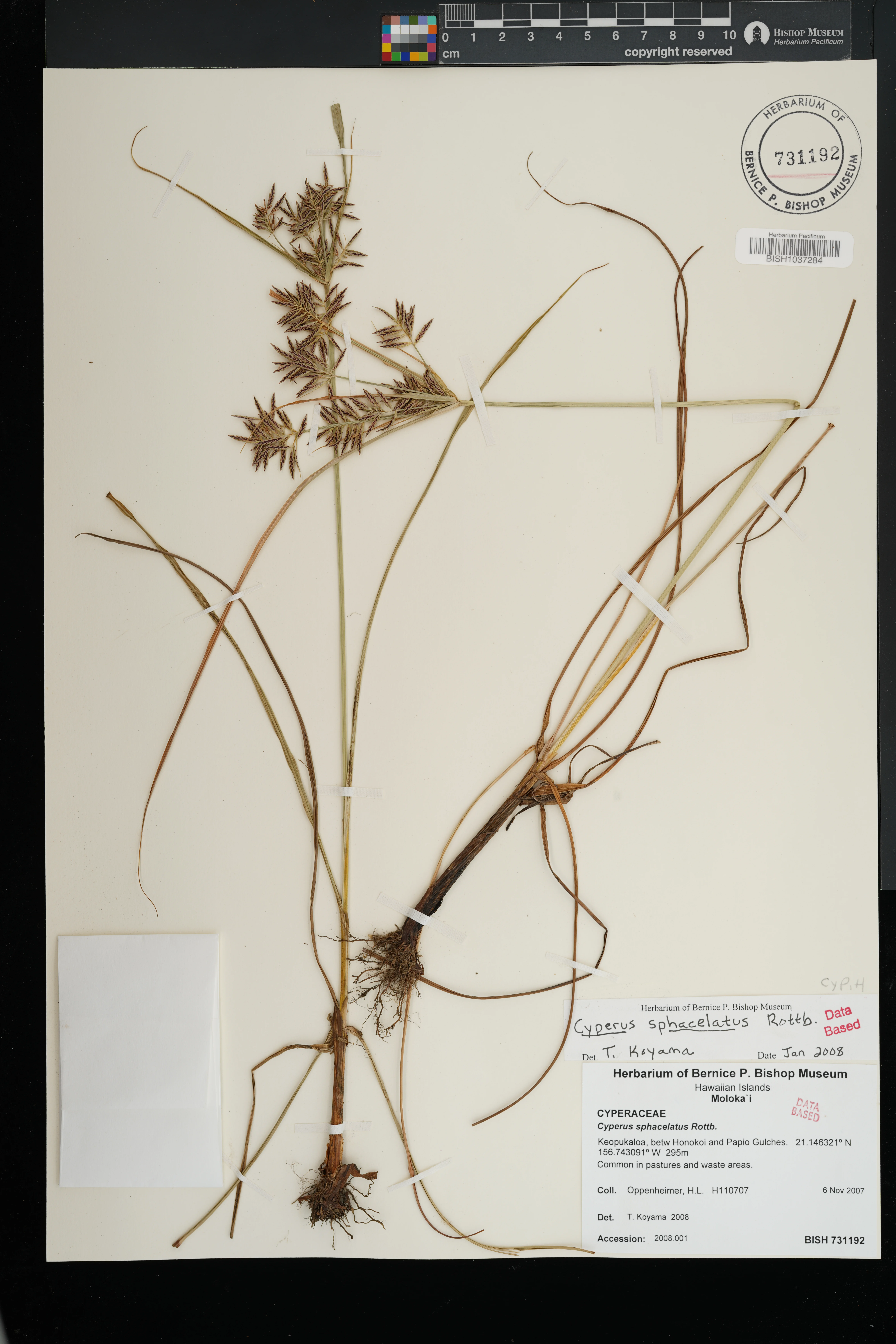 | 7 | Cyperus sphacelatus | Rottb. | Keopukaloa, betw Honokoi and Papio Gulches | Common in pastures and waste areas. | PRESERVED_SPECIMEN | Oppenheimer, H.L. | H110707 | Molokai | BISH | 11/6/2007 |