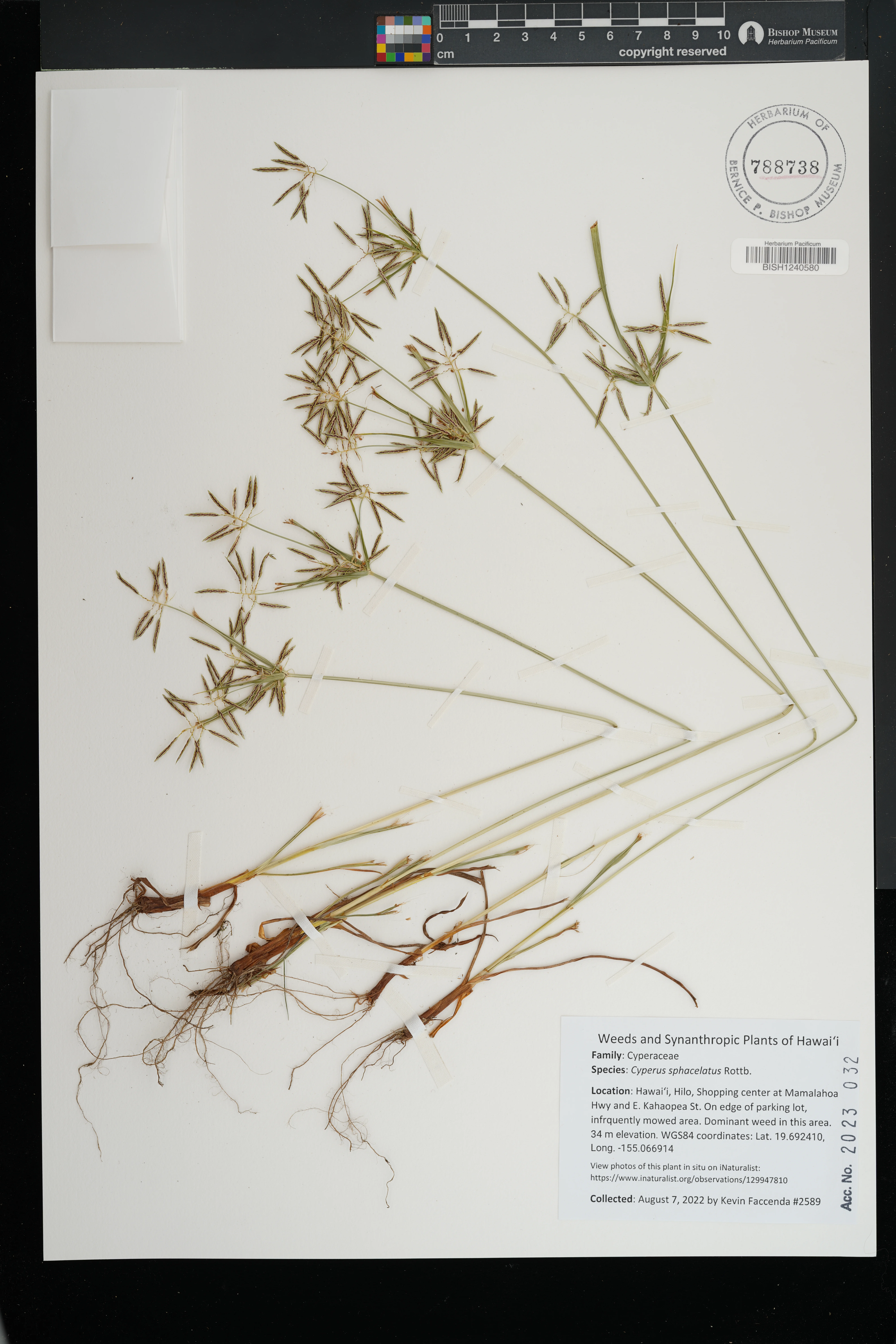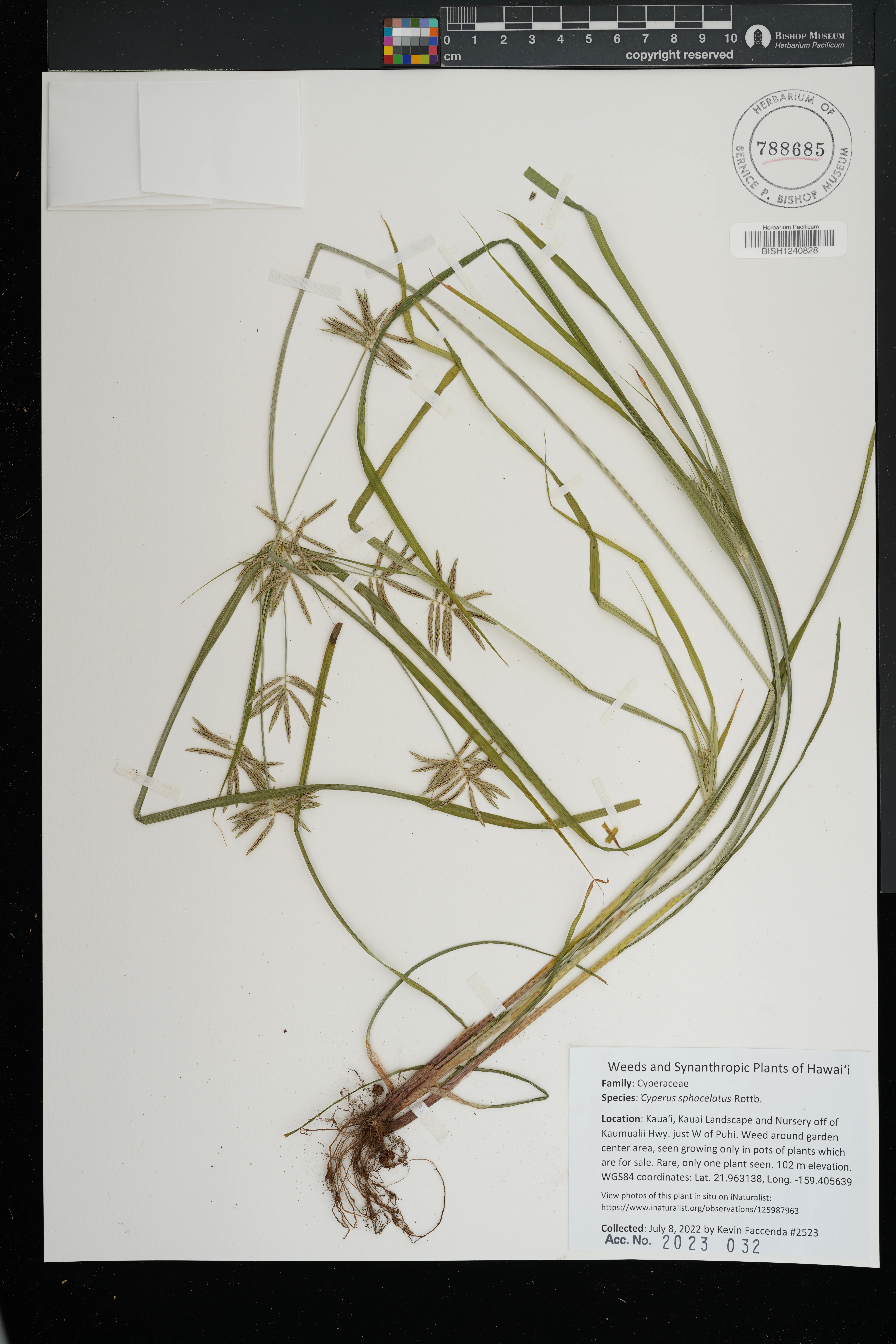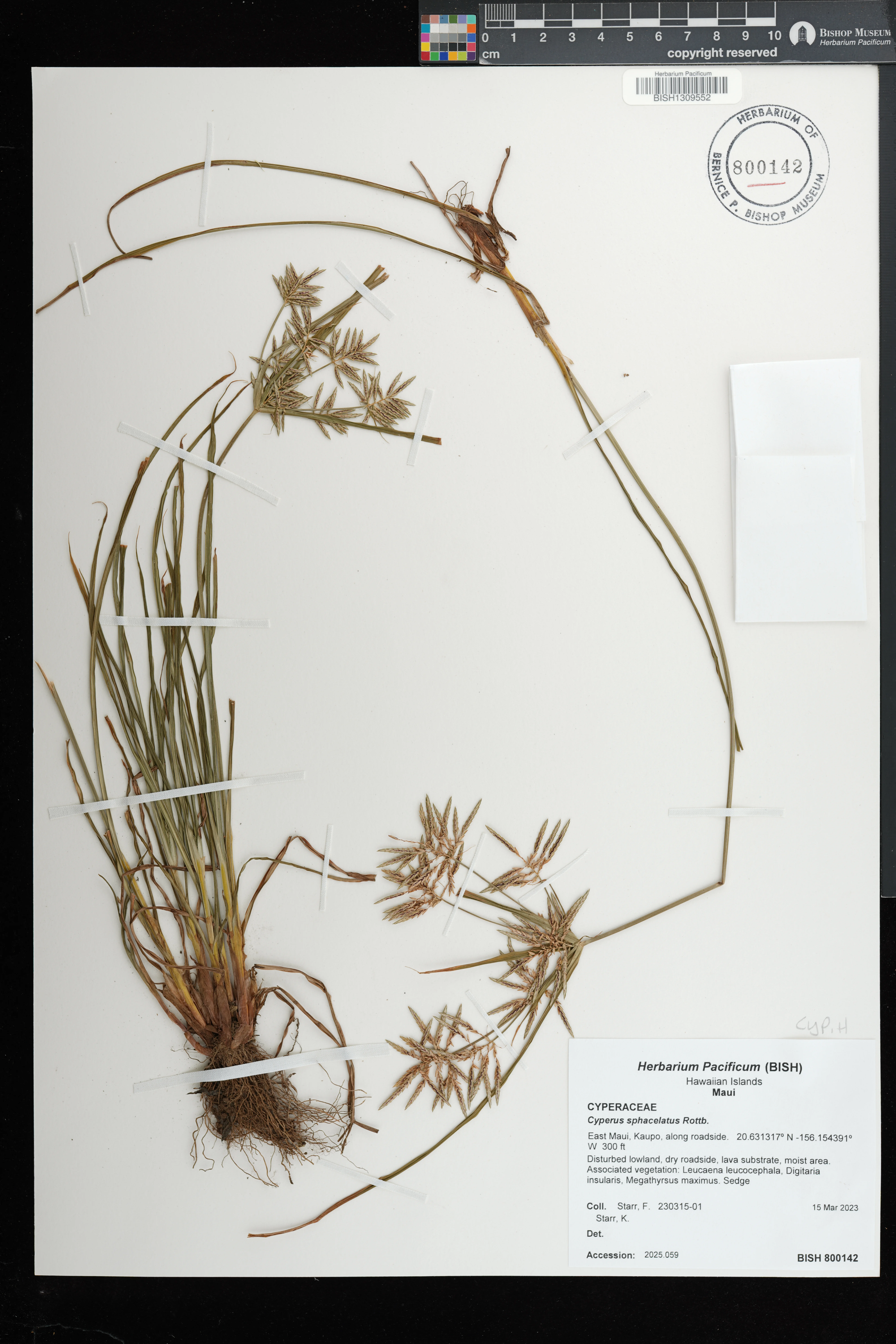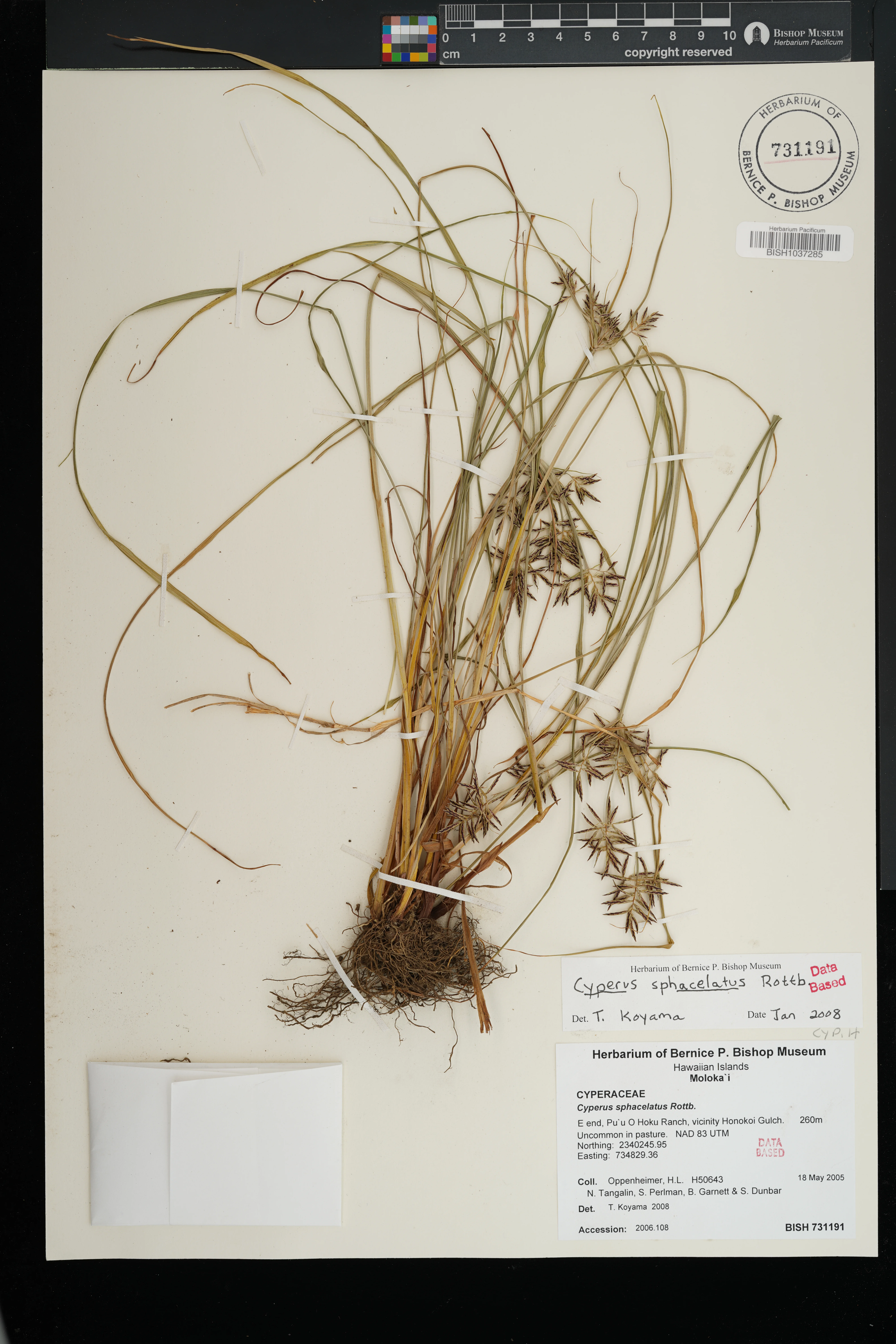 | 6 | Cyperus sphacelatus | Rottb. | Keopukaloa, betw Honokoi and Papio Gulches | Common in pastures and waste areas. | PRESERVED_SPECIMEN | Oppenheimer, H.L. | Collector Number: H110707 | Molokai | BISH | 11/6/2007 |