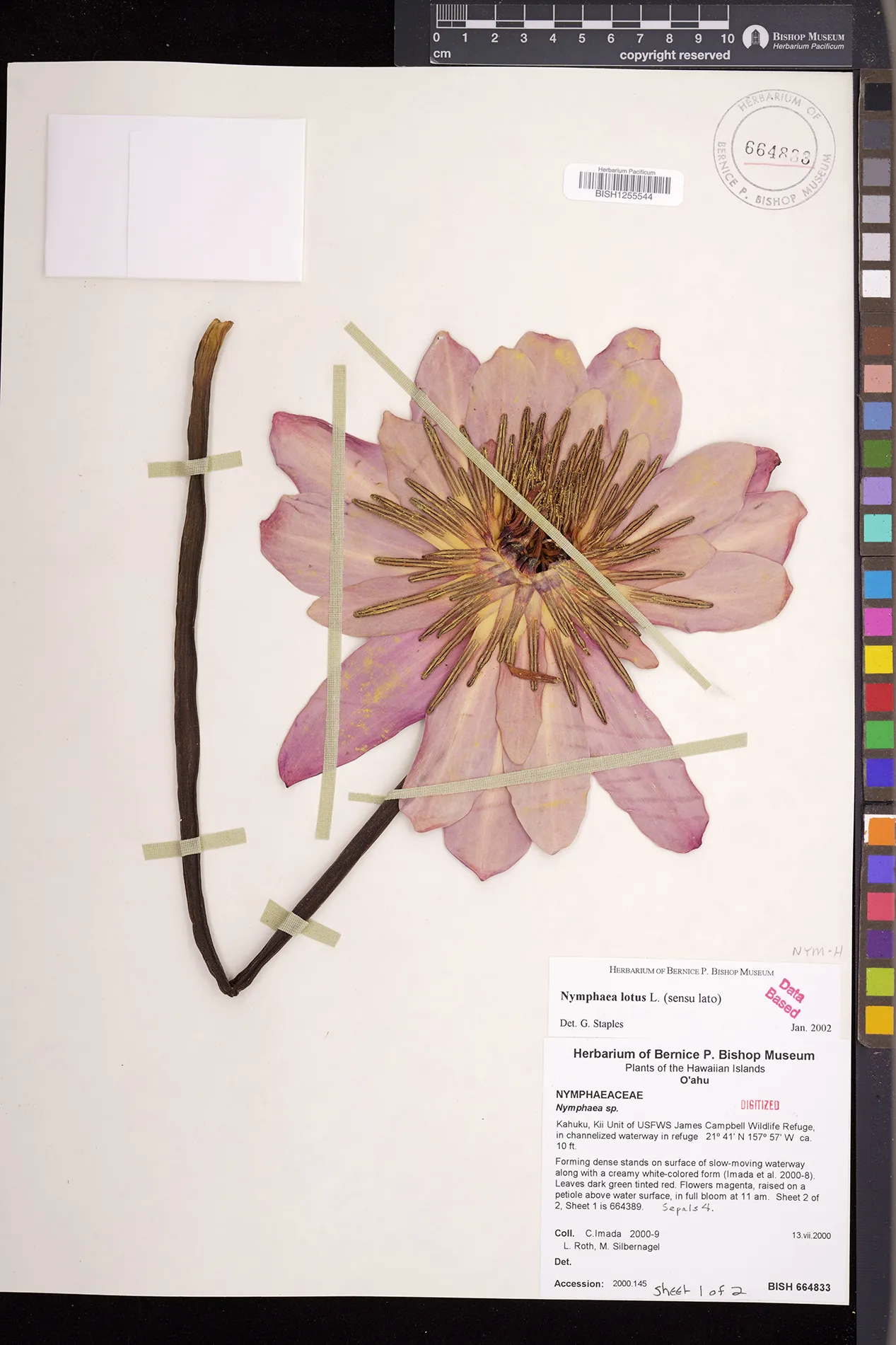 Forming dense stands on surface of slow-moving waterway along with a magenta-flowered form (Imada et al. 2000-9). |