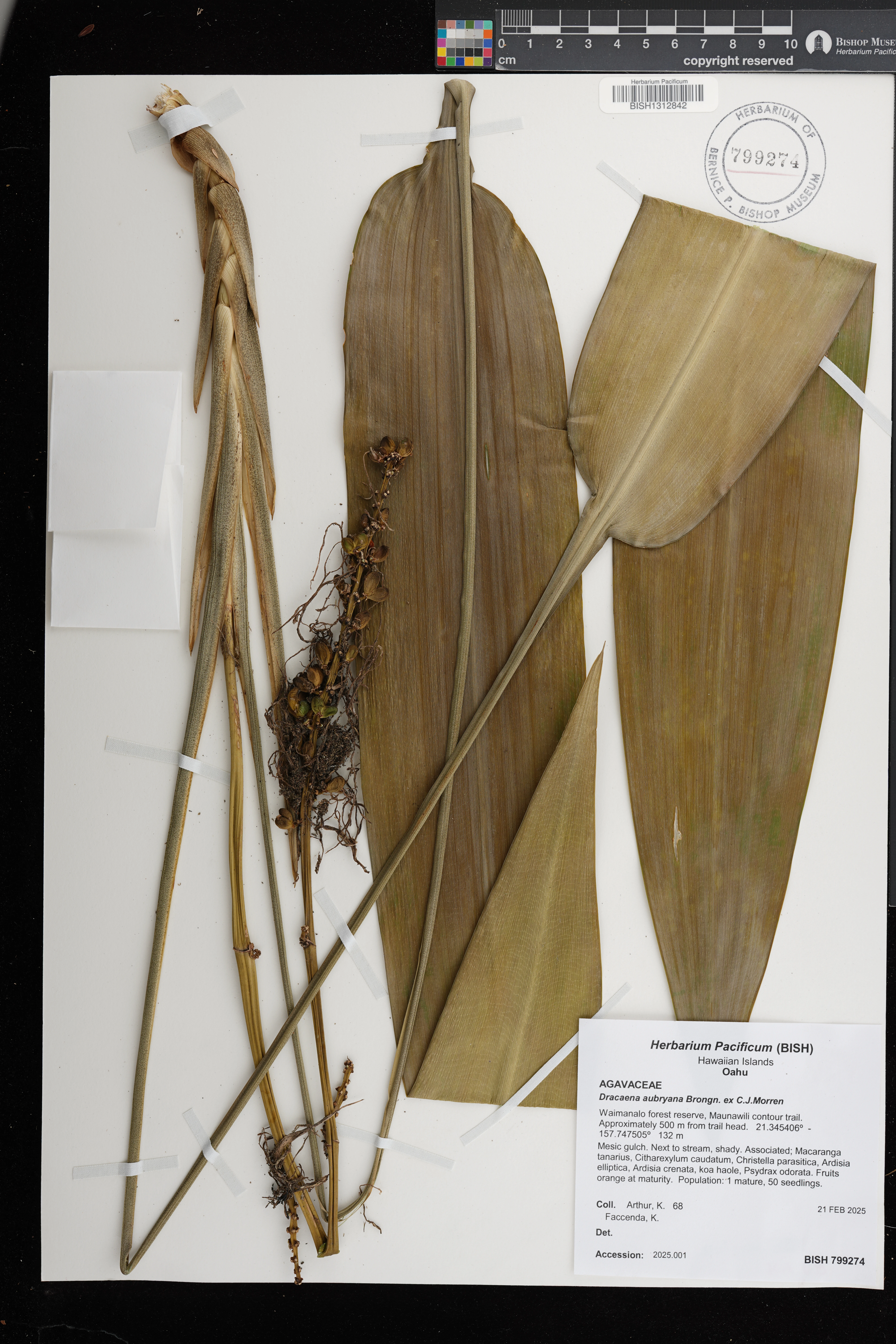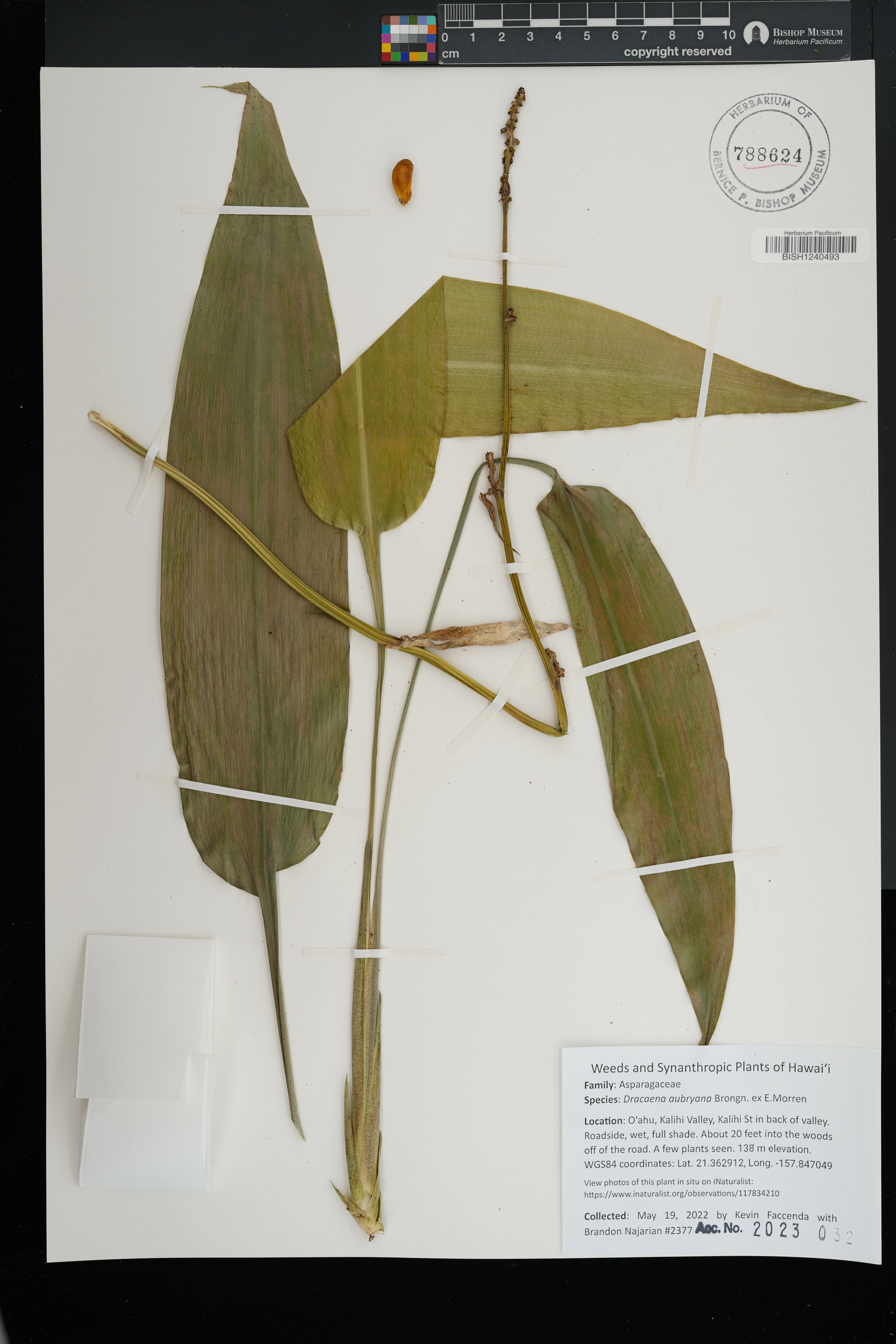 | 3 | Dracaena aubryana | Brongn. ex É.Morren | waimea arboretum | PRESERVED_SPECIMEN | mood, j. | collector number: s.n. | Oahu | BISH | 6/6/1989 | |