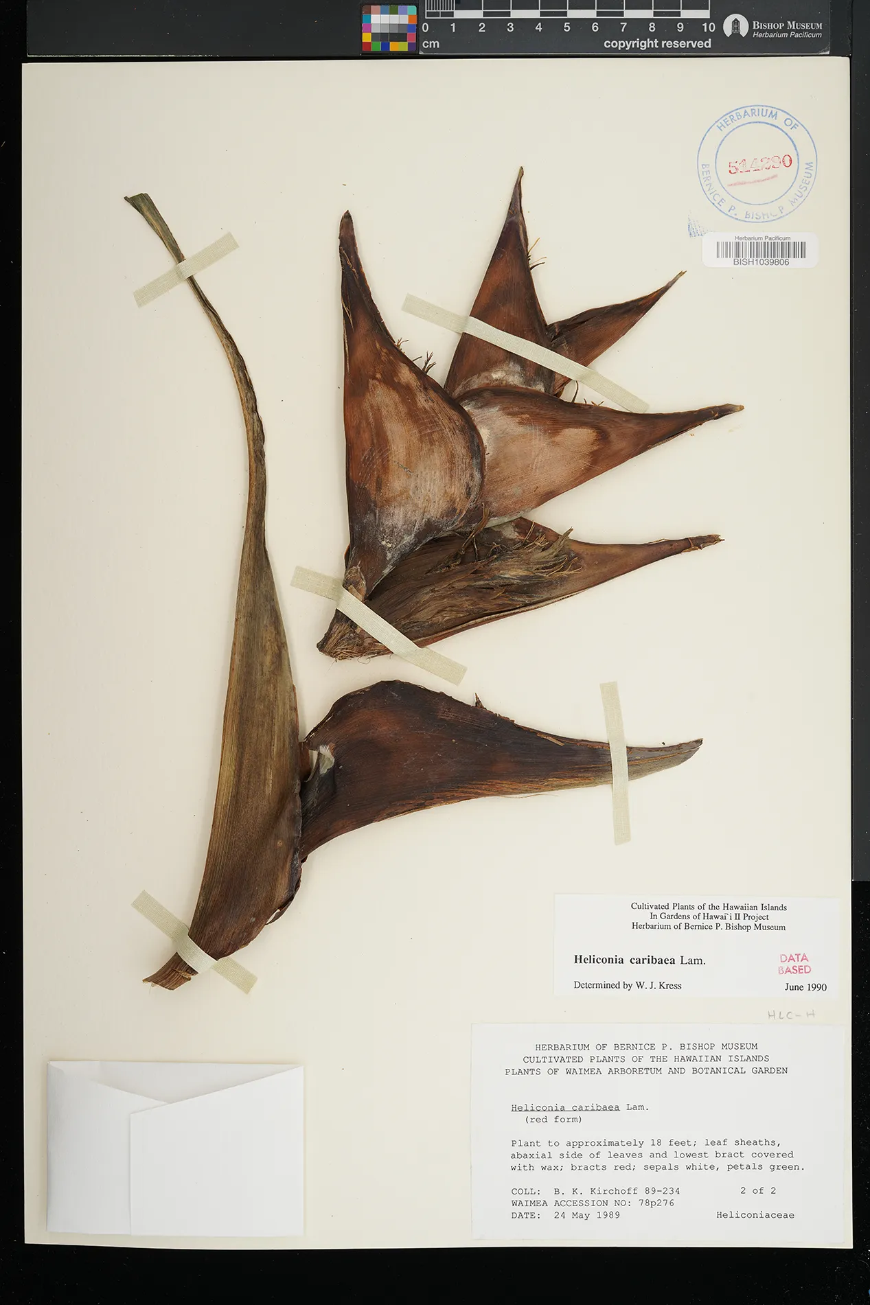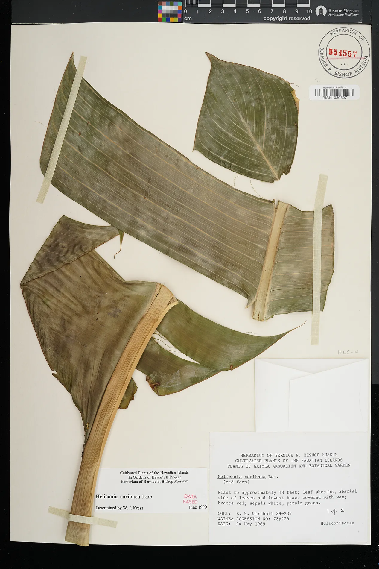 | 10 | Heliconia caribaea | Lam. | Waimea Arboretum & Botanical Garden | PRESERVED_SPECIMEN | Kirchoff, B.K. | 89-234 | Oahu | BISH | 5/24/1989 | |