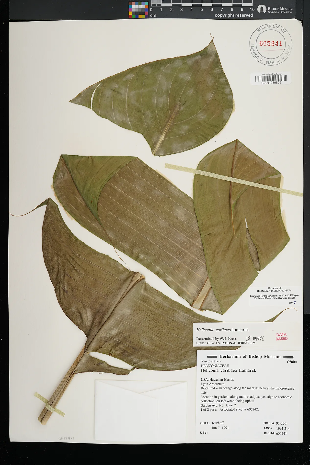 | 4 | Heliconia caribaea | Lam. | Lyon arboretum | PRESERVED_SPECIMEN | Kress, W. J. | 92-3531 | Oahu | US | 8/13/1992 | |
