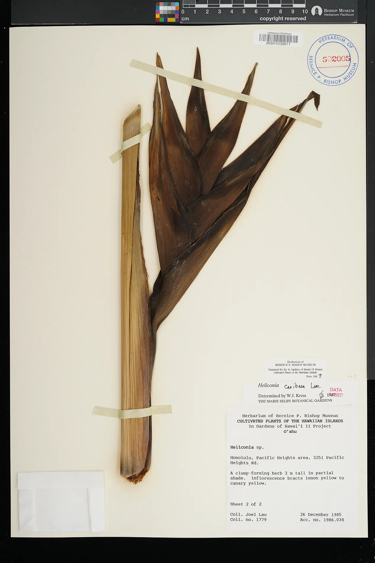 | 9 | Heliconia caribaea | Lam. | pacific heights area; 3251 pacific heights road | PRESERVED_SPECIMEN | lau, j. | collector number: 1779 | Oahu | BISH | 12/26/1985 | |