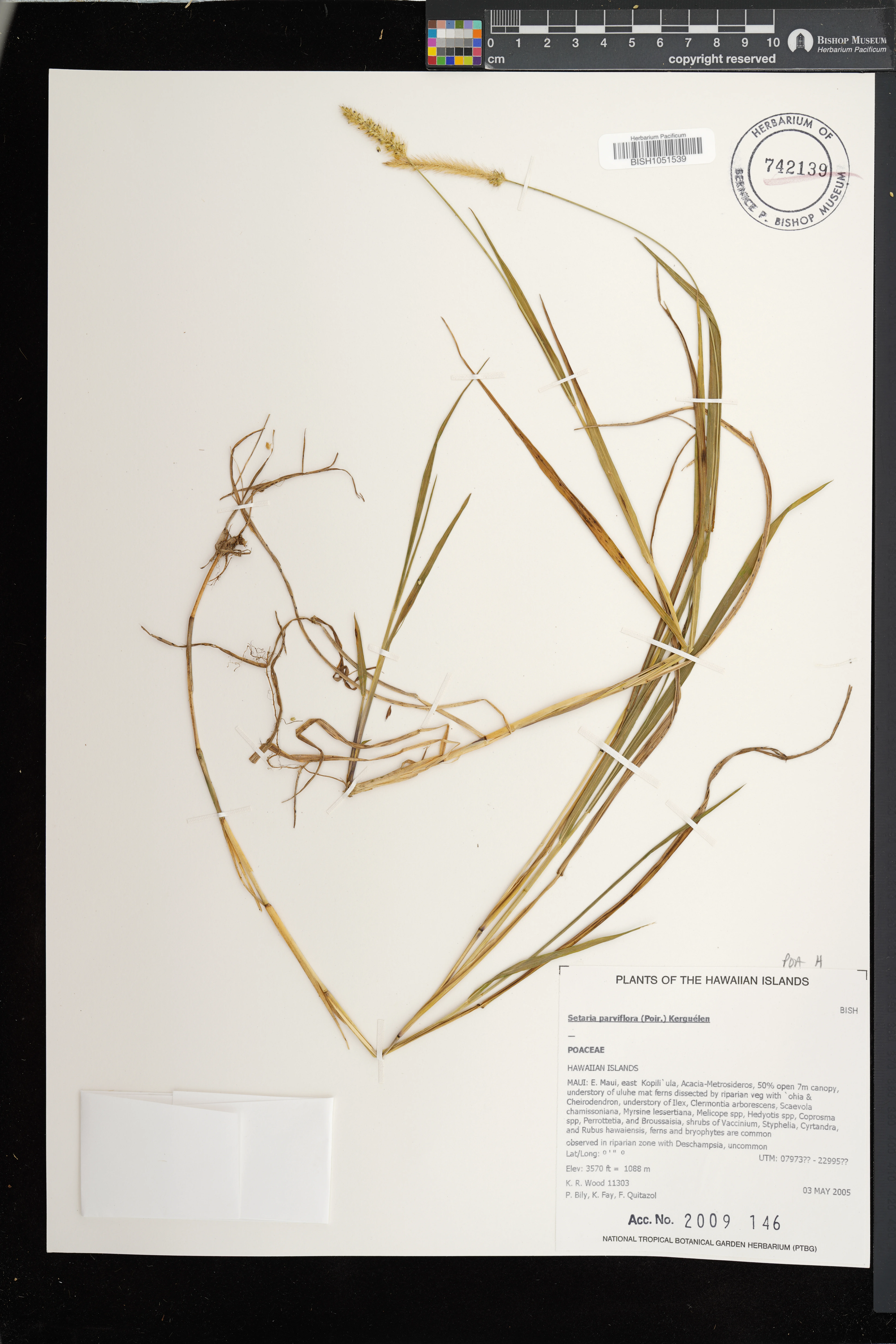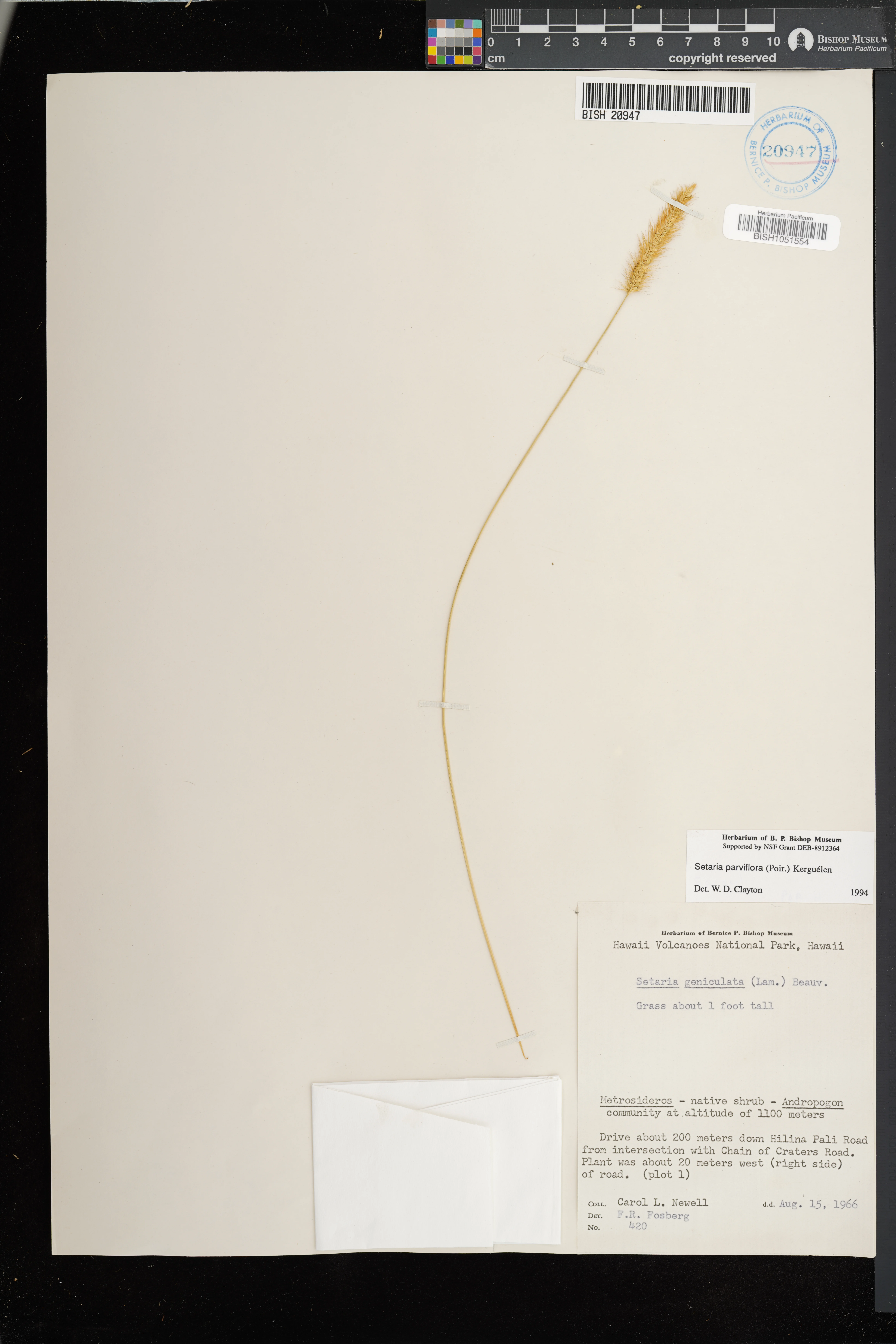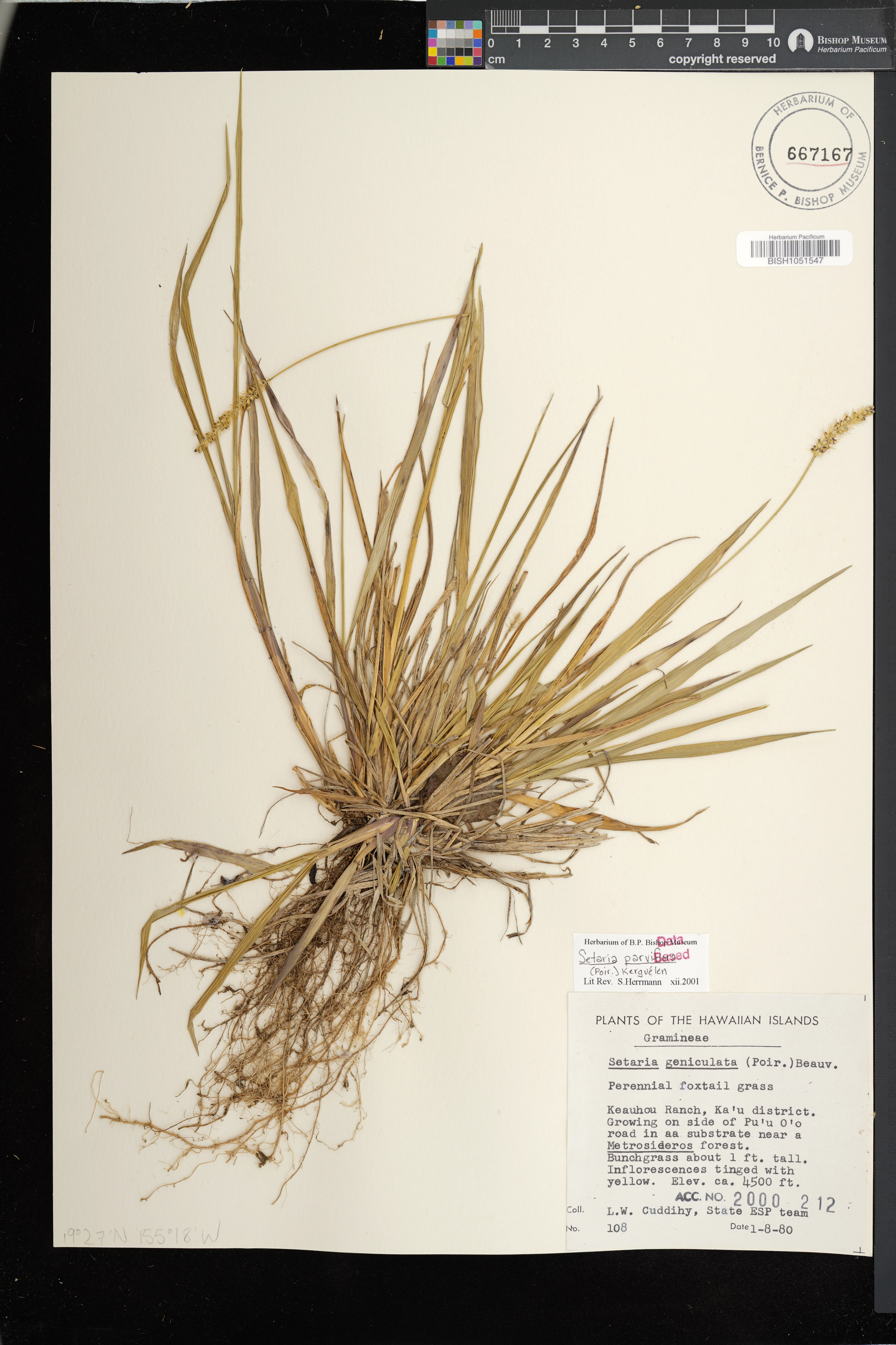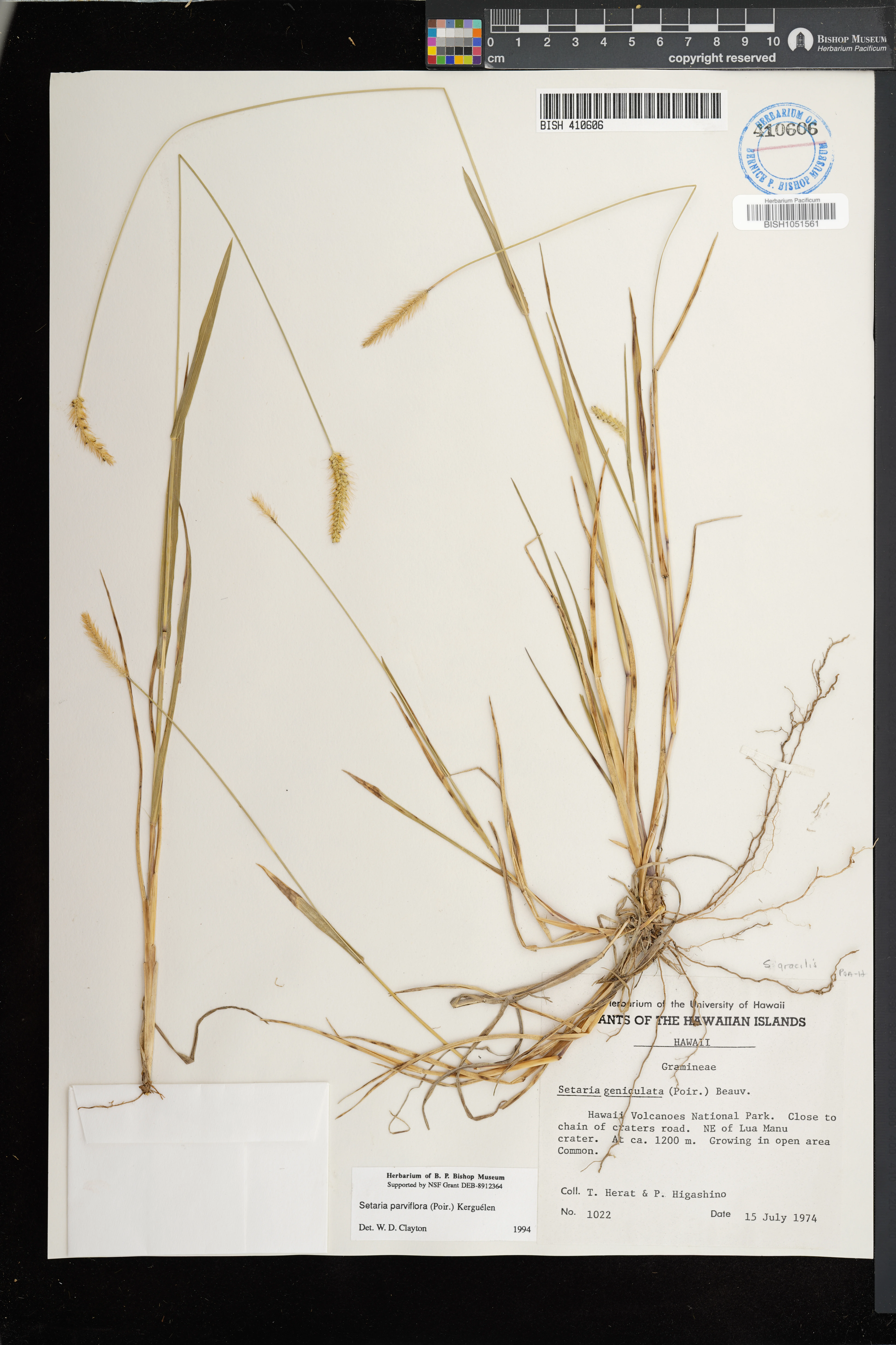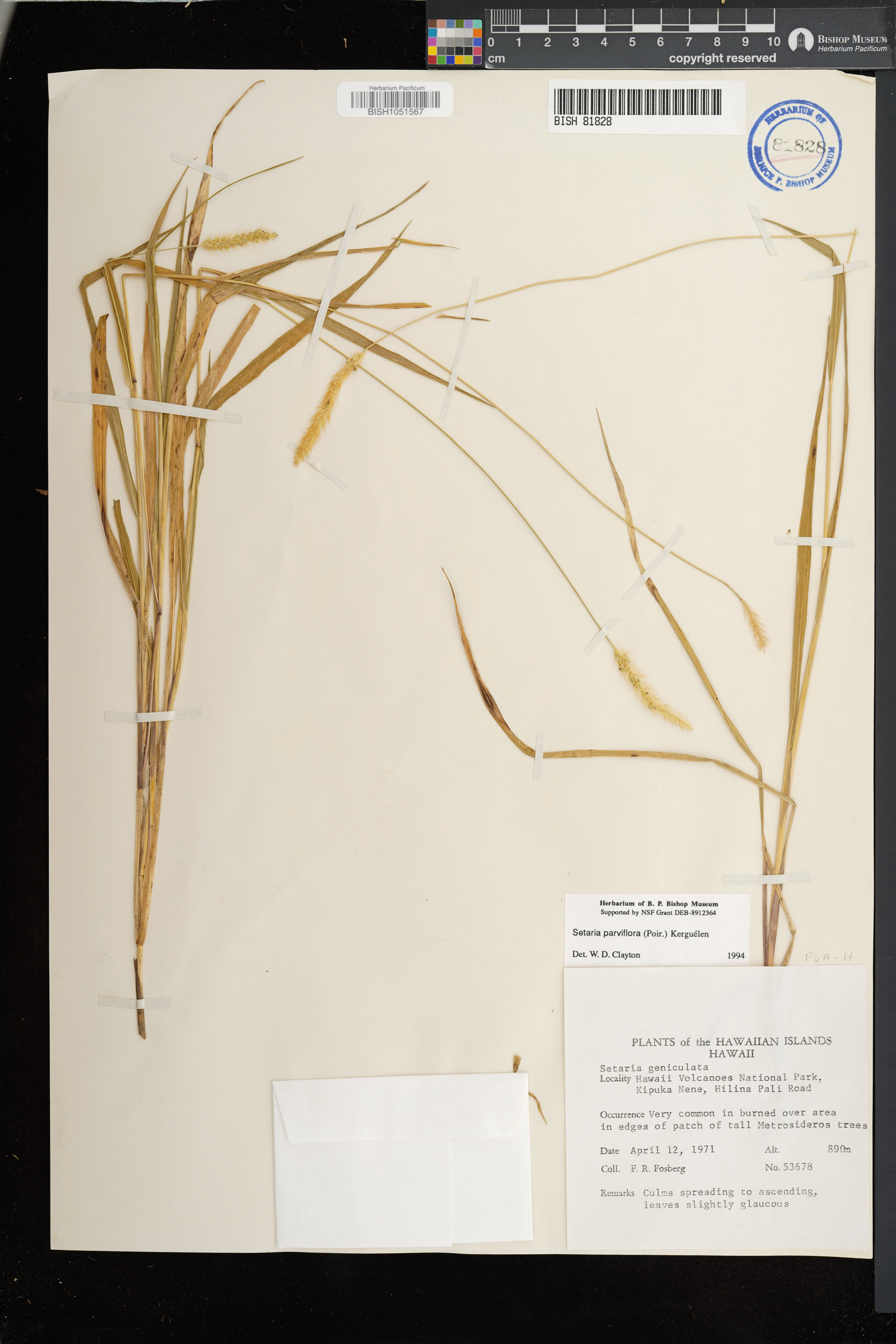 The plant was growing in the experimental tree planting site on the side of the Puna Trail. The soil in the area is crushed lava or cinder. The grass was growing in an area that is exposed to direct sunlight. |