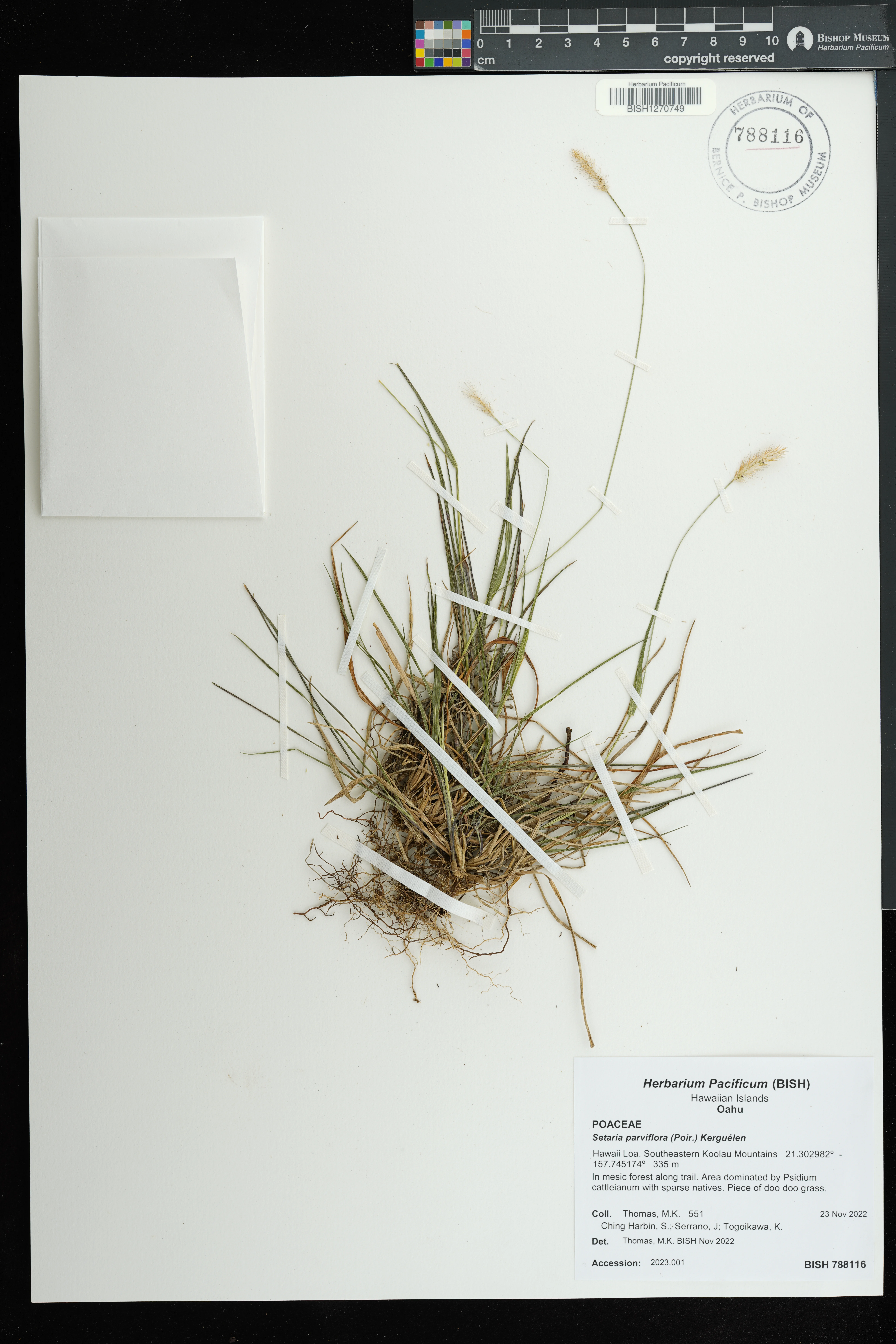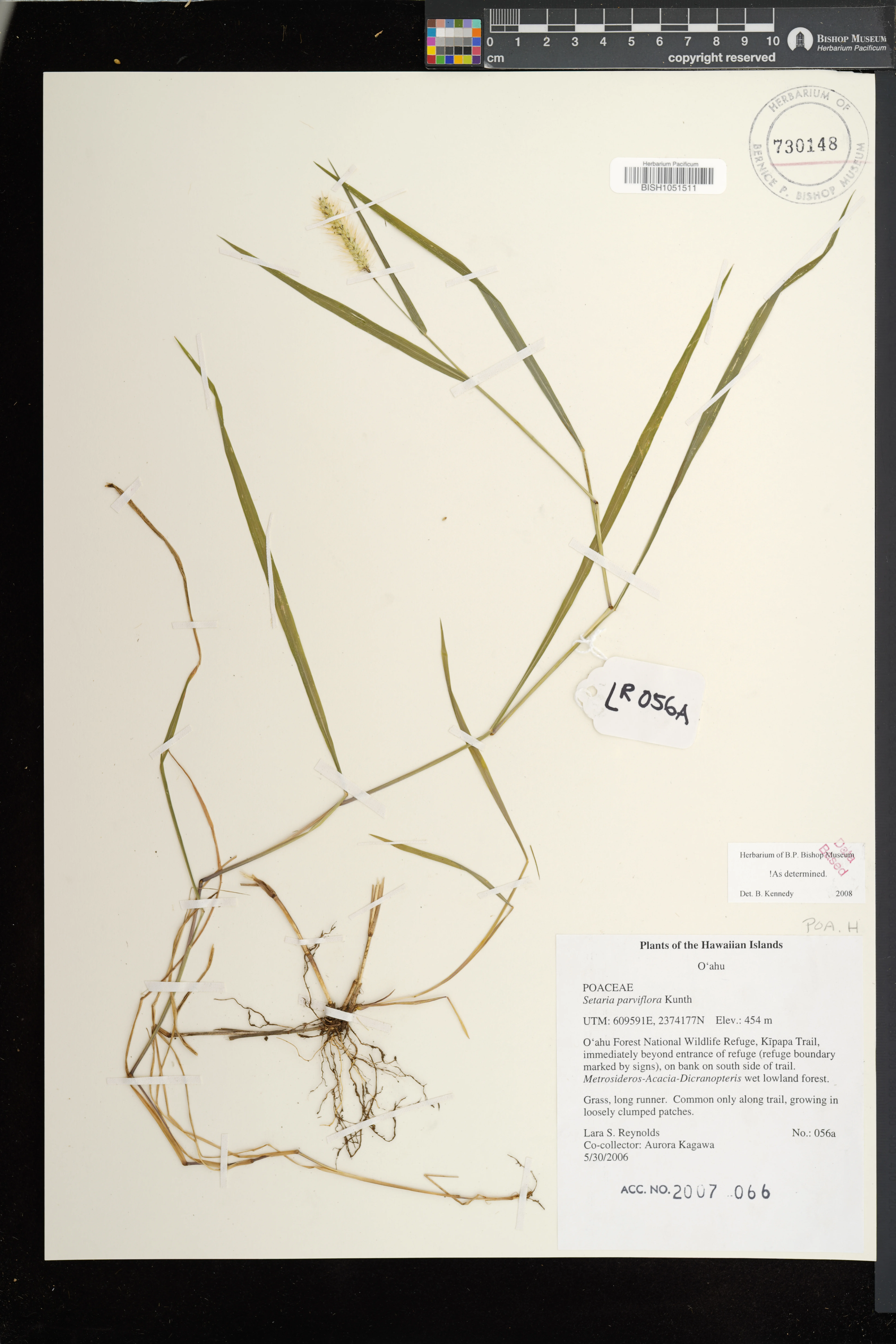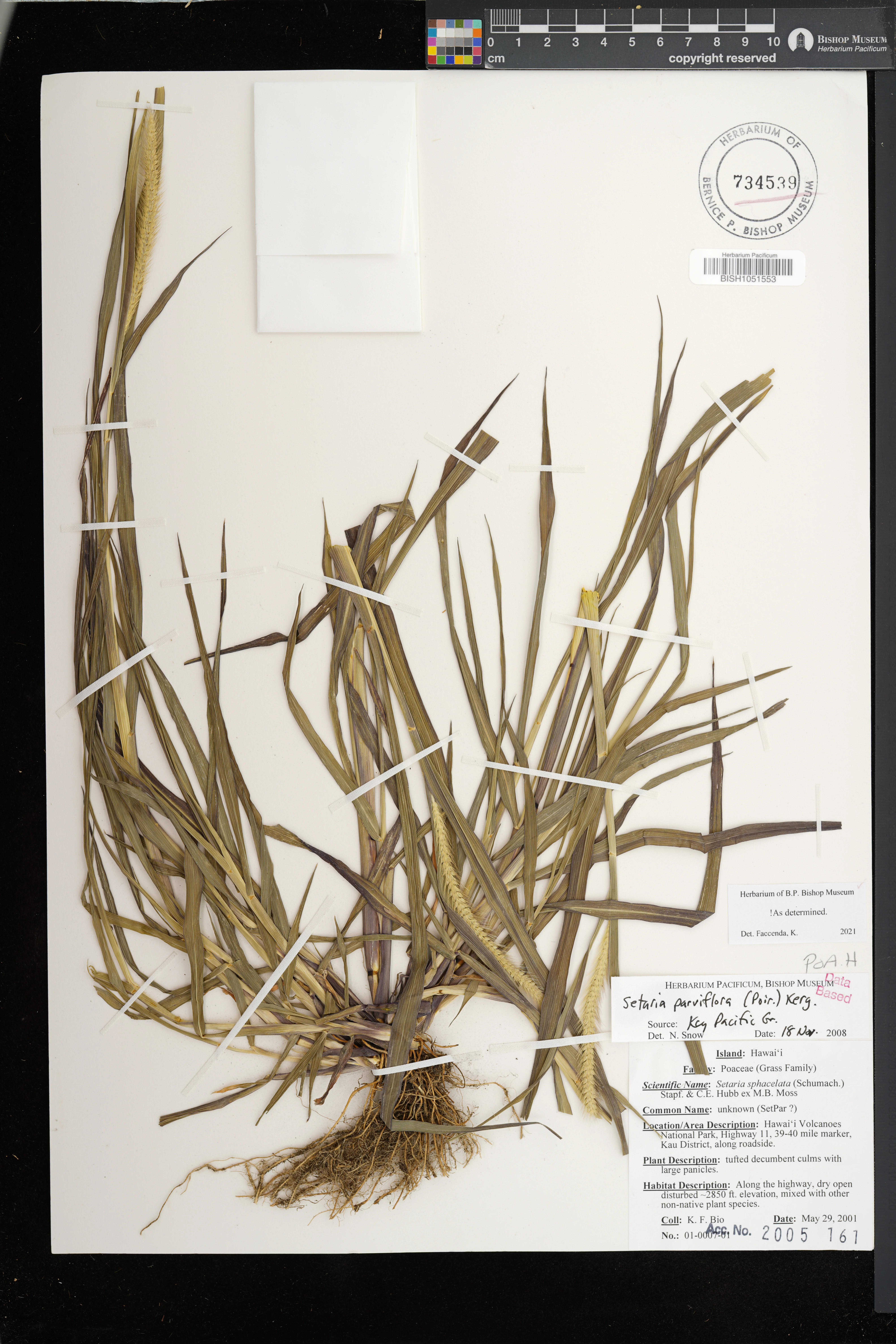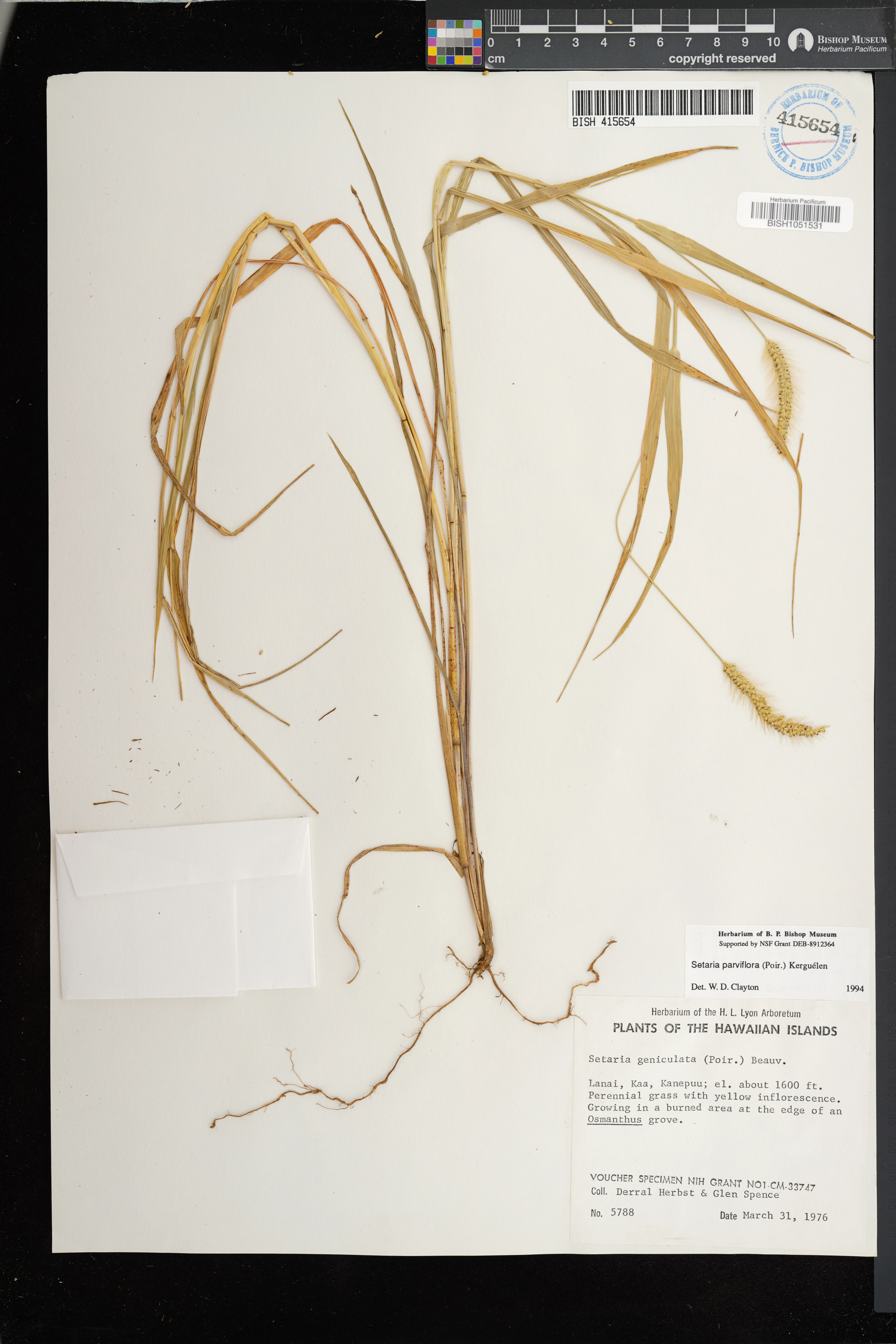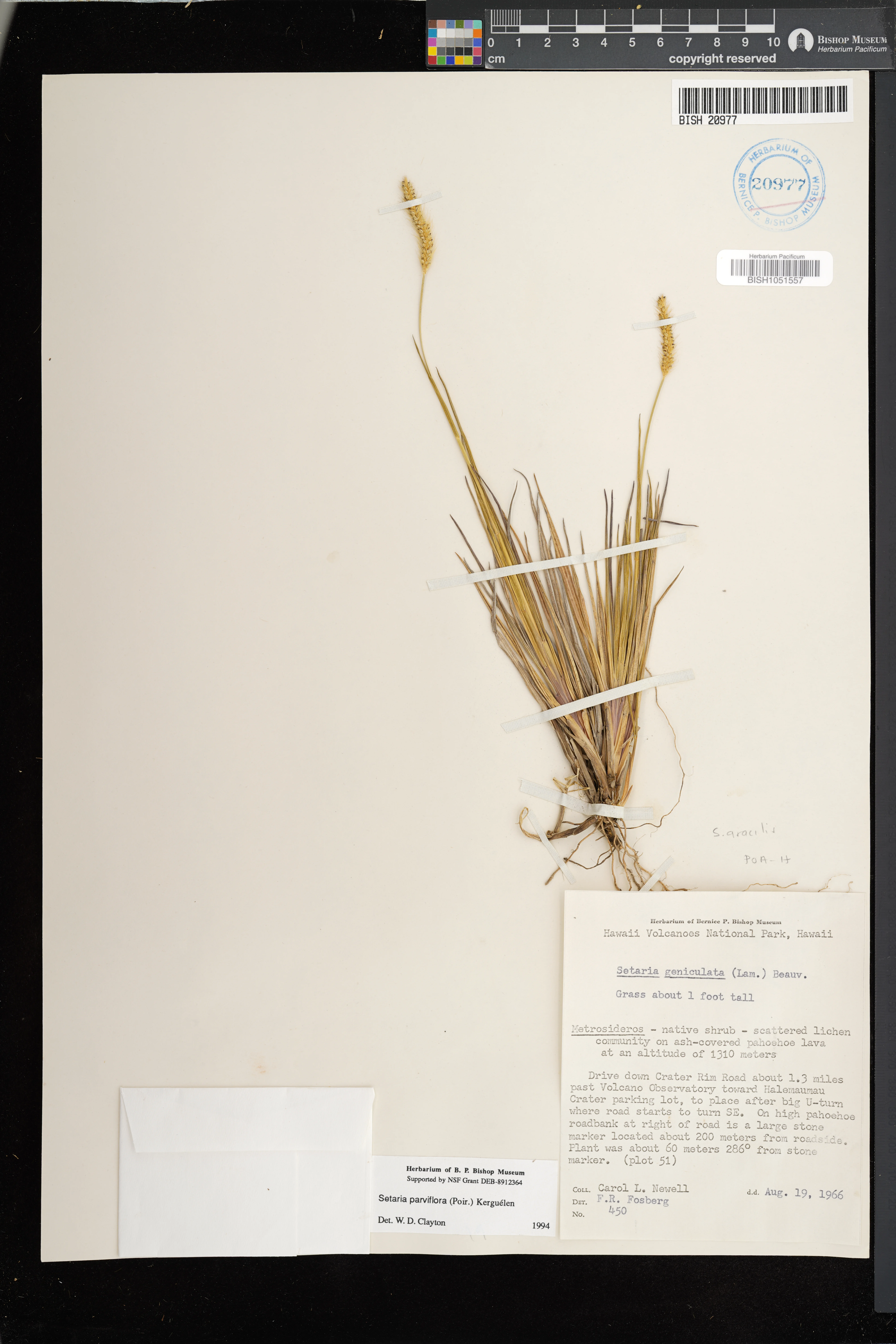 The plant was growing in the experimental tree planting site on the side of the Puna Trail. The soil in the area is crushed lava or cinder. The grass was growing in an area that is exposed to direct sunlight. |