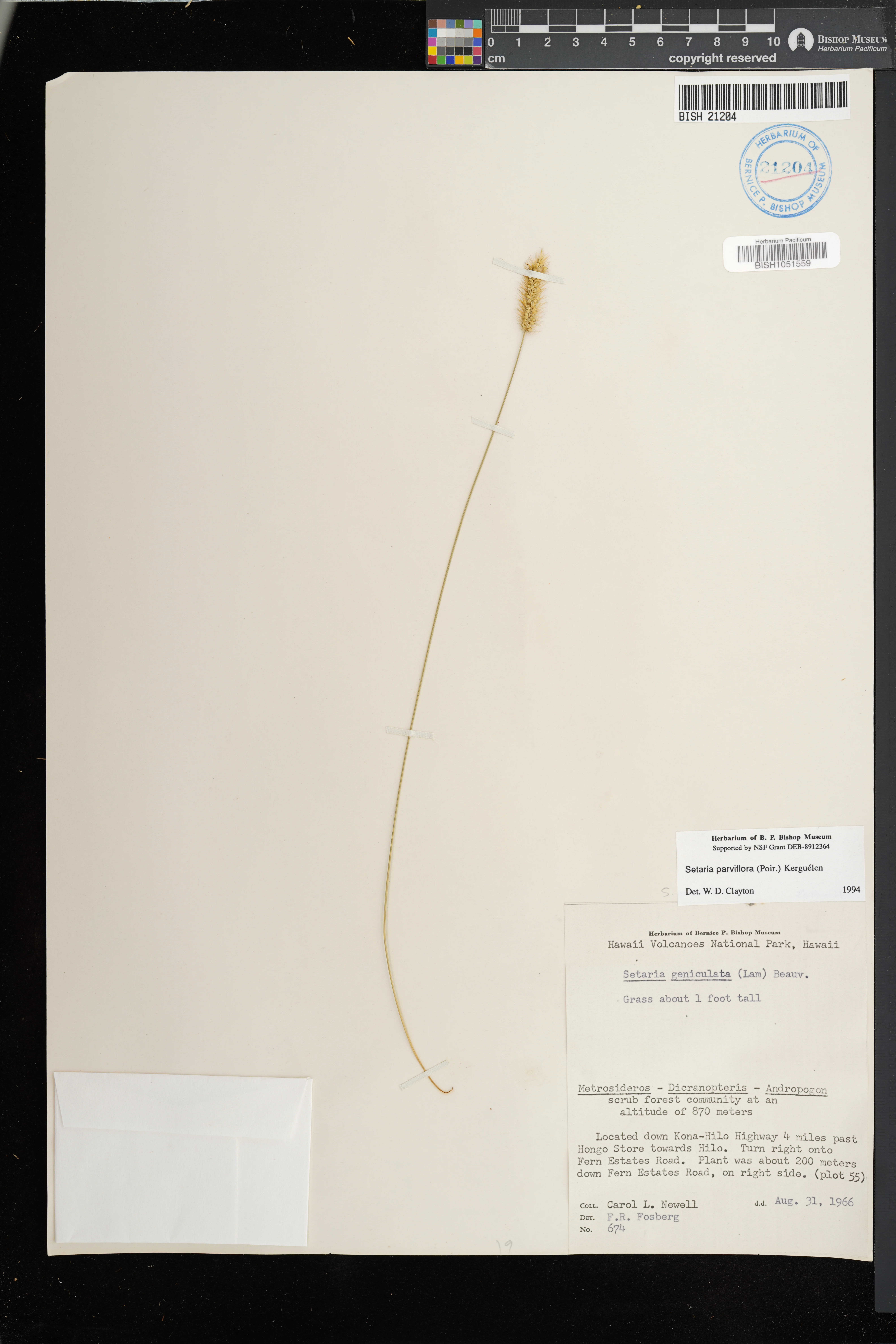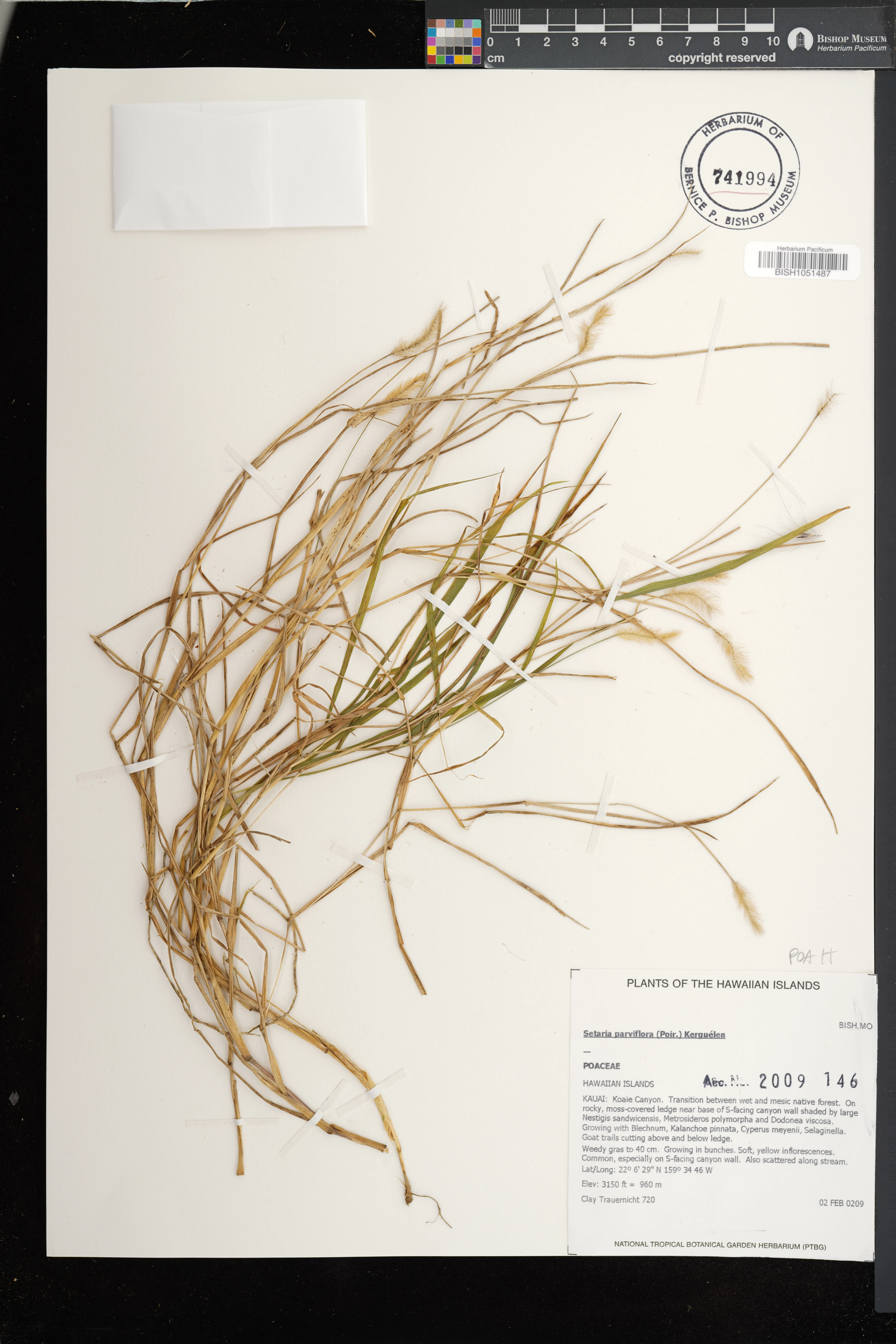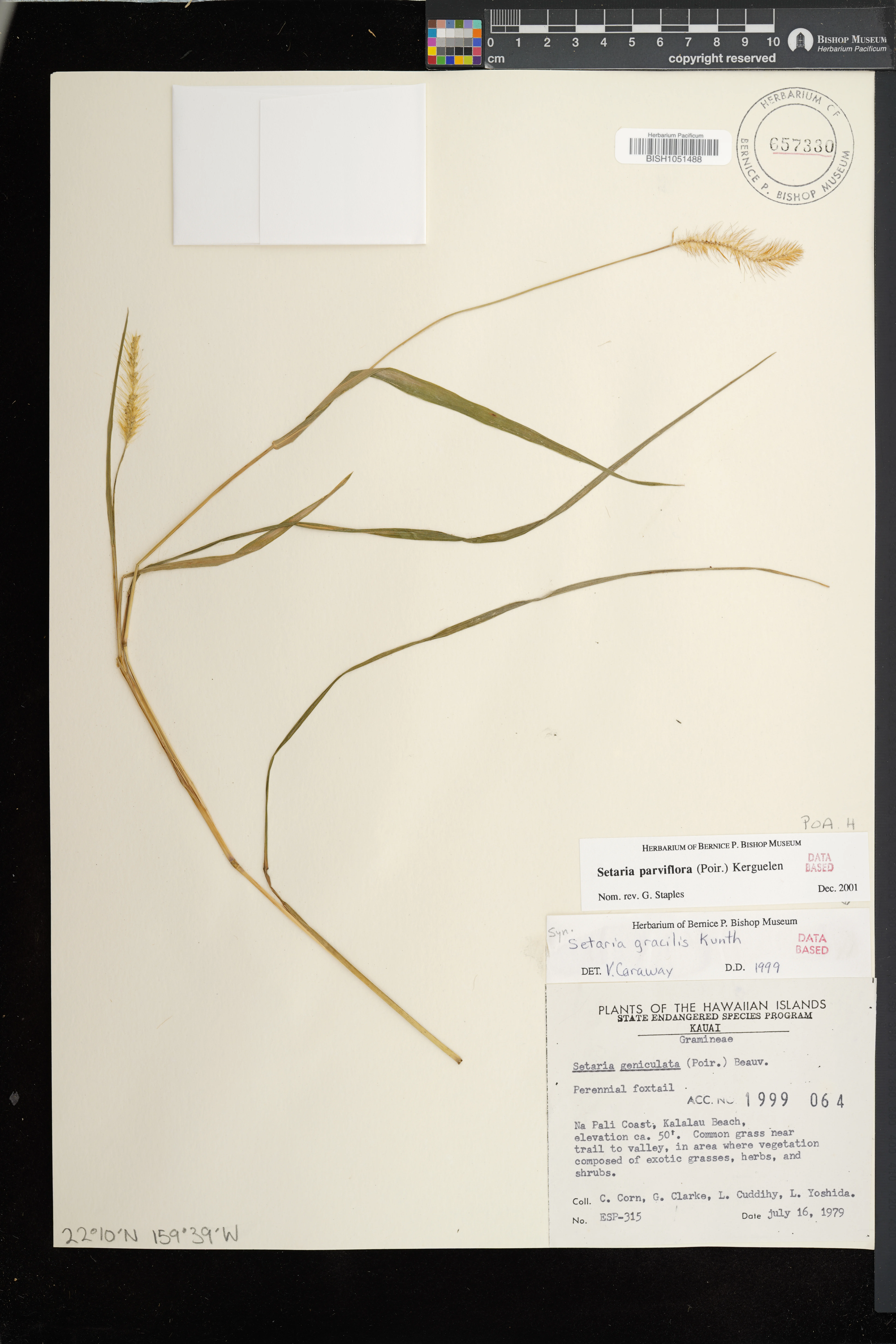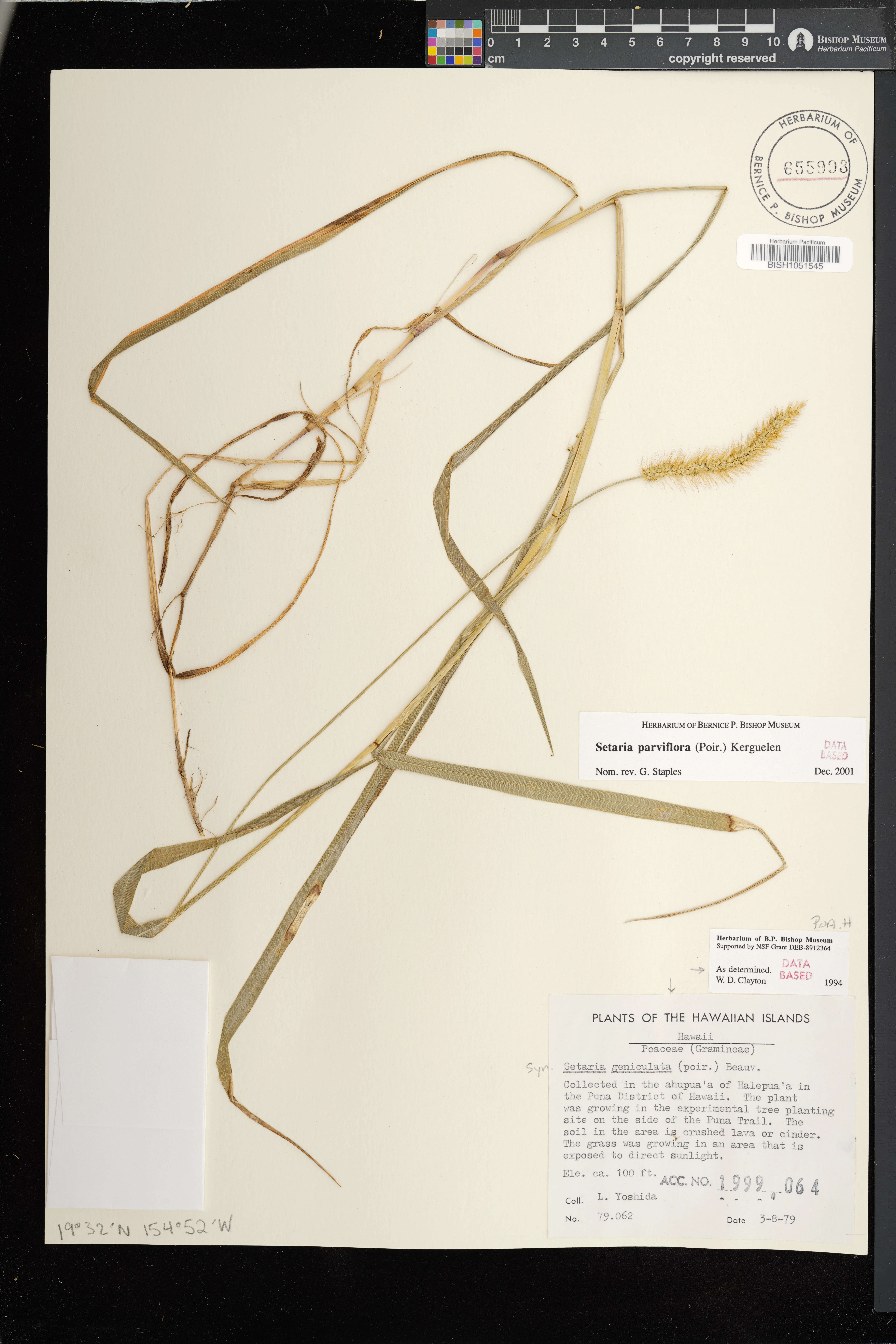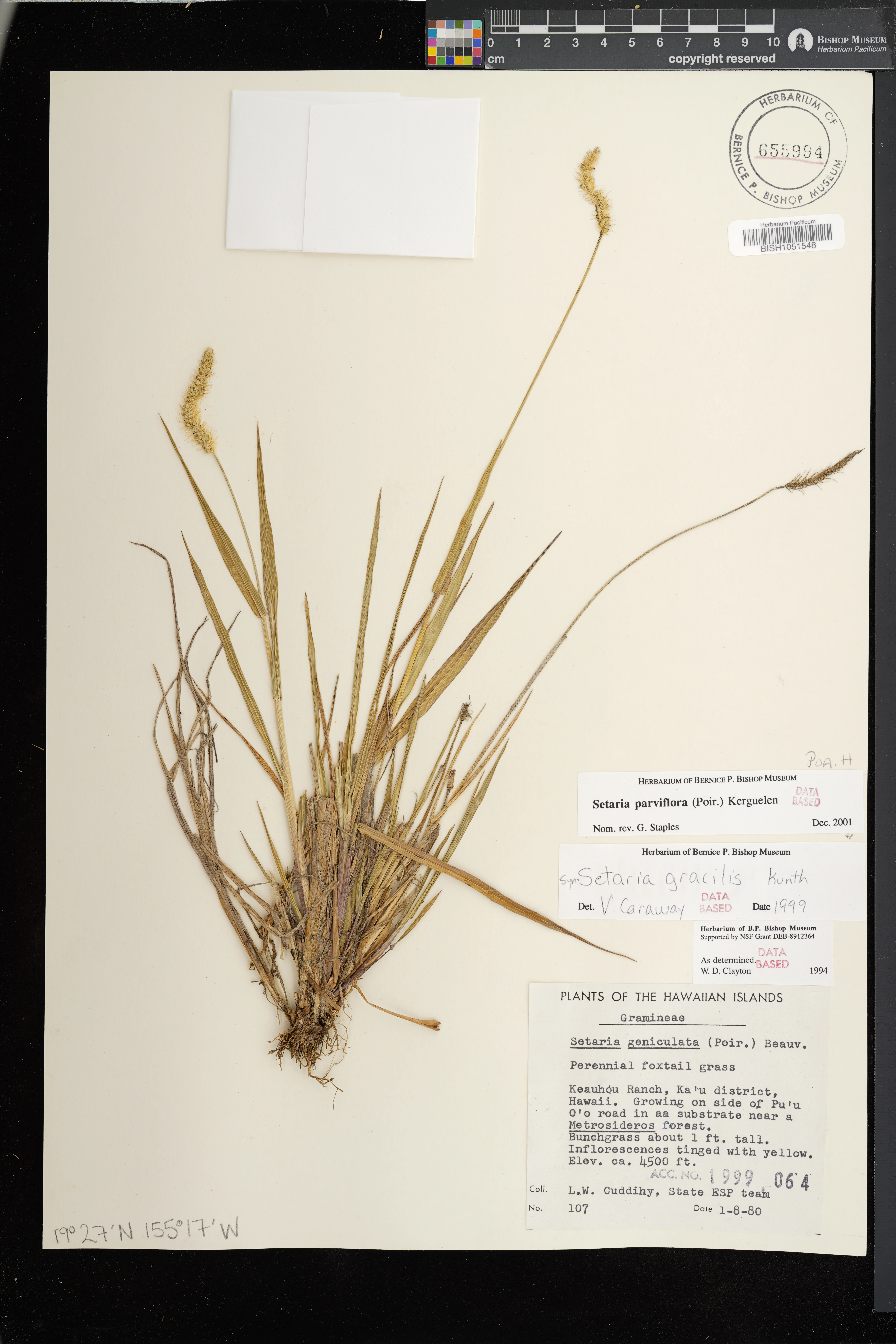 The plant was growing in the experimental tree planting site on the side of the Puna Trail. The soil in the area is crushed lava or cinder. The grass was growing in an area that is exposed to direct sunlight. |