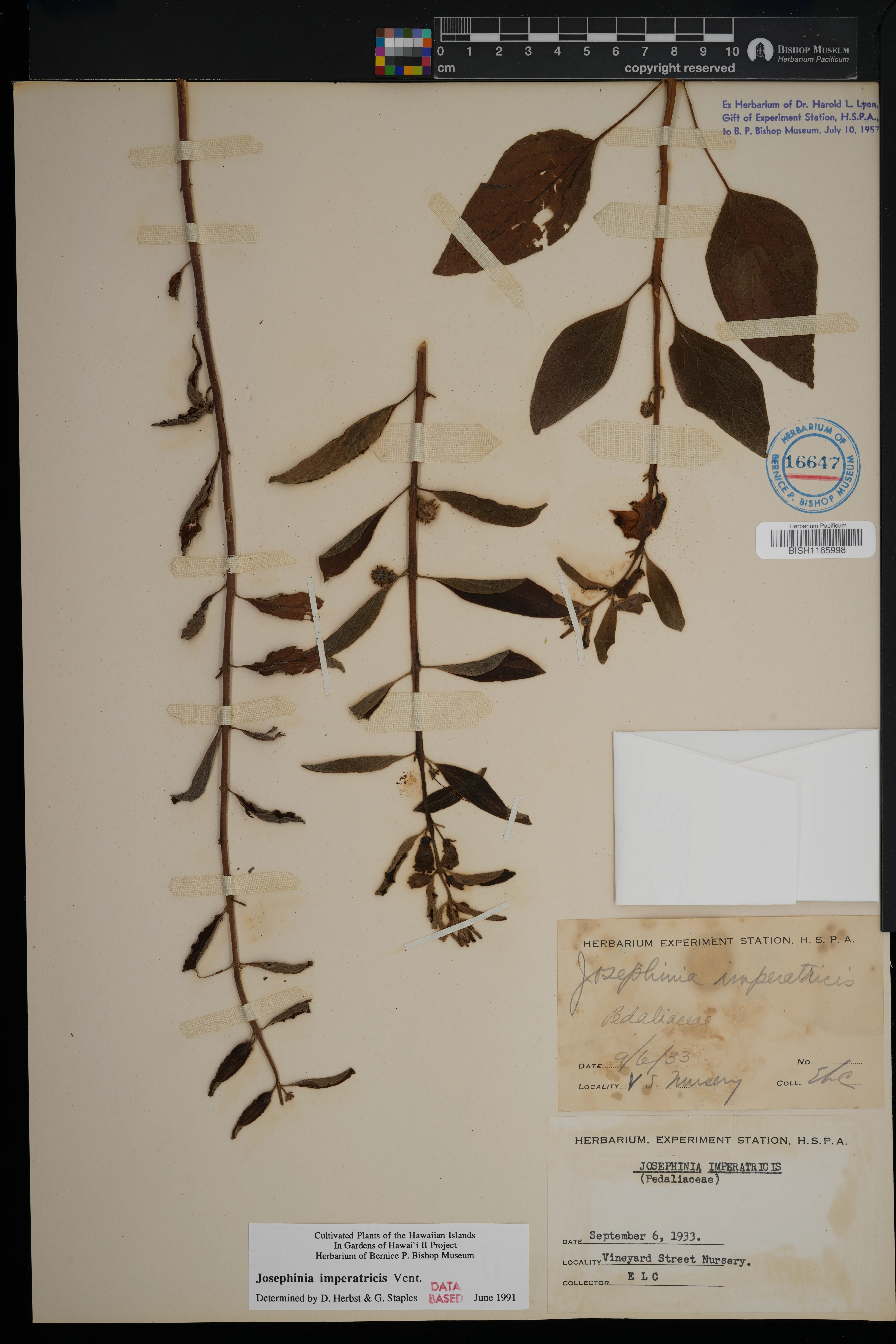 | 1 | Sesamum imperatricis | (Vent.) Byng & Christenh. | Honolulu; Vineyard Street Nursery | PRESERVED_SPECIMEN | Caum, E.L. | s.n. | Oahu | BISH | 9/6/1933 | |