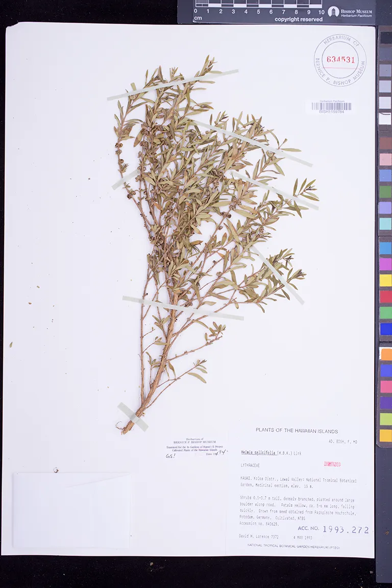 | 2 | Heimia salicifolia | Link | koloa, lawai, ntbg, medicinal section | On hull of vessel "Bandiu" | PRESERVED_SPECIMEN | flynn, t. | collector number: 3479 | Oahu | BISH | 7/25/1989 |