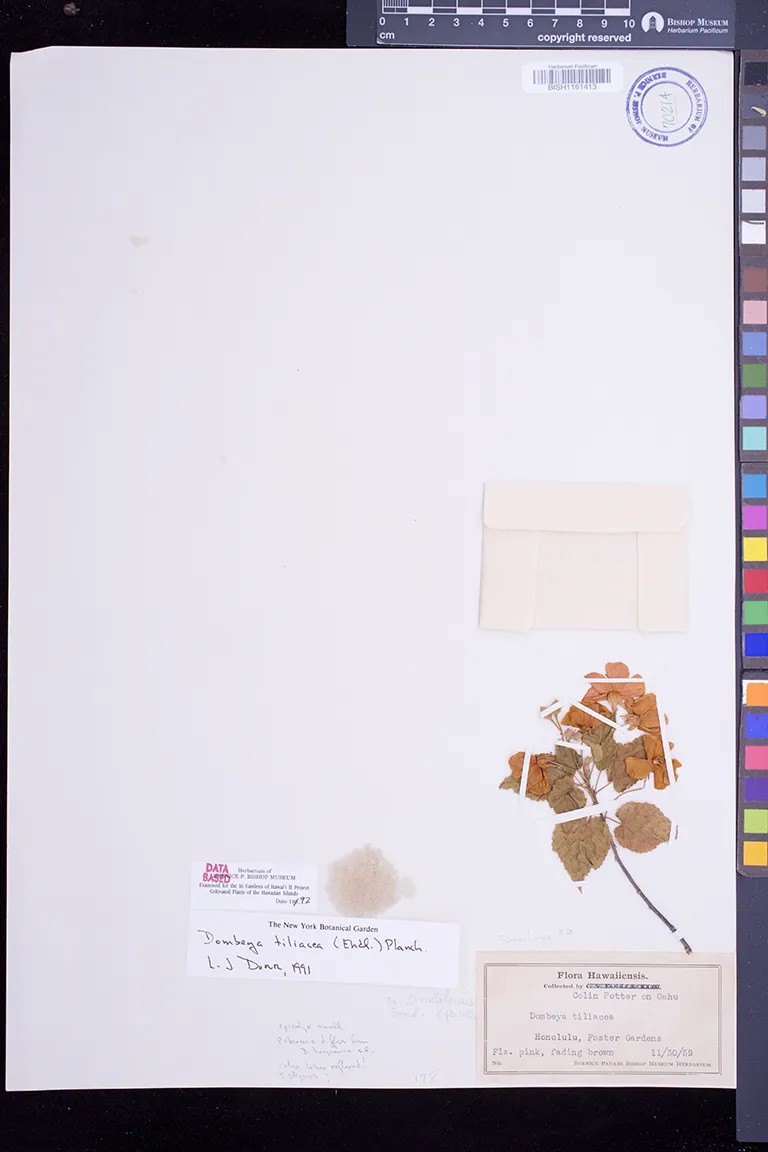 1 Dombeya tiliacea (Endl.) Planch. honolulu, foster gardens Metrosideros-Cheirodendron forest with high water table. On shaded rock bank. PRESERVED_SPECIMEN potter, c. Maui BISH 11/30/1959