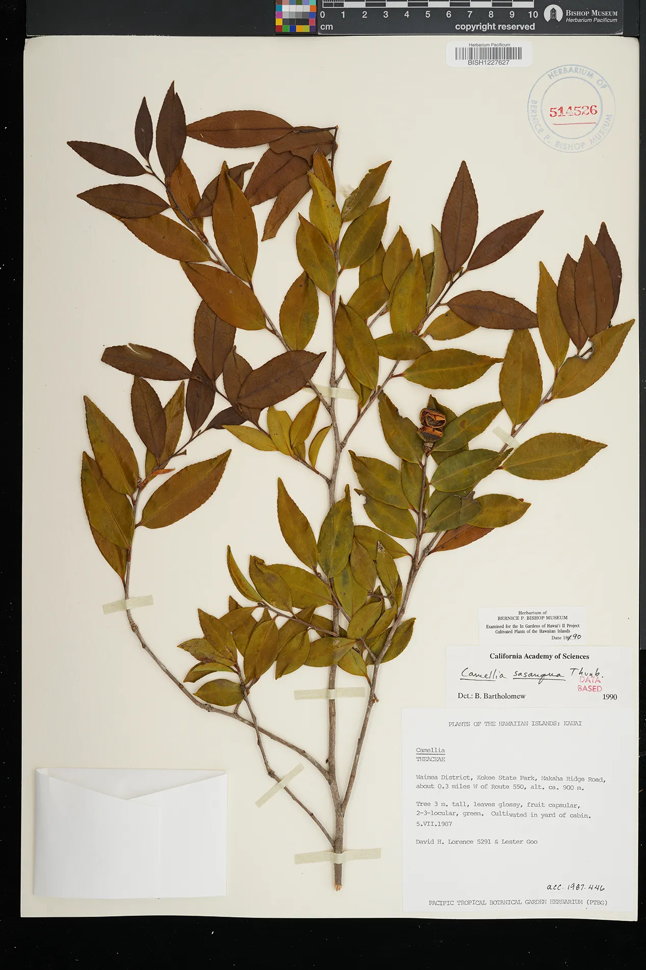 | 7 | Camellia sasanqua | Thunb. | waimea district, kokee state park, makaha ridge road, about 0.3 miles w of route 550 | PRESERVED_SPECIMEN | lorence, d.h. goo, l. | collector number: 5291 | Hawaii | BISH | 7/5/1987 | |