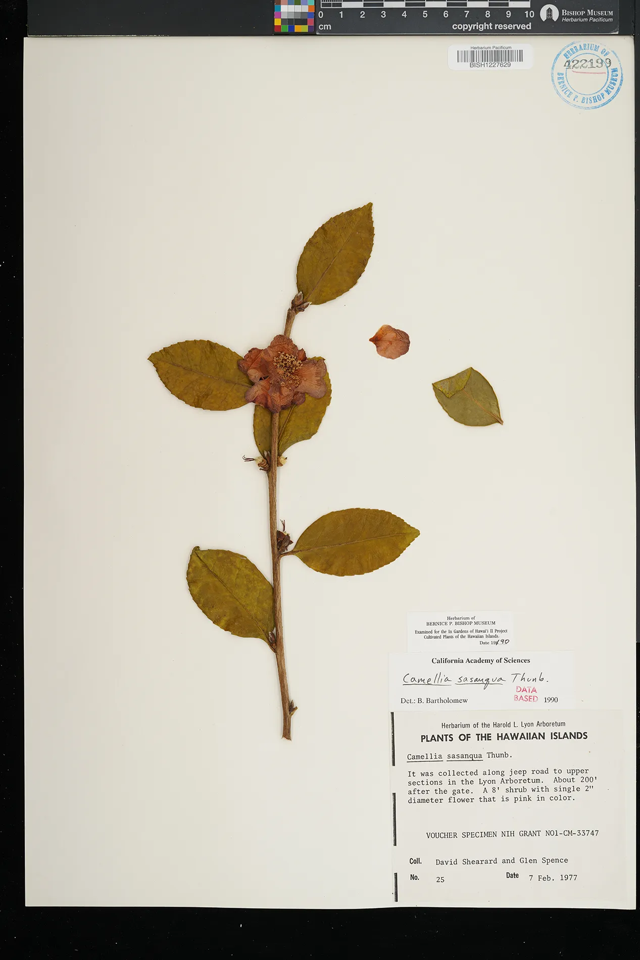 | 3 | Camellia sasanqua | Thunb. | Honolulu: Manoa Valley; Lyon Arboretum | It was collected along jeep road to upper sections in the Lyon arboretum. About 200' after the gate. | PRESERVED_SPECIMEN | Shearard, D.A. | 25 | Oahu | BISH | 2/7/1977 |