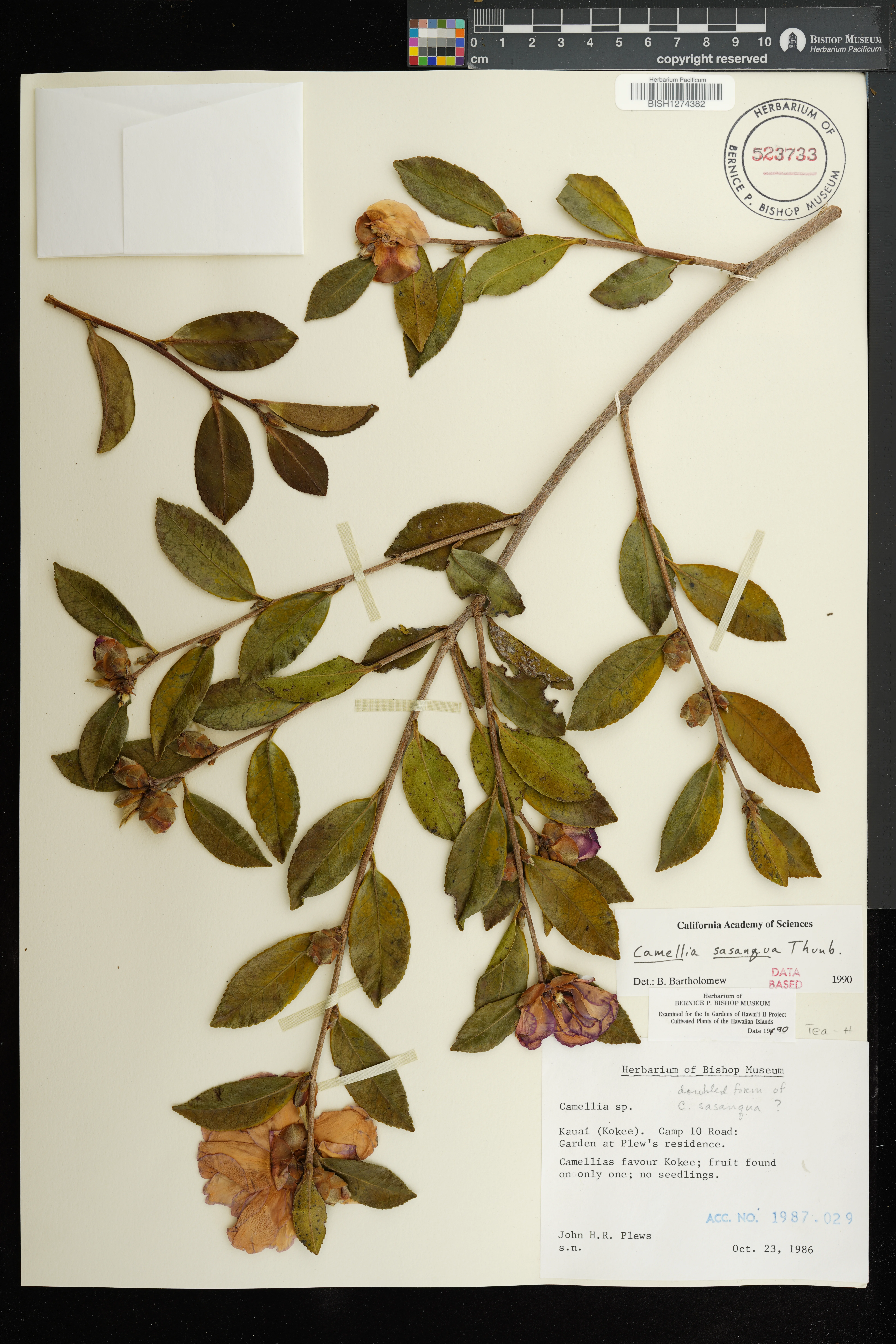 | 11 | Camellia sasanqua | Thunb. | Kokee Camp 10 Road: Garden at Plew's residence | PRESERVED_SPECIMEN | Plews, J.H.R. | s.n. | Kauai | BISH | 10/23/1986 |
