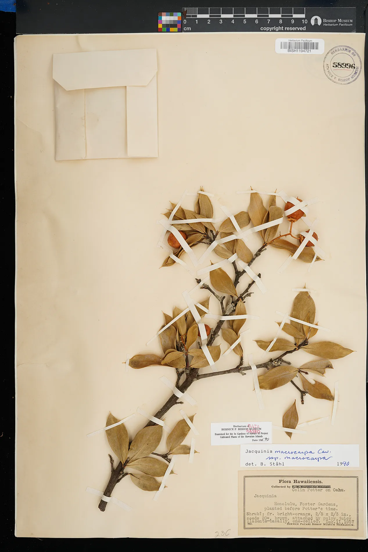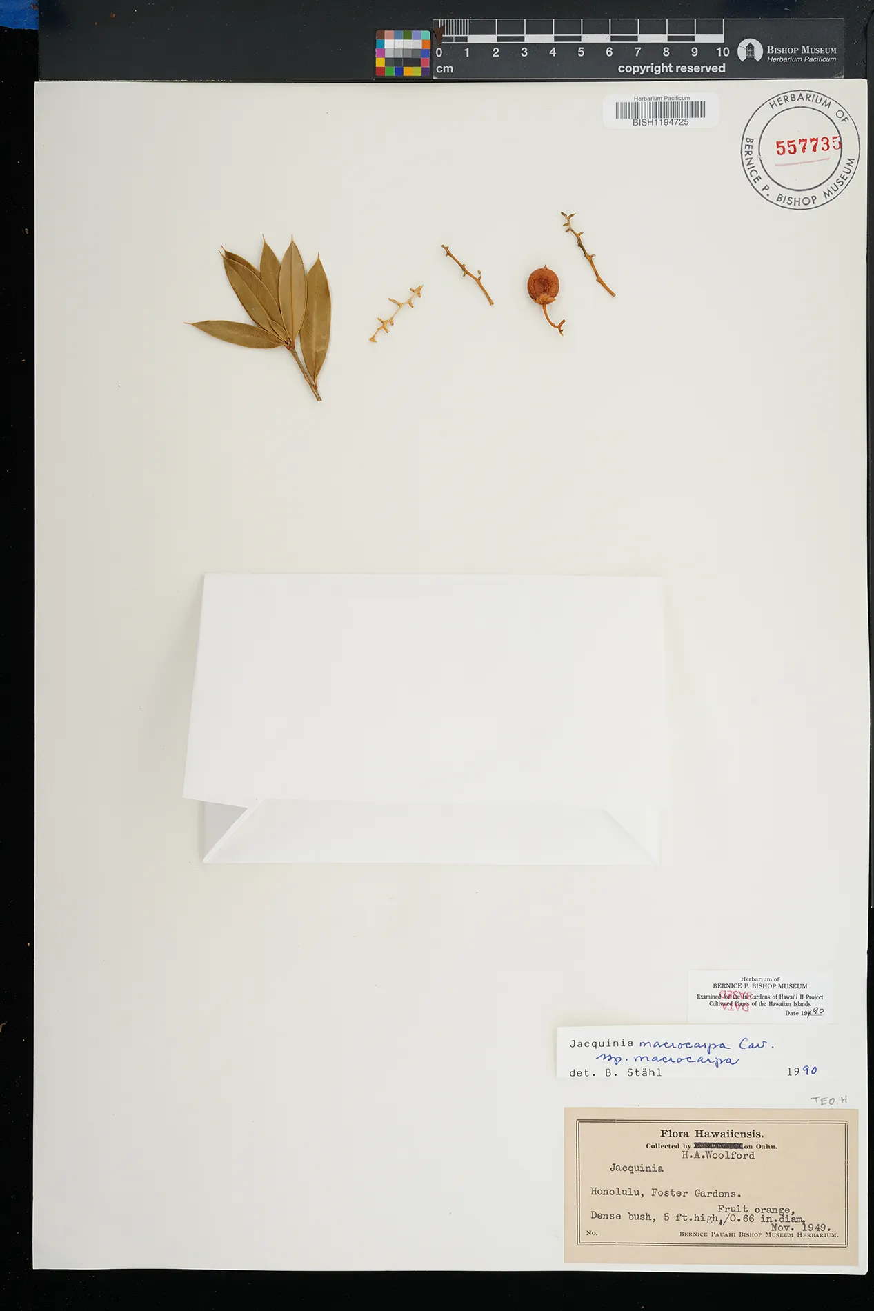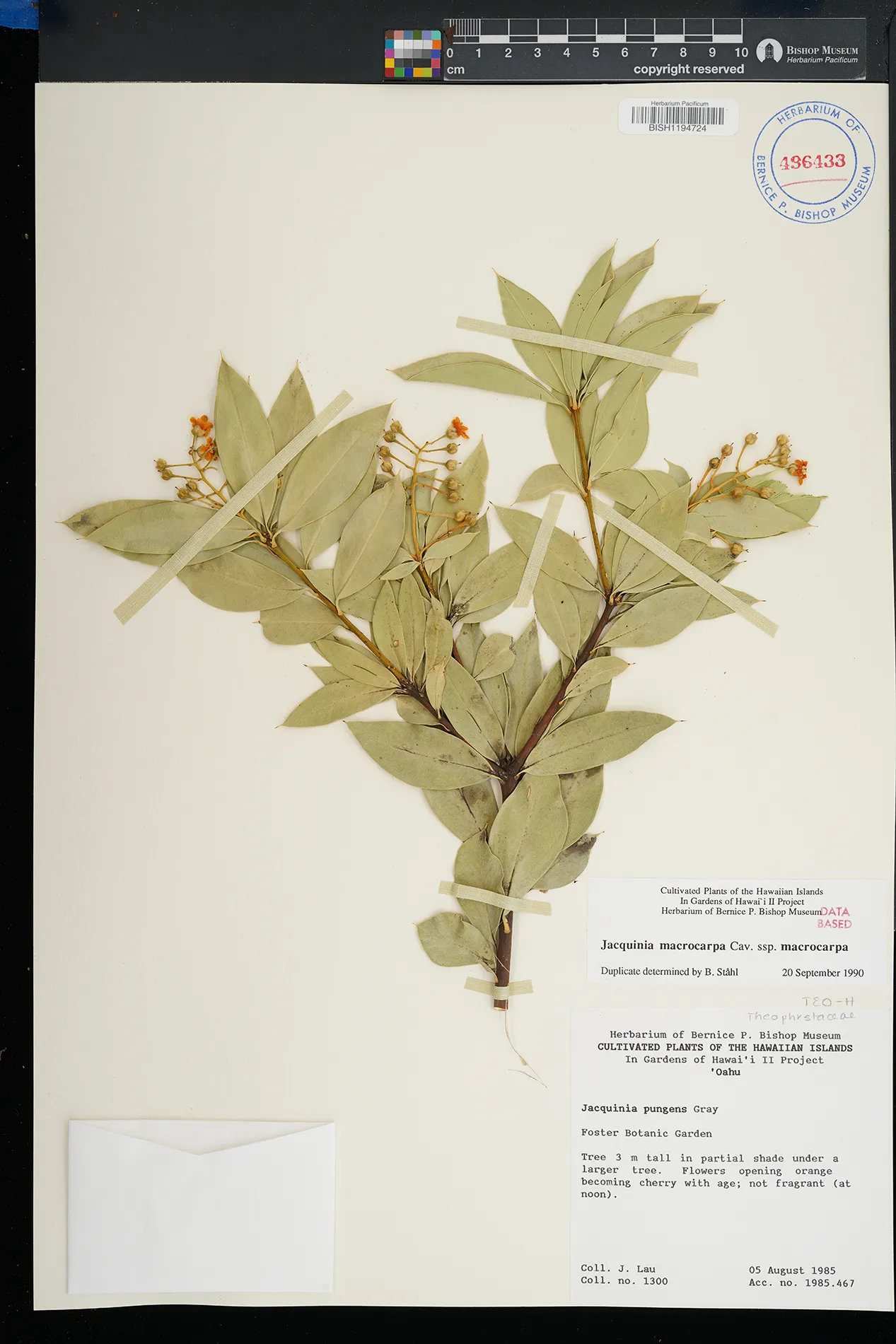 | 1 | Bonellia macrocarpa | (Cav.) B.Ståhl & Källersjö | Honolulu, Foster Gardens | PRESERVED_SPECIMEN | Potter, C. | s.n. | Oahu | BISH | 12/11/1957 | |