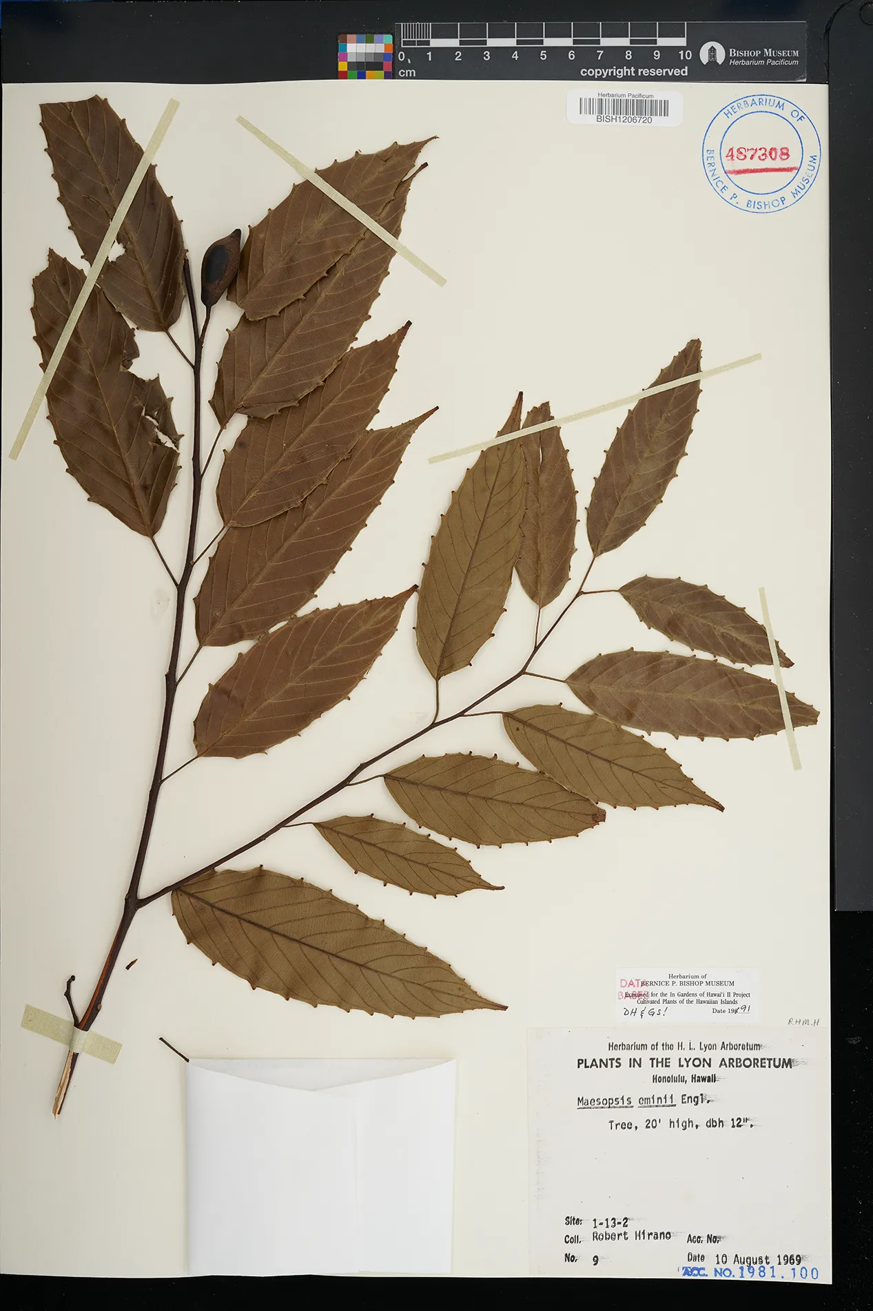 | 1 | Maesopsis eminii | Engl. | honolulu: manoa valley: lyon arboretum site 1-13-2 | PRESERVED_SPECIMEN | hirano, r. | collector number: 9 | Oahu | BISH | 8/10/1969 | |