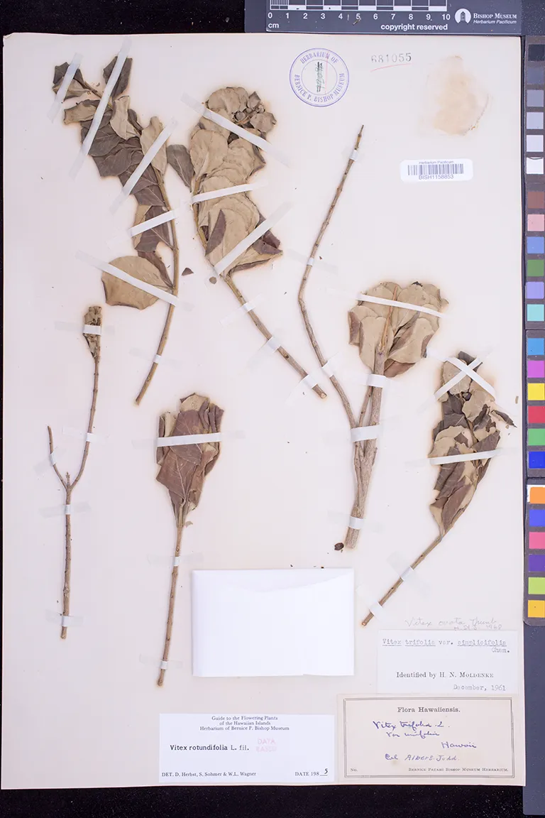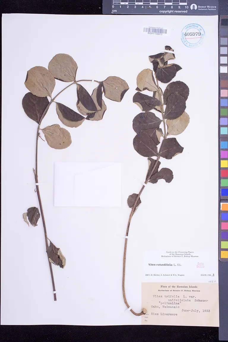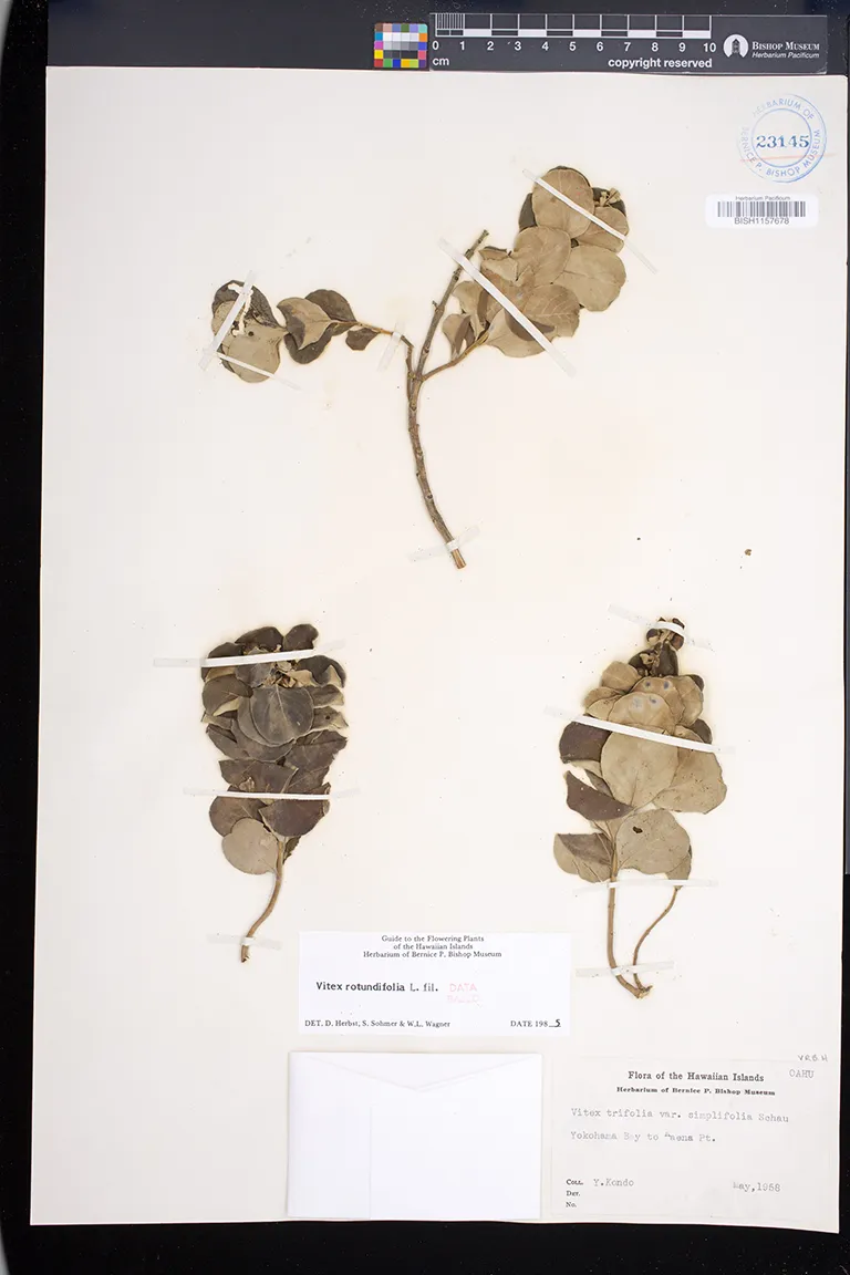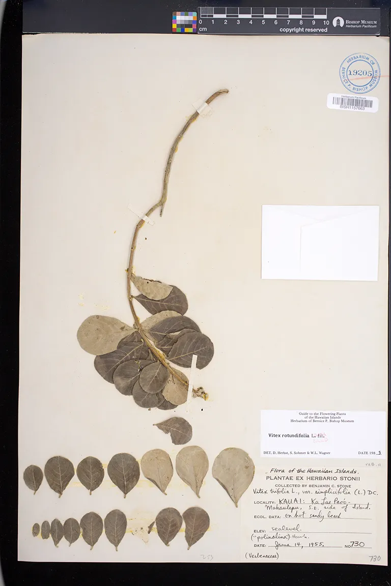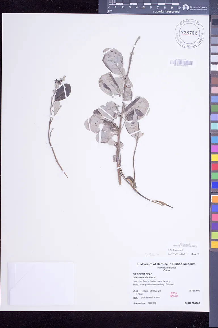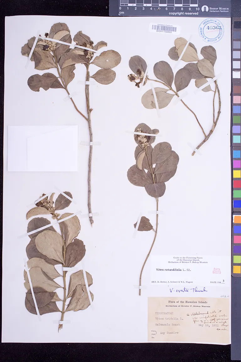 • Vitex rotundifolia can be grown from cuttings taken when the plants are not in flower or fruit. NTBG recommends tip cuttings 4 inches long with at least 2 nodes and removing the leaves from the cuttings. Criley notes that they should be non-flowering terminals.