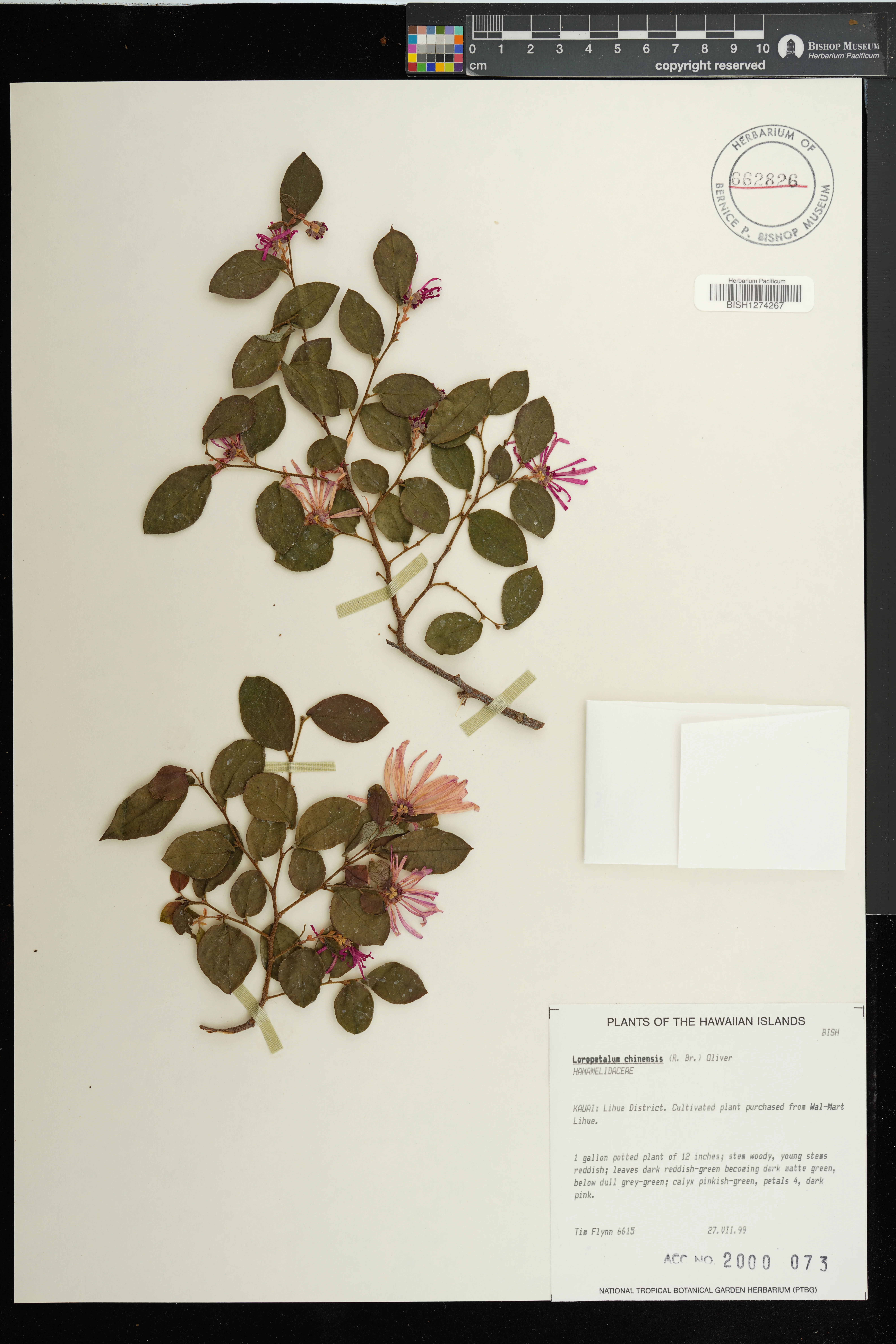 | 3 | Loropetalum chinense | (R.Br.) Oliv. | Cultivated plant purchased from Wal-Mart Lihue. | Cultivated. | PRESERVED_SPECIMEN | Tim Flynn | 6615 | Kauai | PTBG | 7/27/1999 |