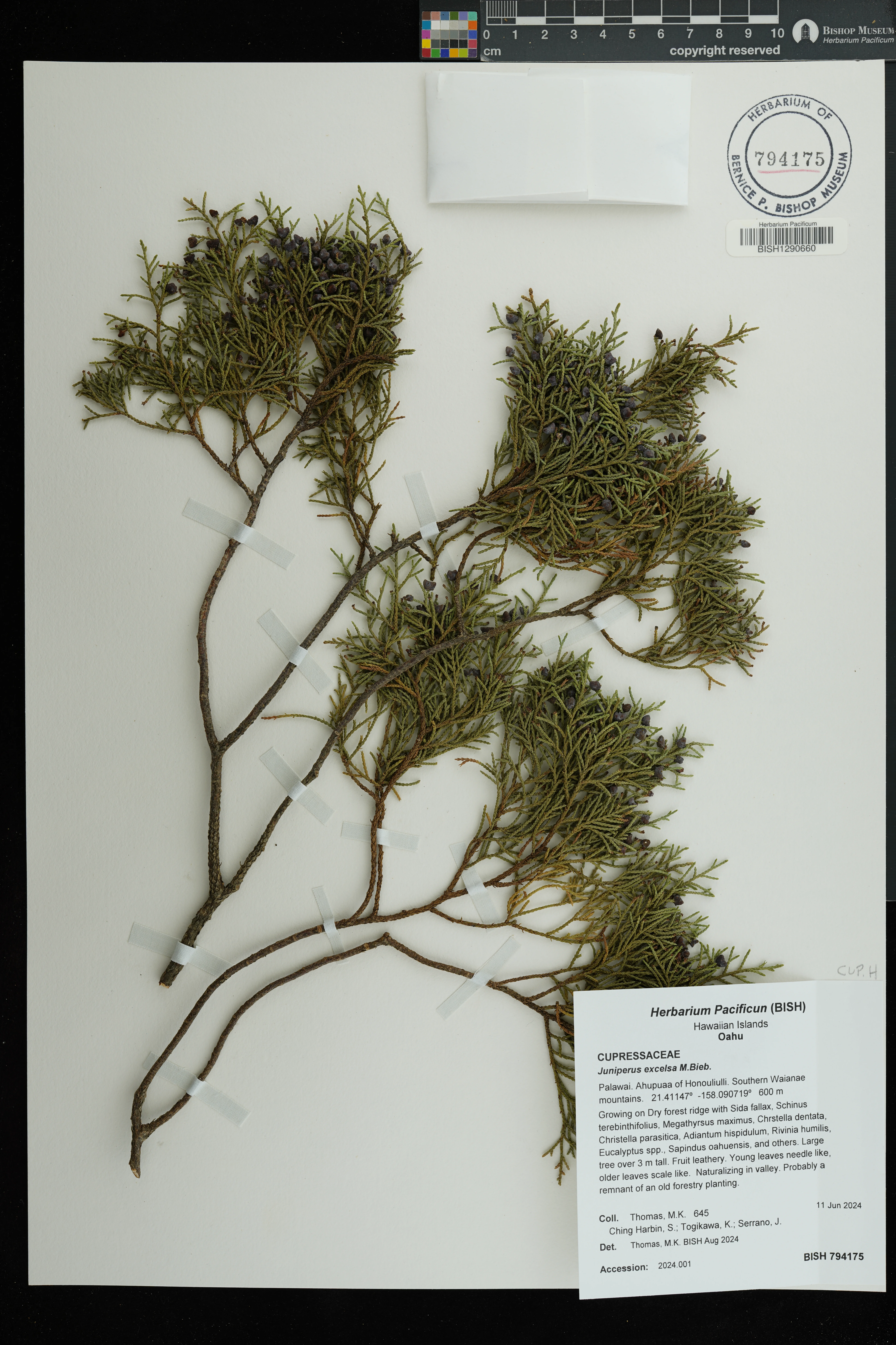 | 1 | Juniperus excelsa | M.Bieb. | Koele, on ridge just N of | PRESERVED_SPECIMEN | Herbst, D.R. | 5796 | Lanai | BISH | 3/31/1976 | |