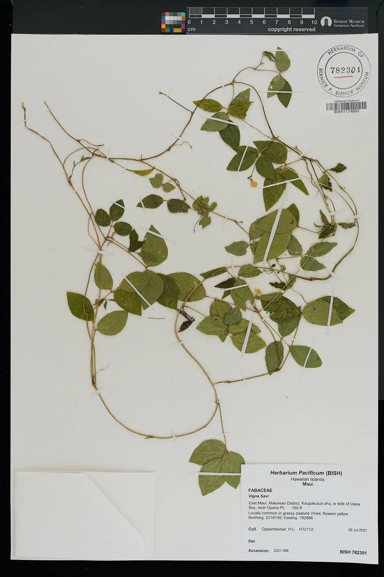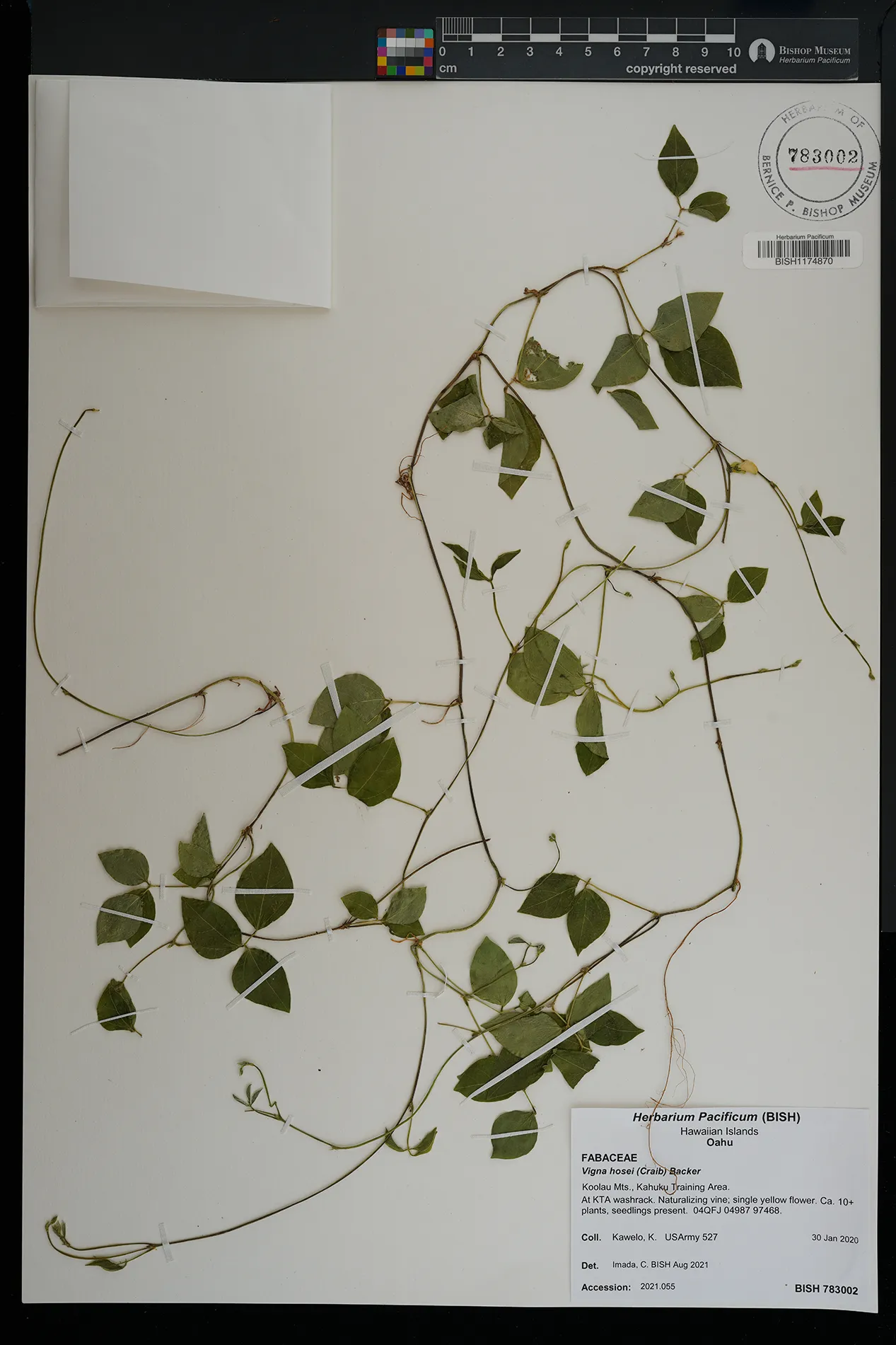| 4 | Vigna hosei | (Craib) Backer | Hilo, in field at low elevation. | Growing in disturbed area of field. | PRESERVED_SPECIMEN | Yoshida, L. | s.n. | Hawaii | BISH | 6/19/2006 |