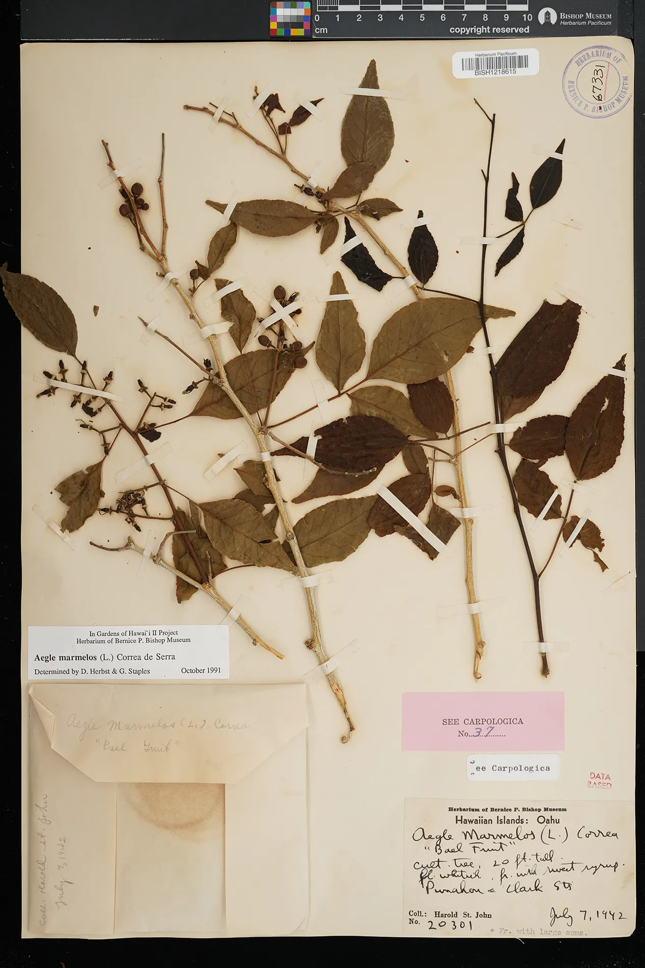 | 12 | Aegle marmelos | (L.) Corrêa | Honolulu, Punahou and Clark Sts. | PRESERVED_SPECIMEN | St. John, H. | 20301 | Oahu | BISH | 7/1/1942 | |
