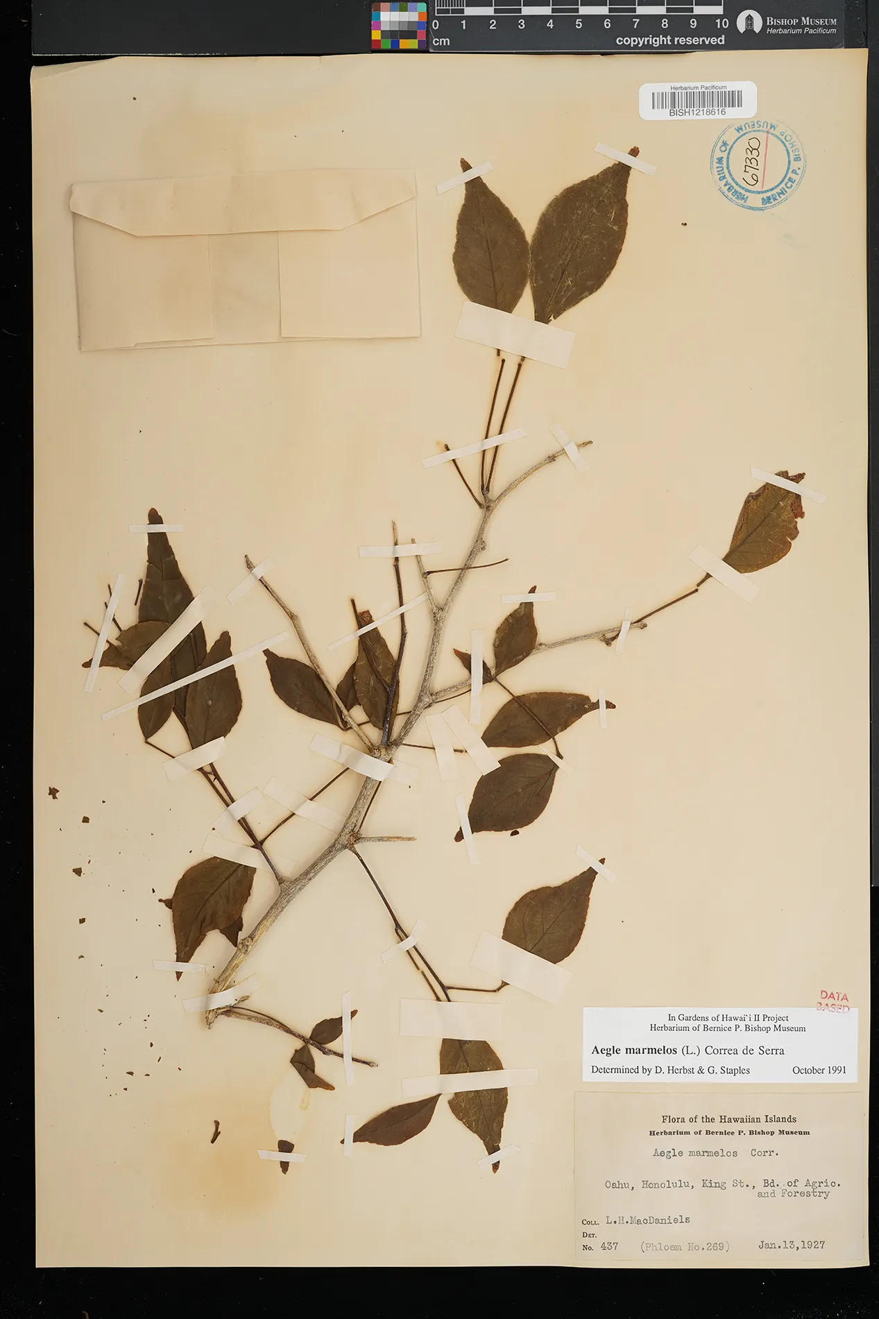| 11 | Aegle marmelos | (L.) Corrêa | King St., Bd. of Agric. and Forestry, Honolulu | PRESERVED_SPECIMEN | MacDaniels, L.H. | 437 | Oahu | BISH | 1/13/1927 | |