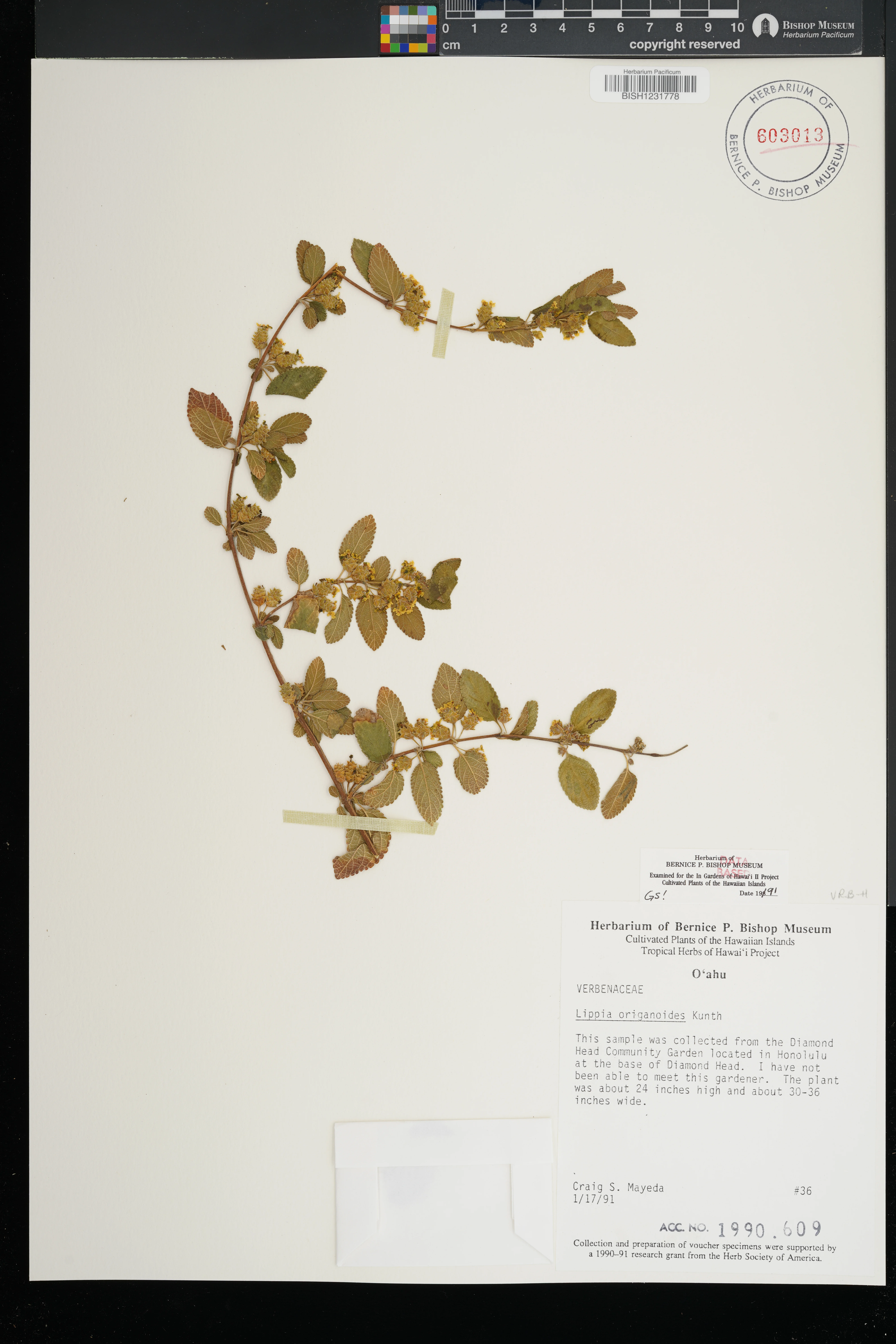 | 10 | Lippia origanoides | Kunth | honolulu, diamond head community garden, base of diamond head | PRESERVED_SPECIMEN | mayeda, c.s. | collector number: 36 | Oahu | BISH | 1/17/1991 | |