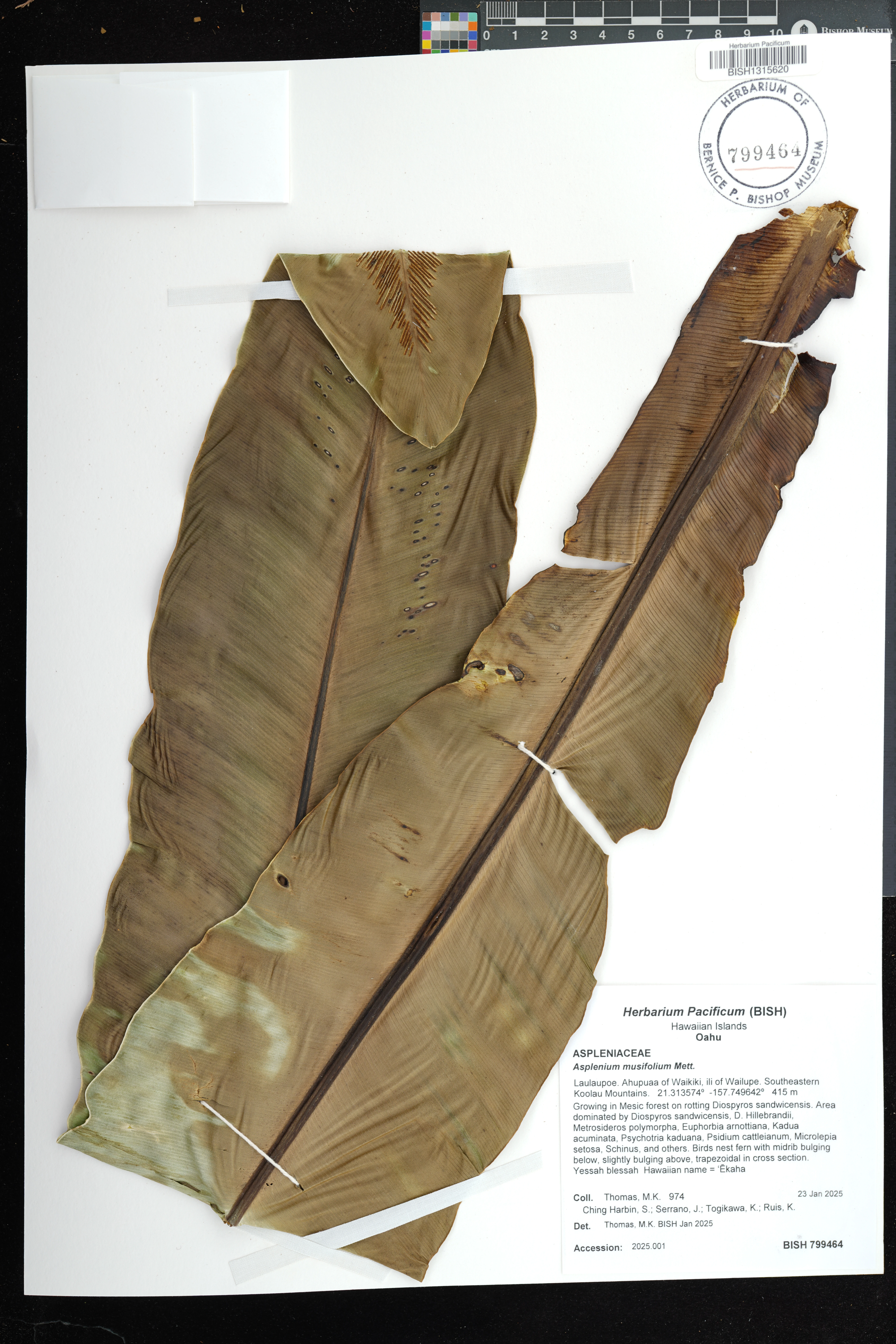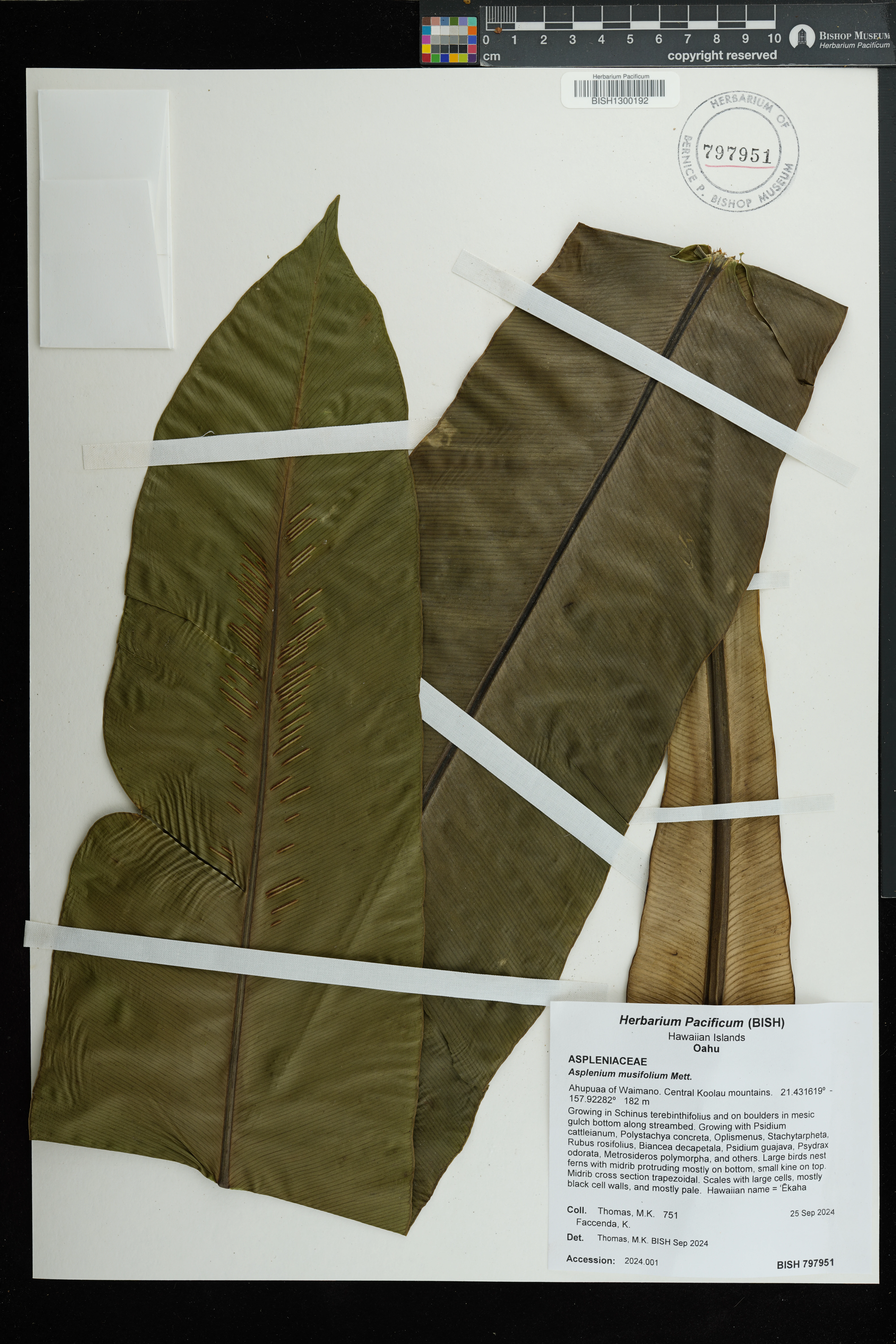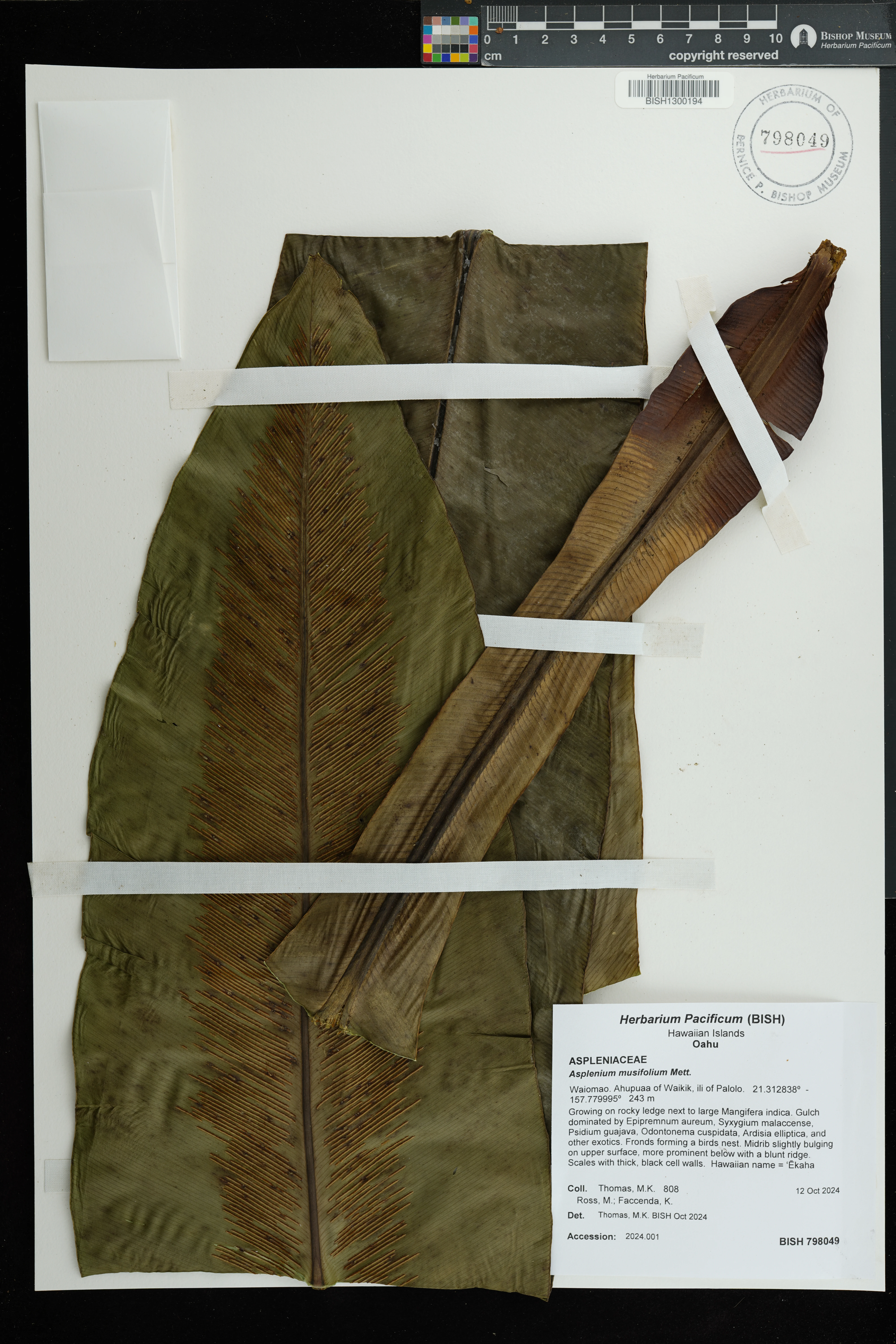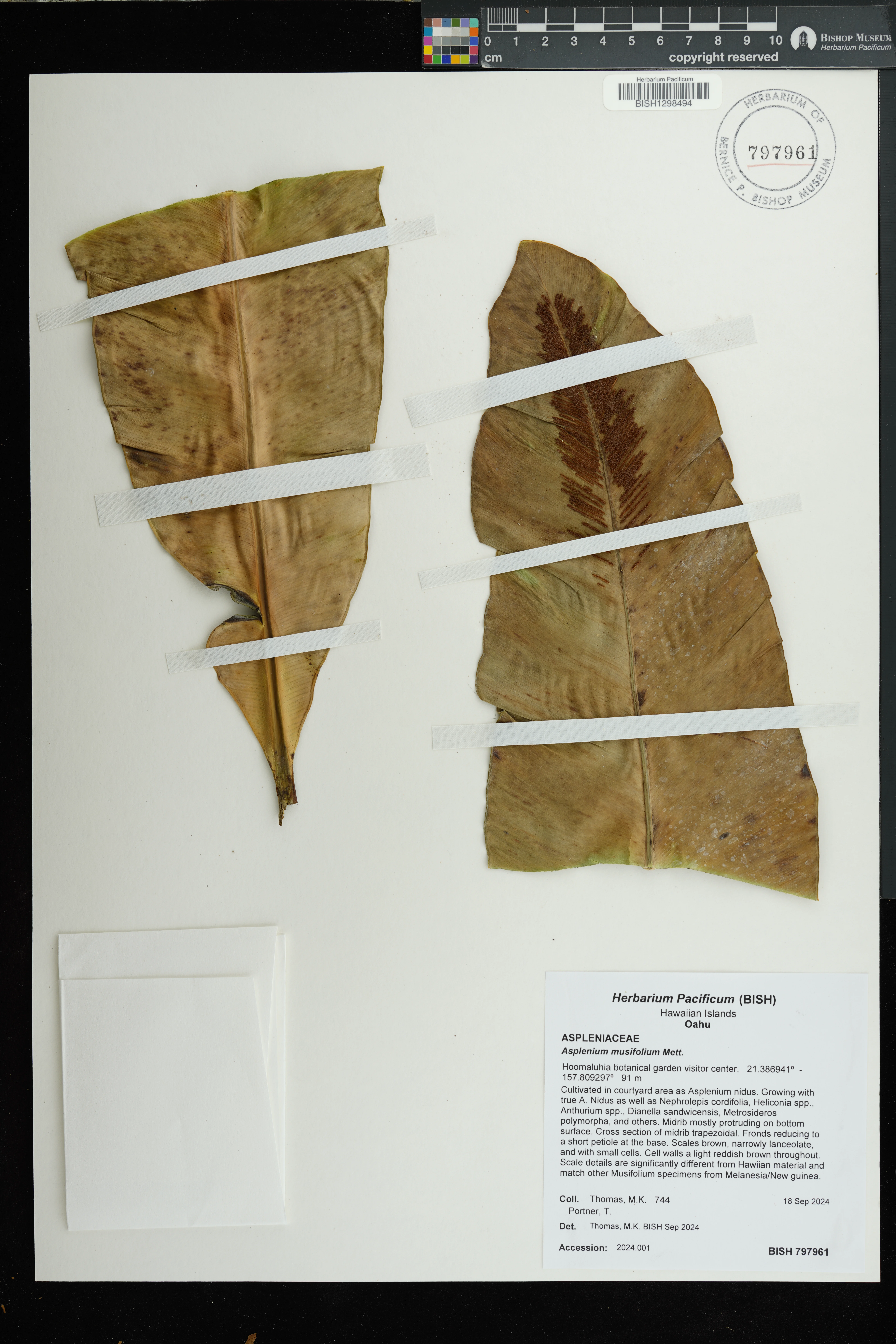 Palmer 2003:70 (K, O, Mo, L, M, H [as A. nidus]); Staples & Herbst 2005:28 (DESCR); Thomas, Tribble, et al. 2025 (A. nidus misapplied, in part = A. musifolium); Forbes 97.L BISH (L†, 1913)