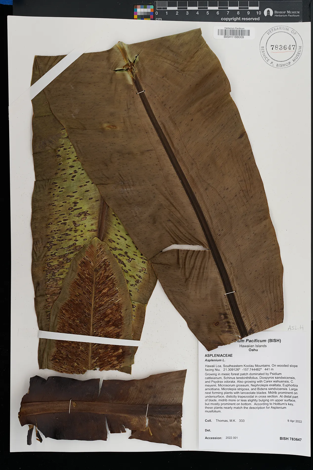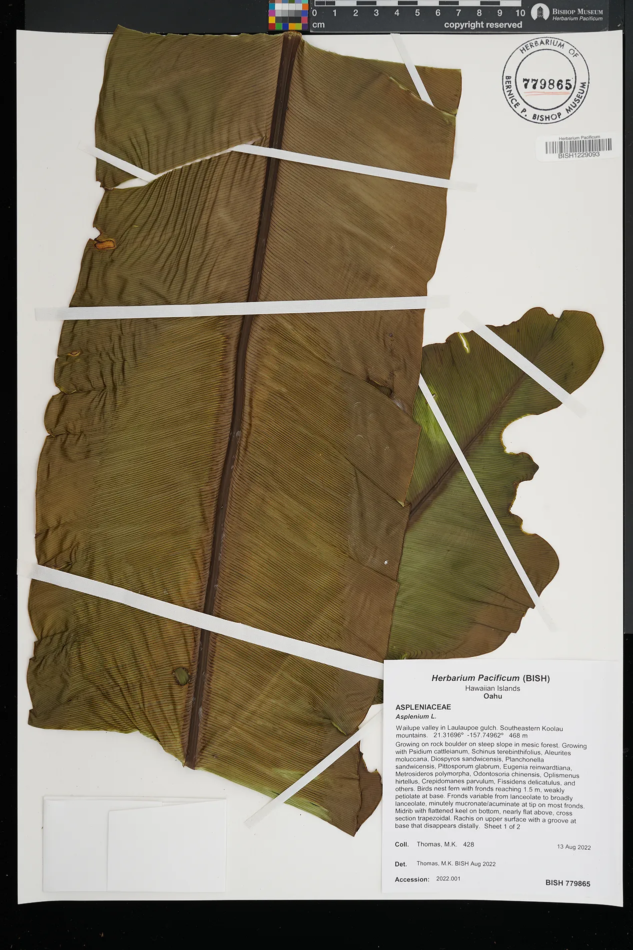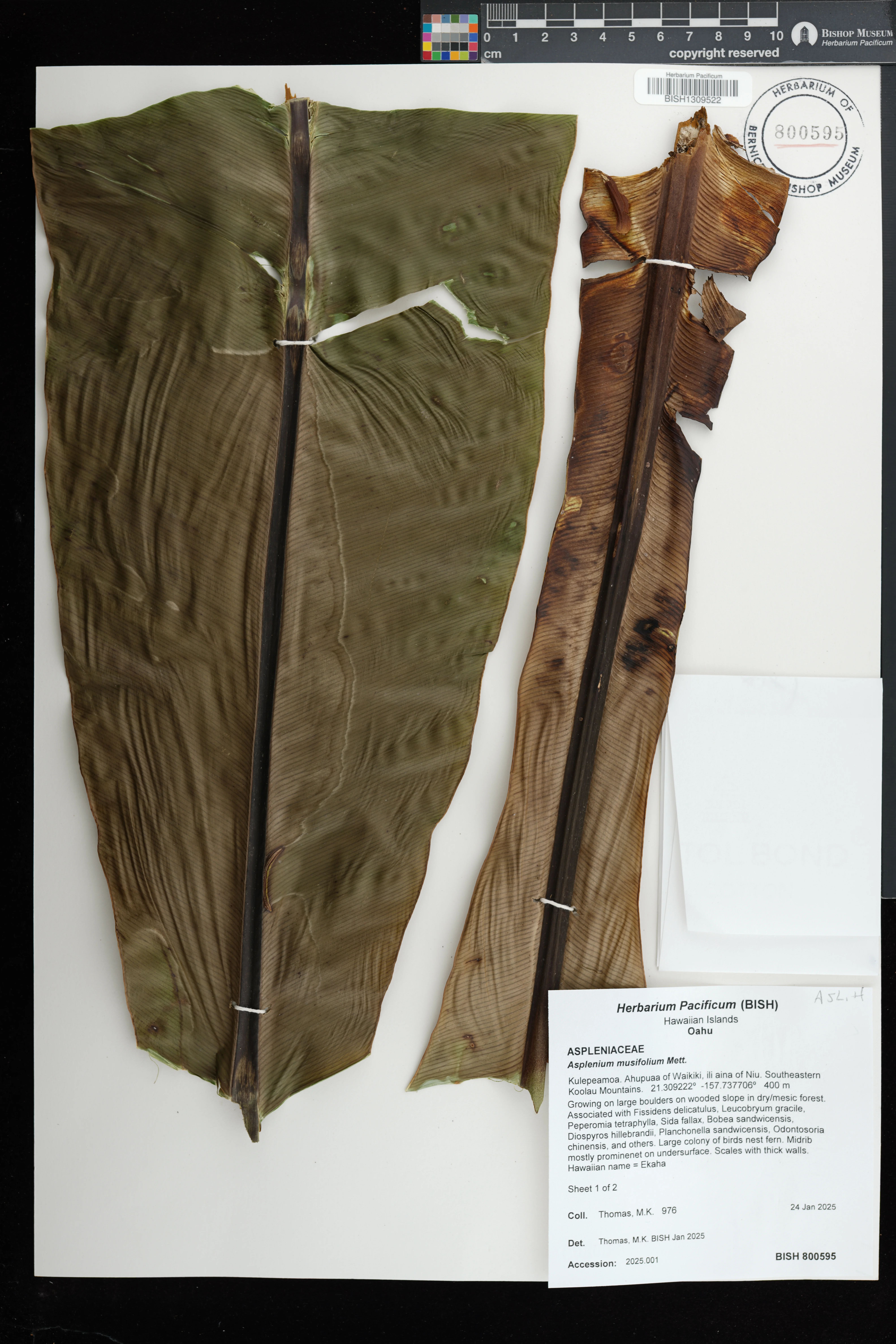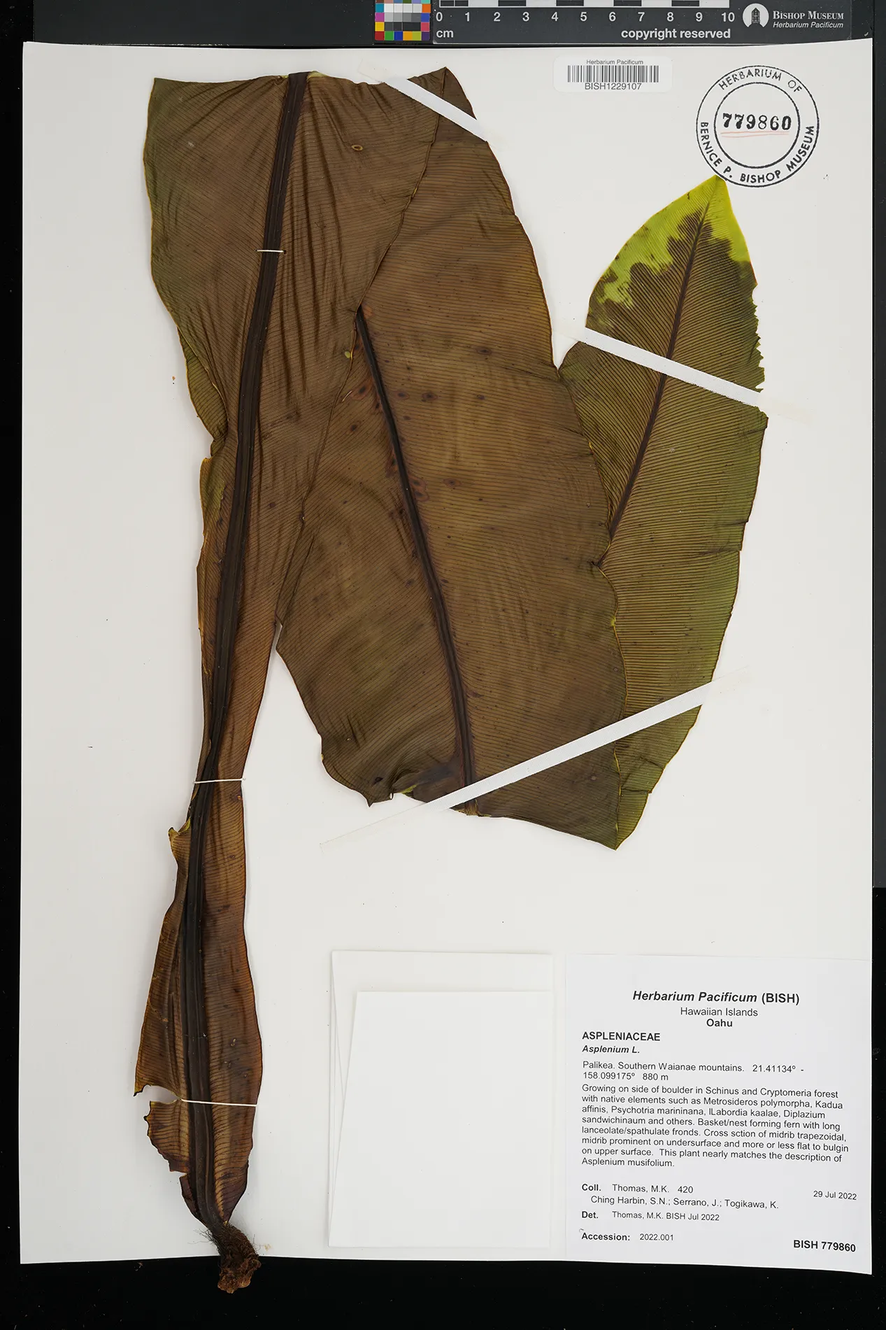 Palmer 2003:70 (K, O, Mo, L, M, H [as A. nidus]); Staples & Herbst 2005:28 (DESCR); Thomas, Tribble, et al. 2025 (A. nidus misapplied, in part = A. musifolium); Forbes 97.L BISH (L†, 1913)