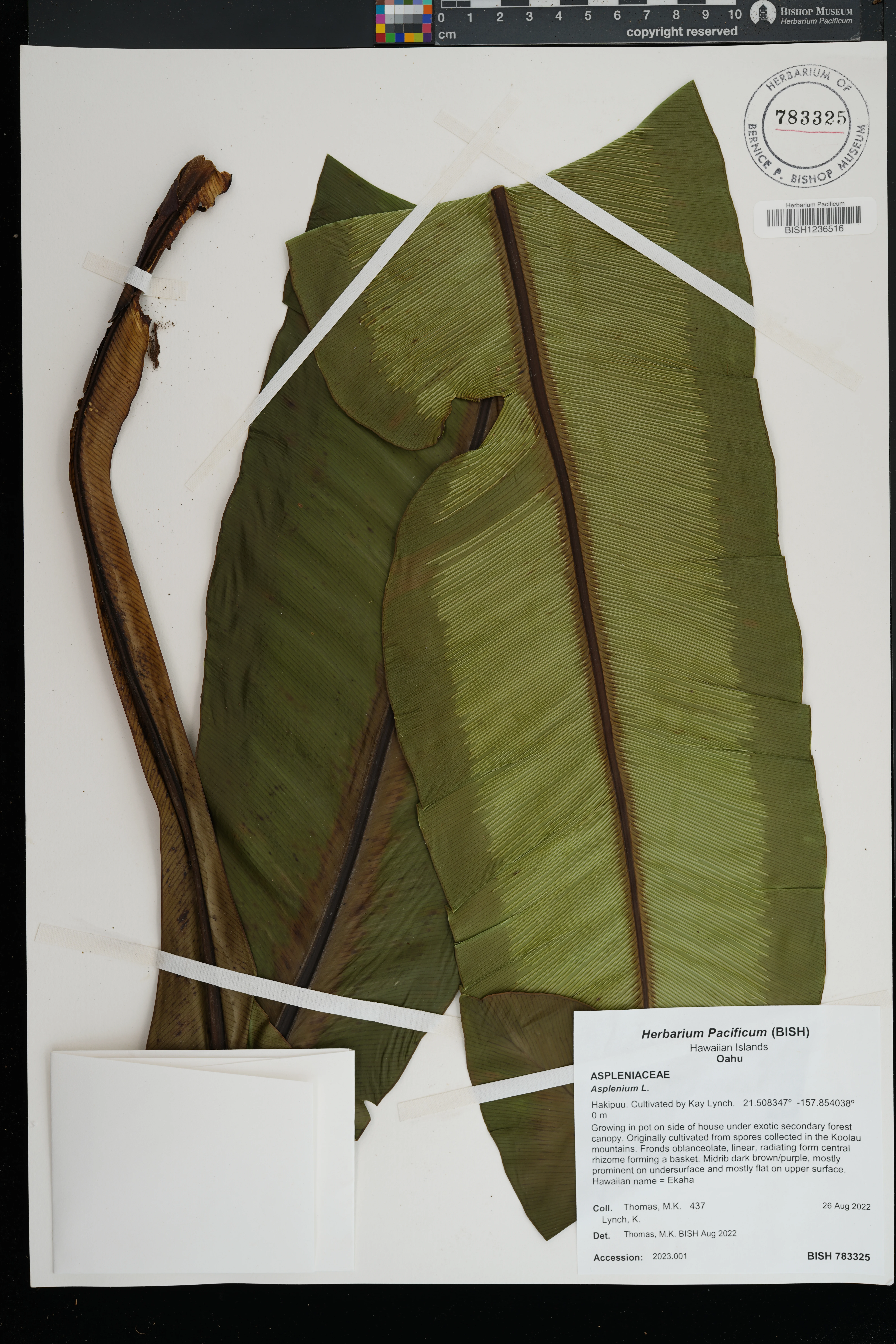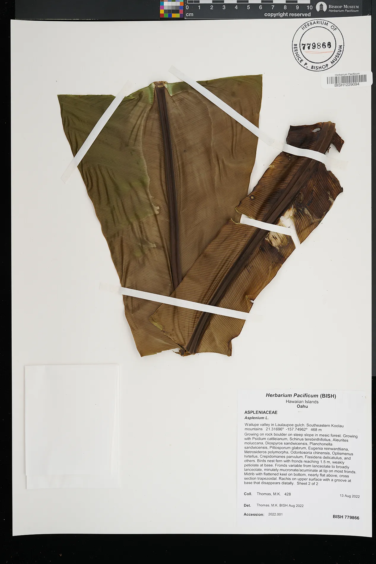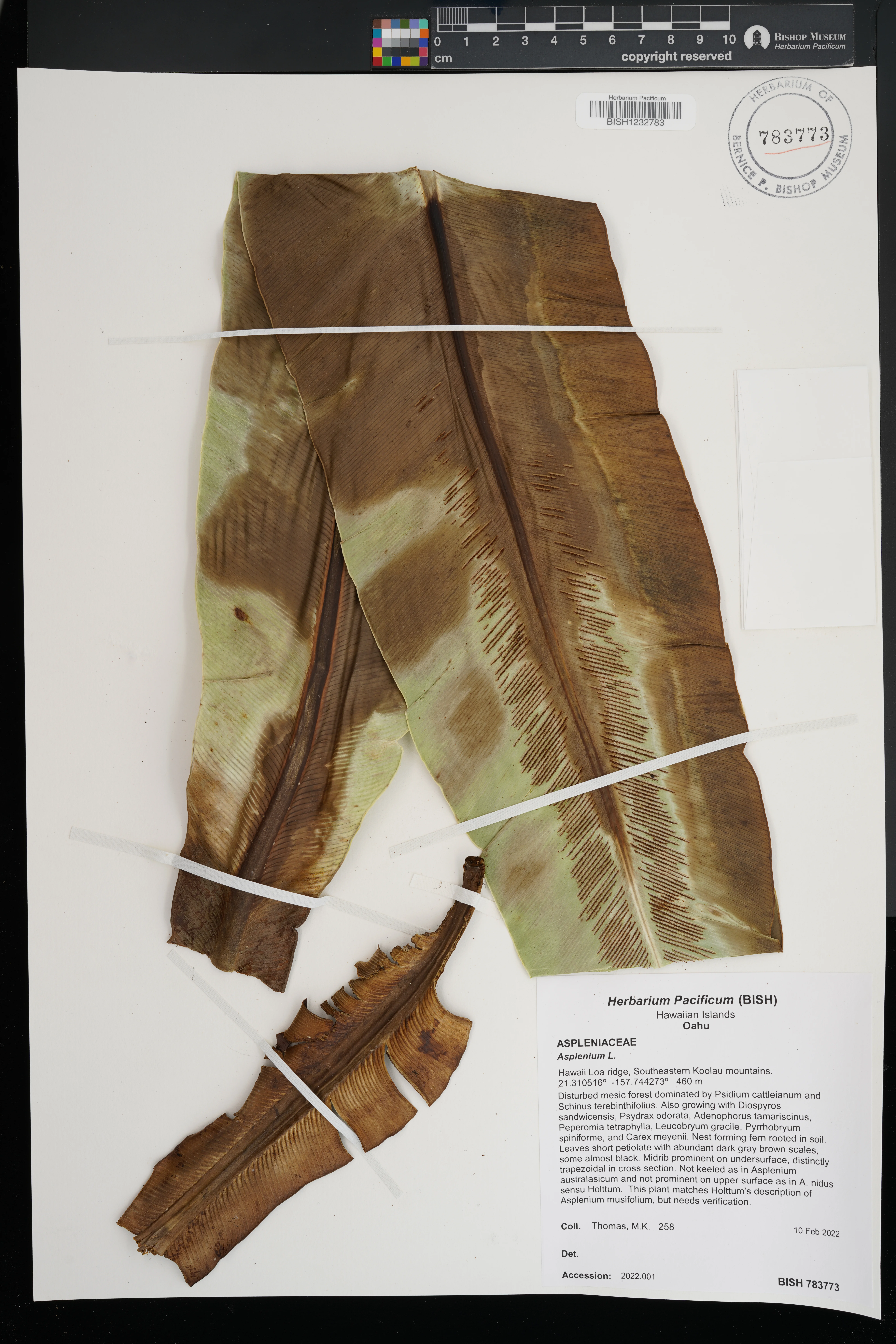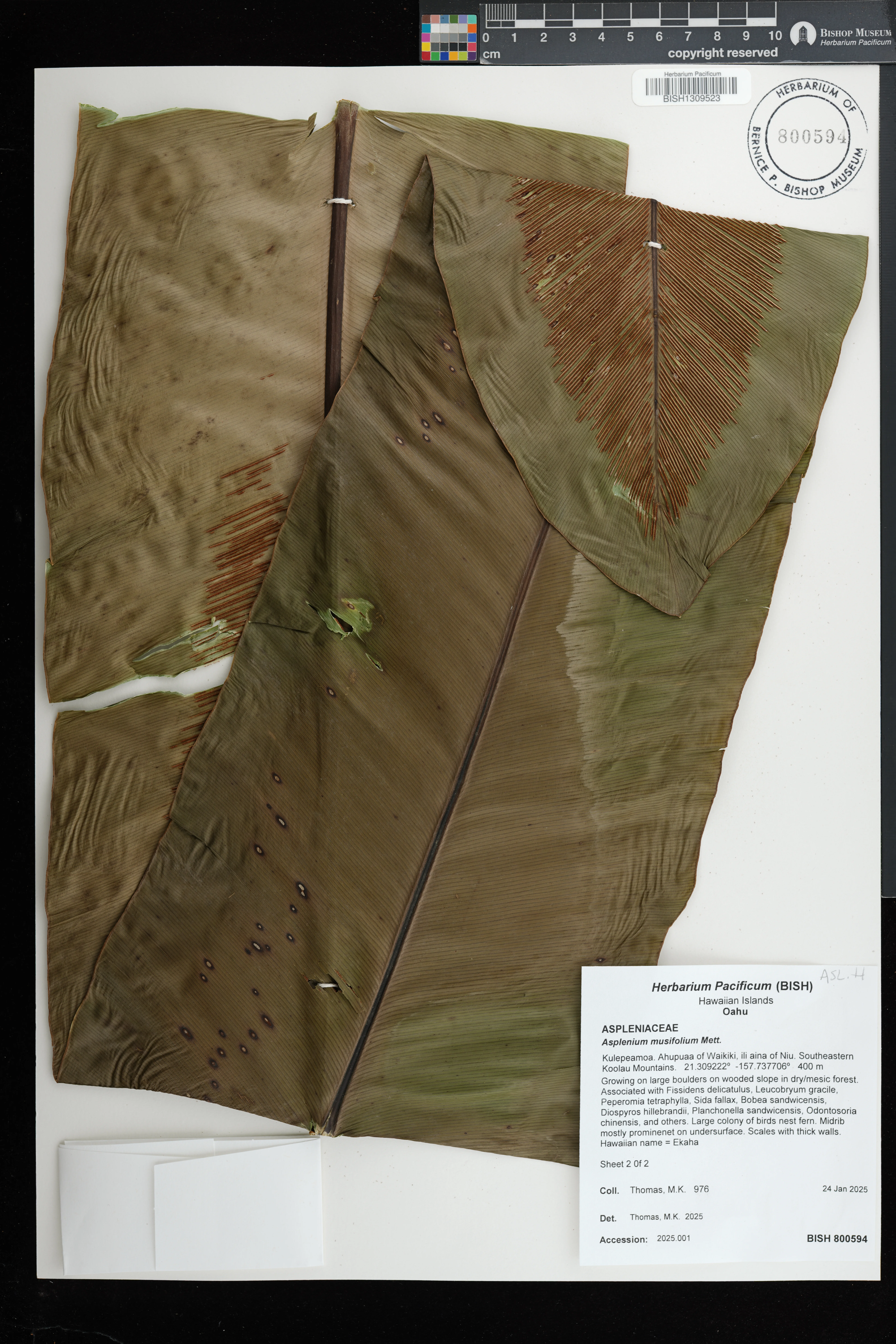Palmer 2003:70 (K, O, Mo, L, M, H [as A. nidus]); Staples & Herbst 2005:28 (DESCR); Thomas, Tribble, et al. 2025 (A. nidus misapplied, in part = A. musifolium); Forbes 97.L BISH (L†, 1913)
