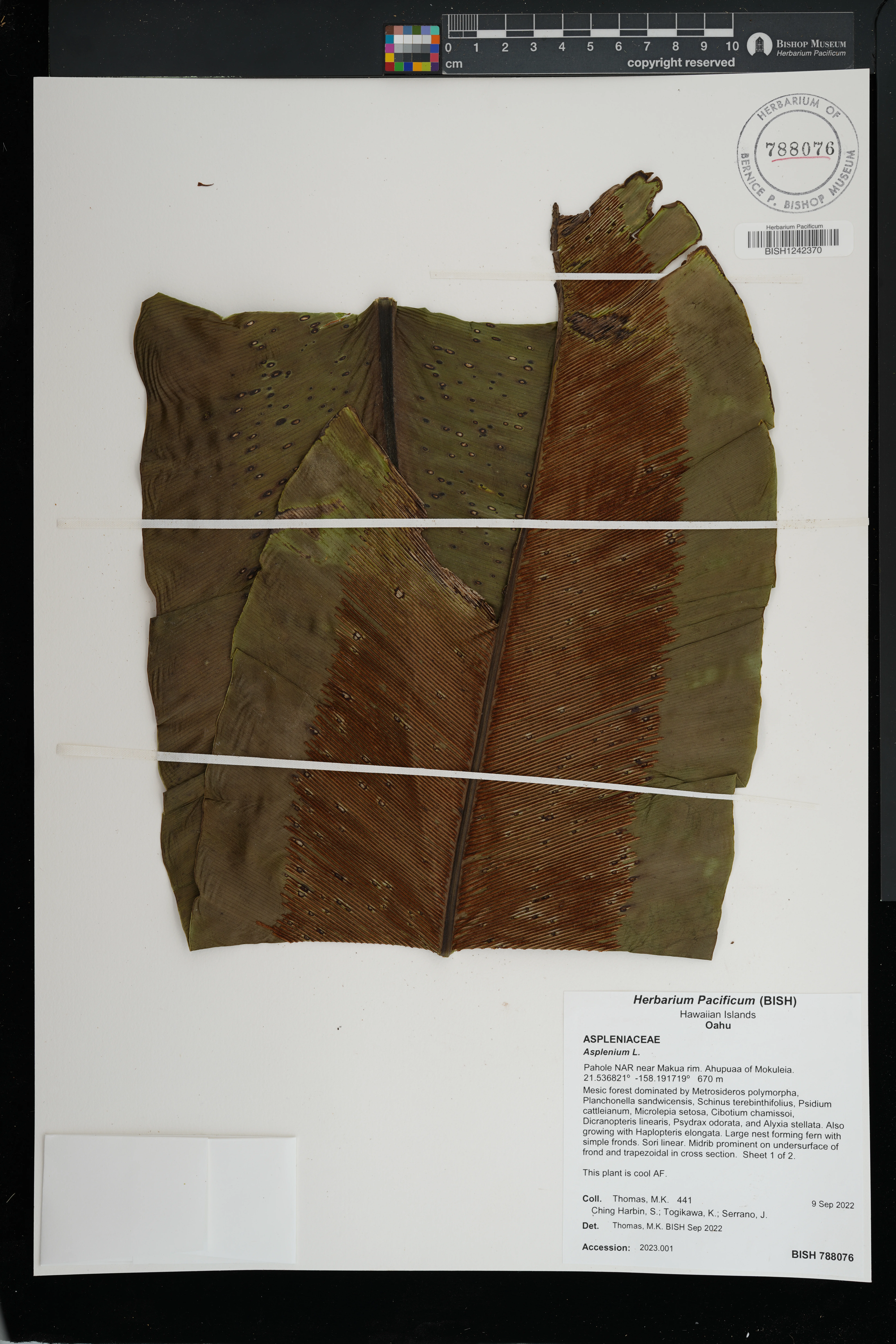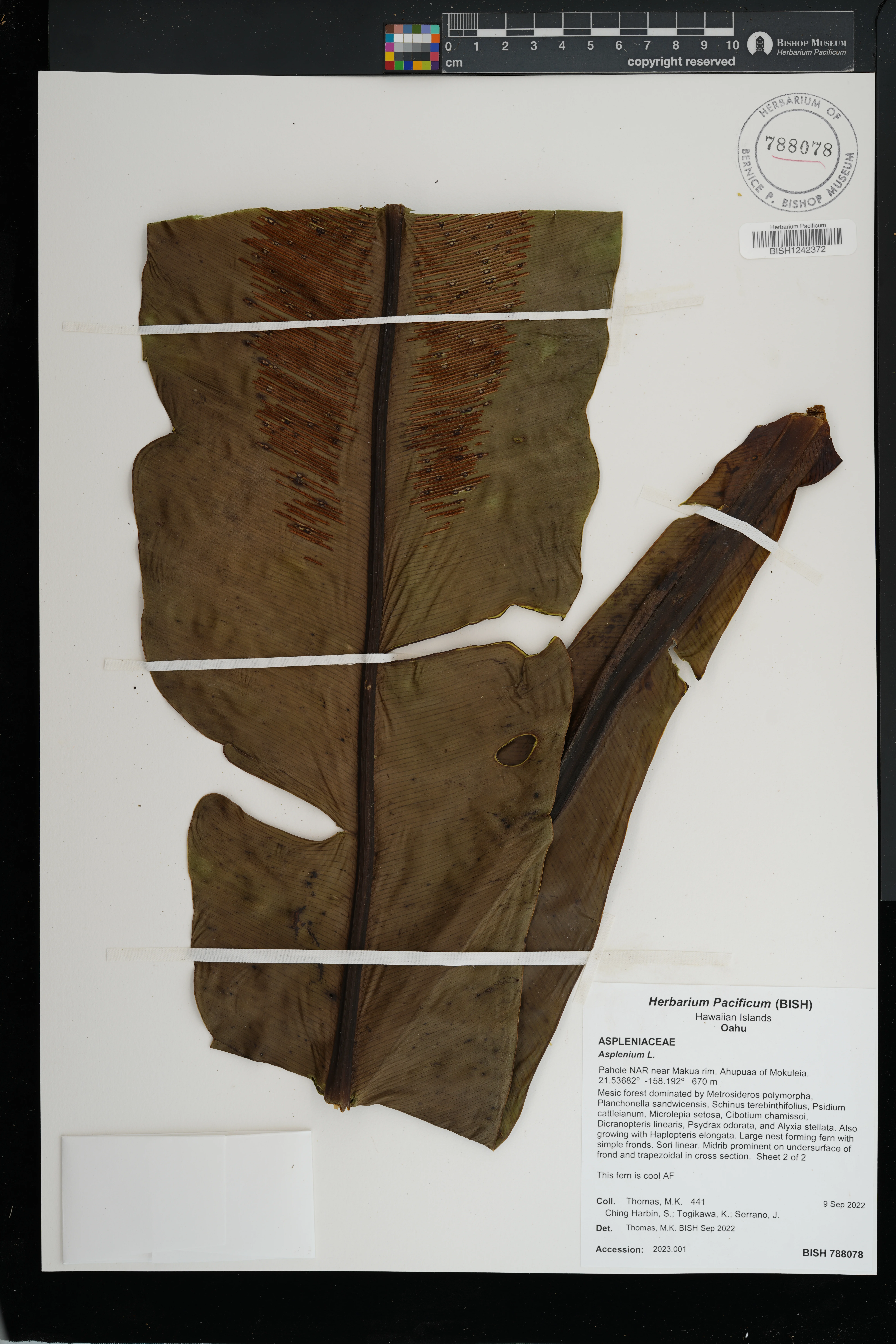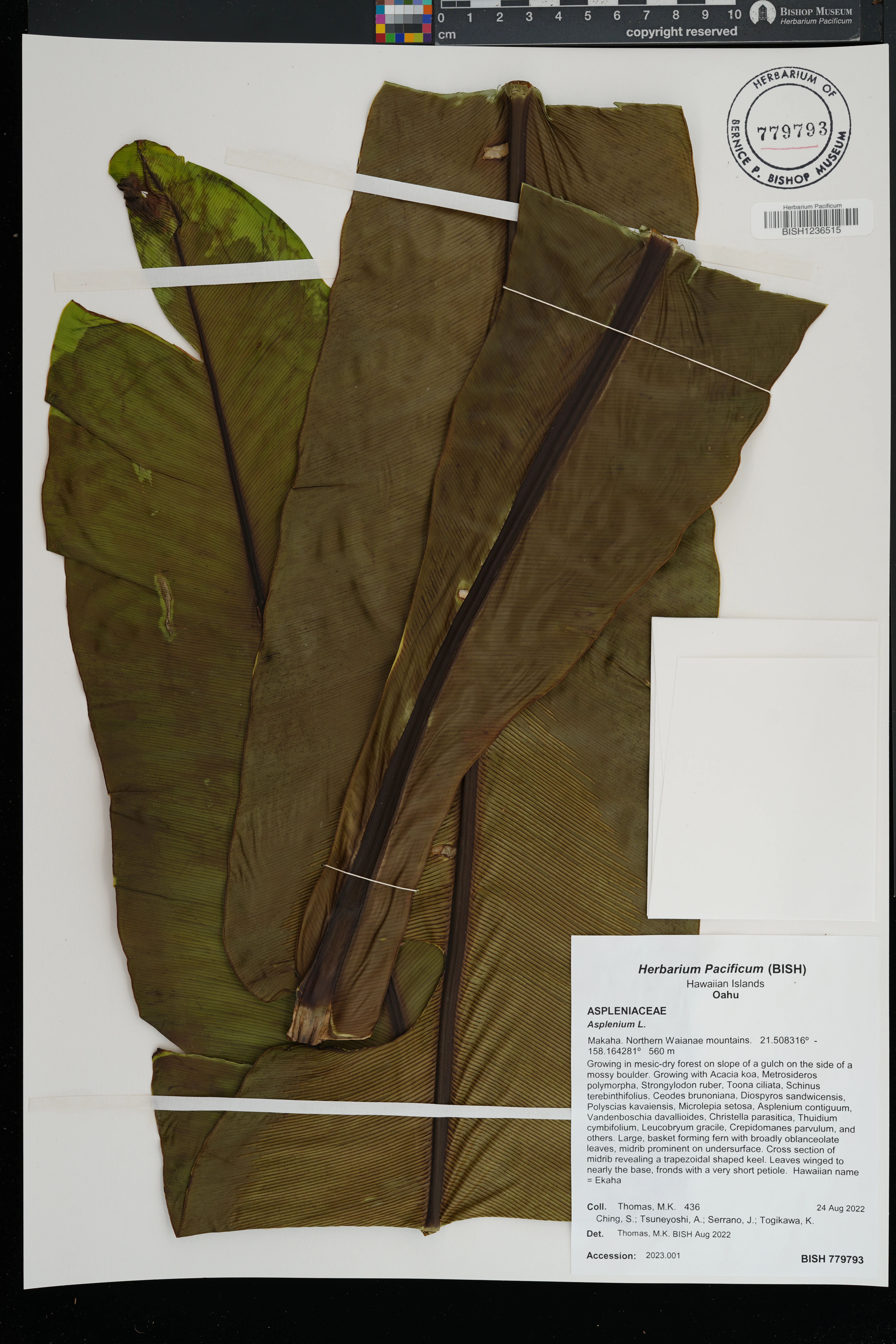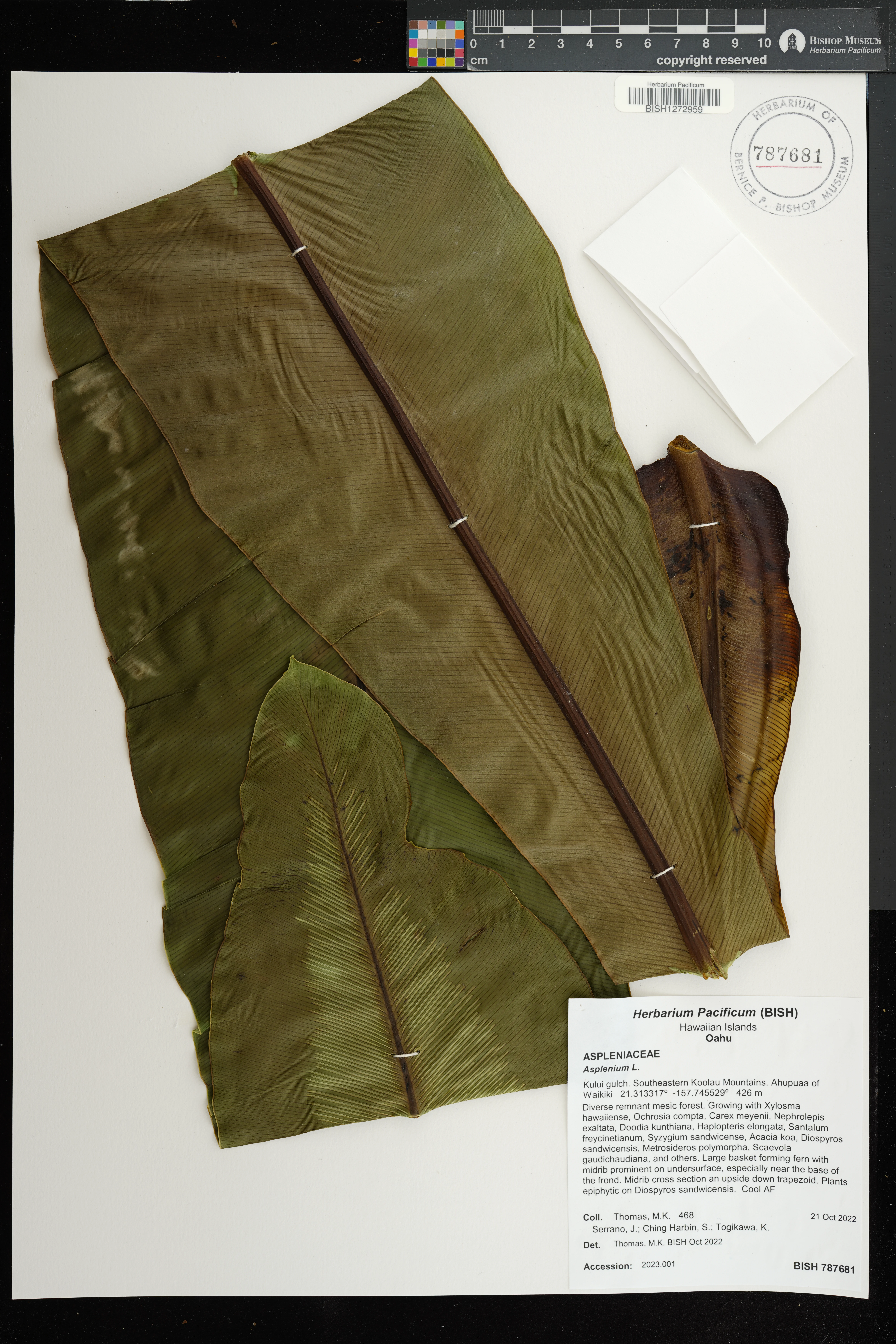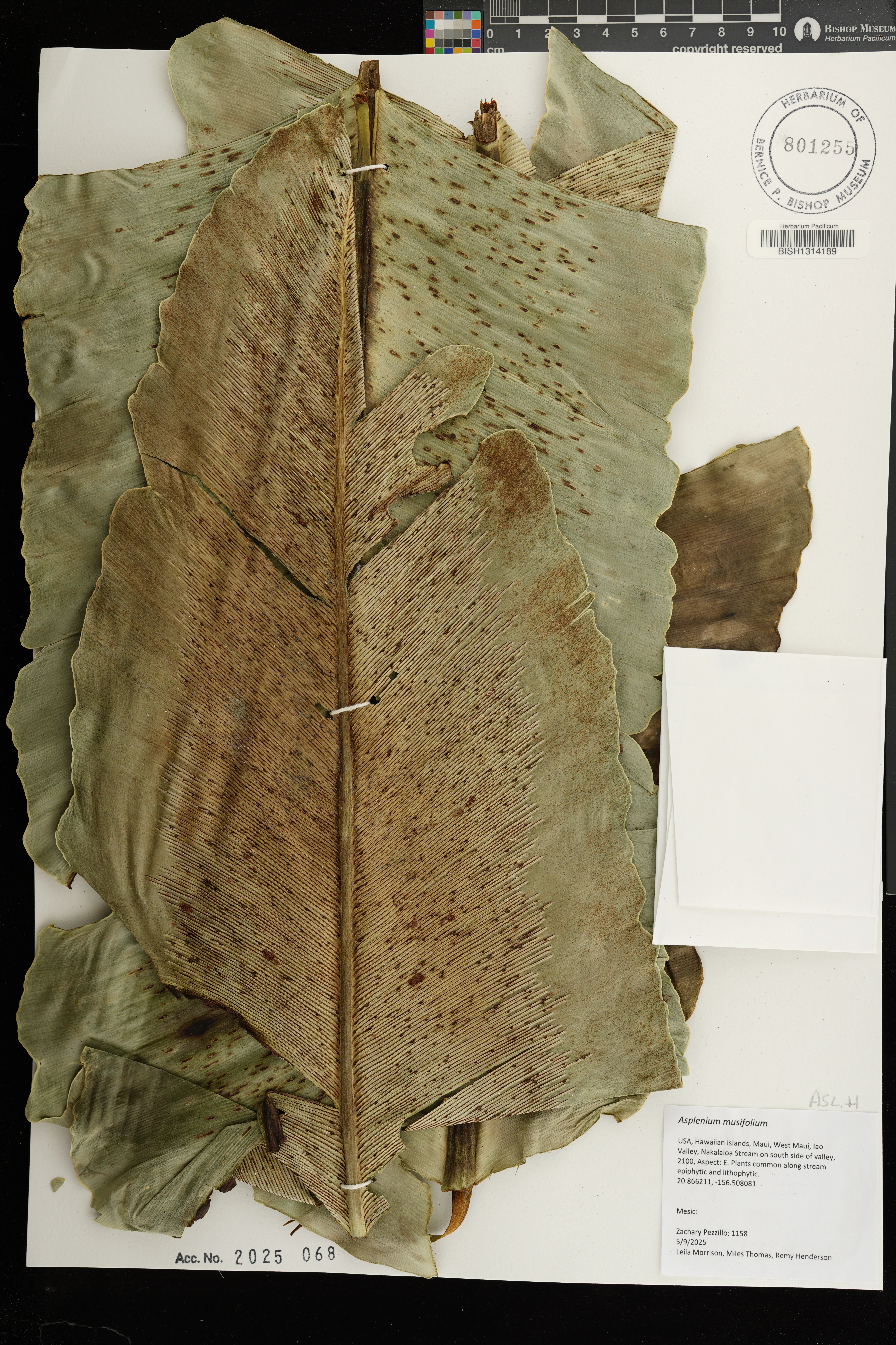 1 Asplenium musifolium Mett. south hilo distr., waiakea uka area, novelty greens at 142-a malaai rd. mesic to wet koa forest with Perrottetia sandwicensis, Psychotria hawaiiensis, Broussaisia arguta, Hedyotis acuminata PRESERVED_SPECIMEN staples, g.w. purell, m. collector number: 1278 Maui BISH 2/14/2007