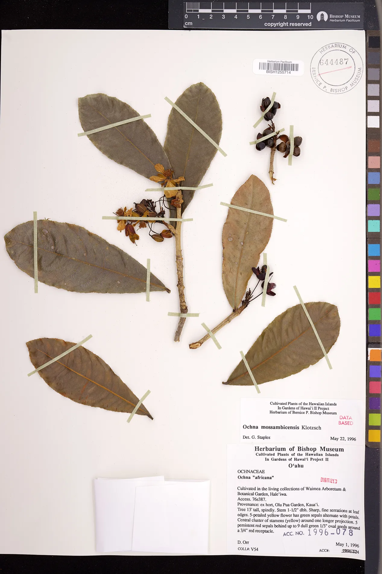 | 11 | Ochna atropurpurea | DC. | haleiwa; waimea arboretum & botanical garden | PRESERVED_SPECIMEN | orr, d. | collector number: v-54 | Oahu | BISH | 5/1/1996 | |