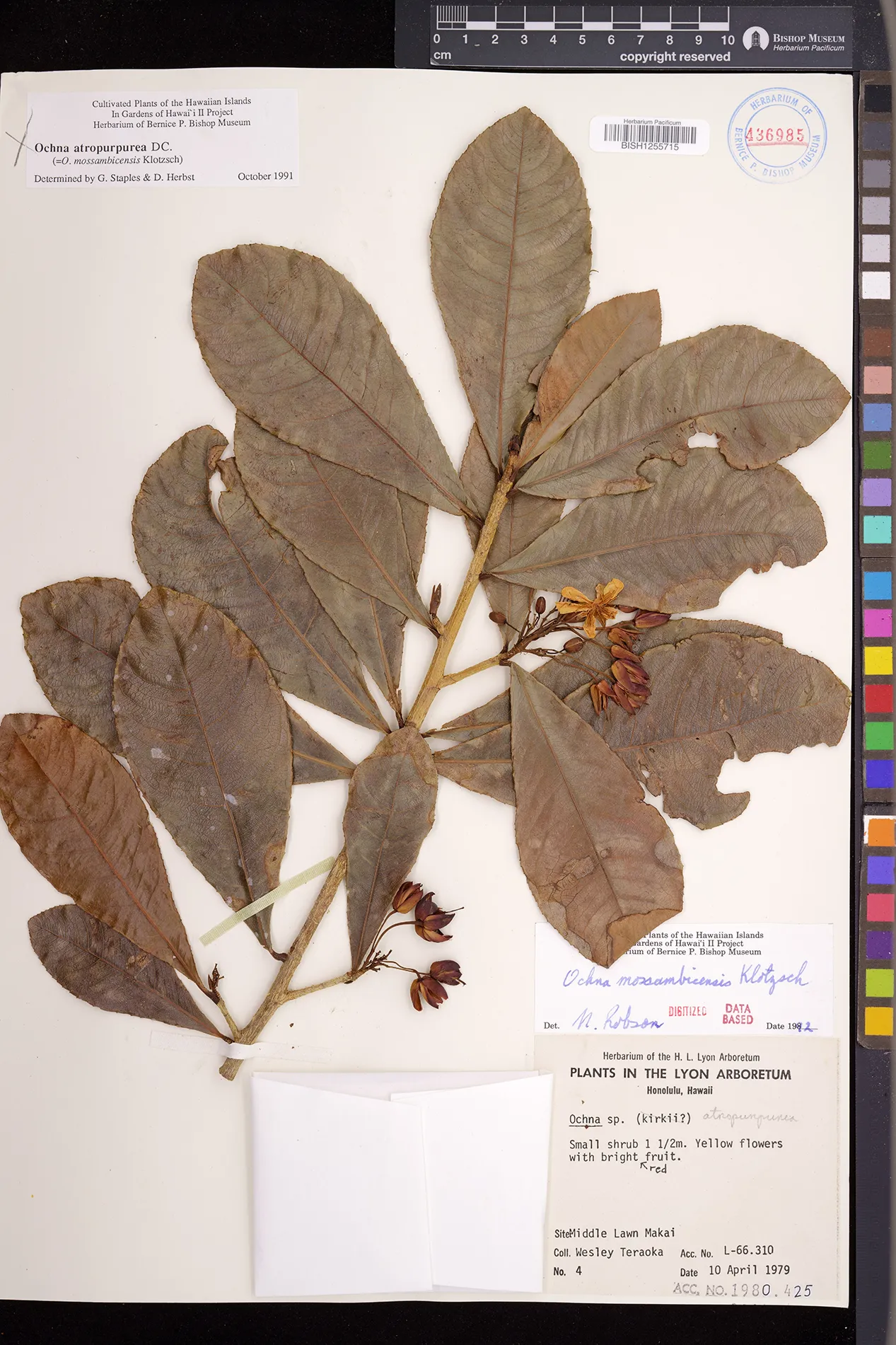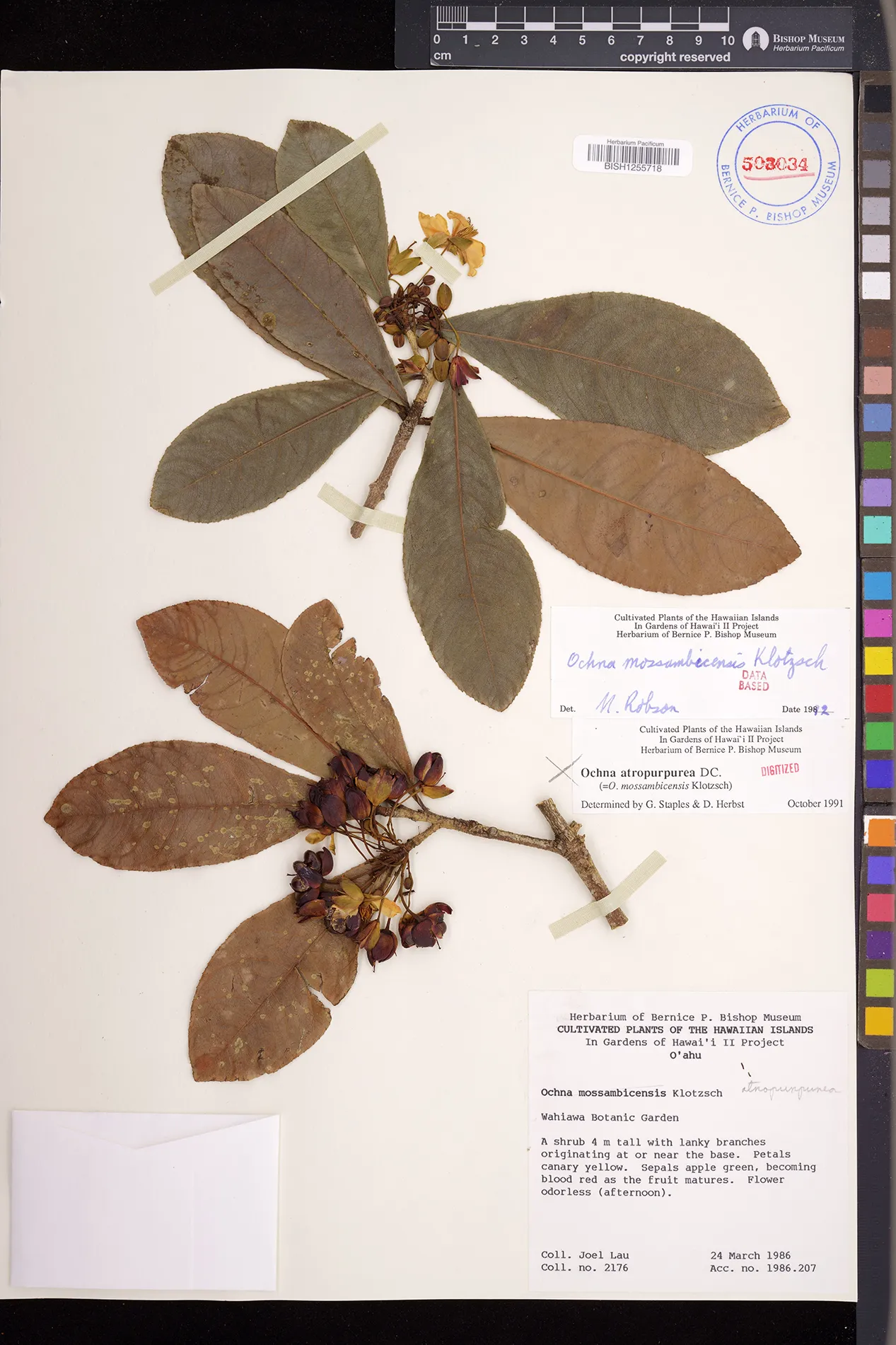 | 3 | Ochna atropurpurea | DC. | Wahiawa Botanic Garden | PRESERVED_SPECIMEN | Lau, J. | 2176 | Oahu | BISH | 3/24/1986 | |