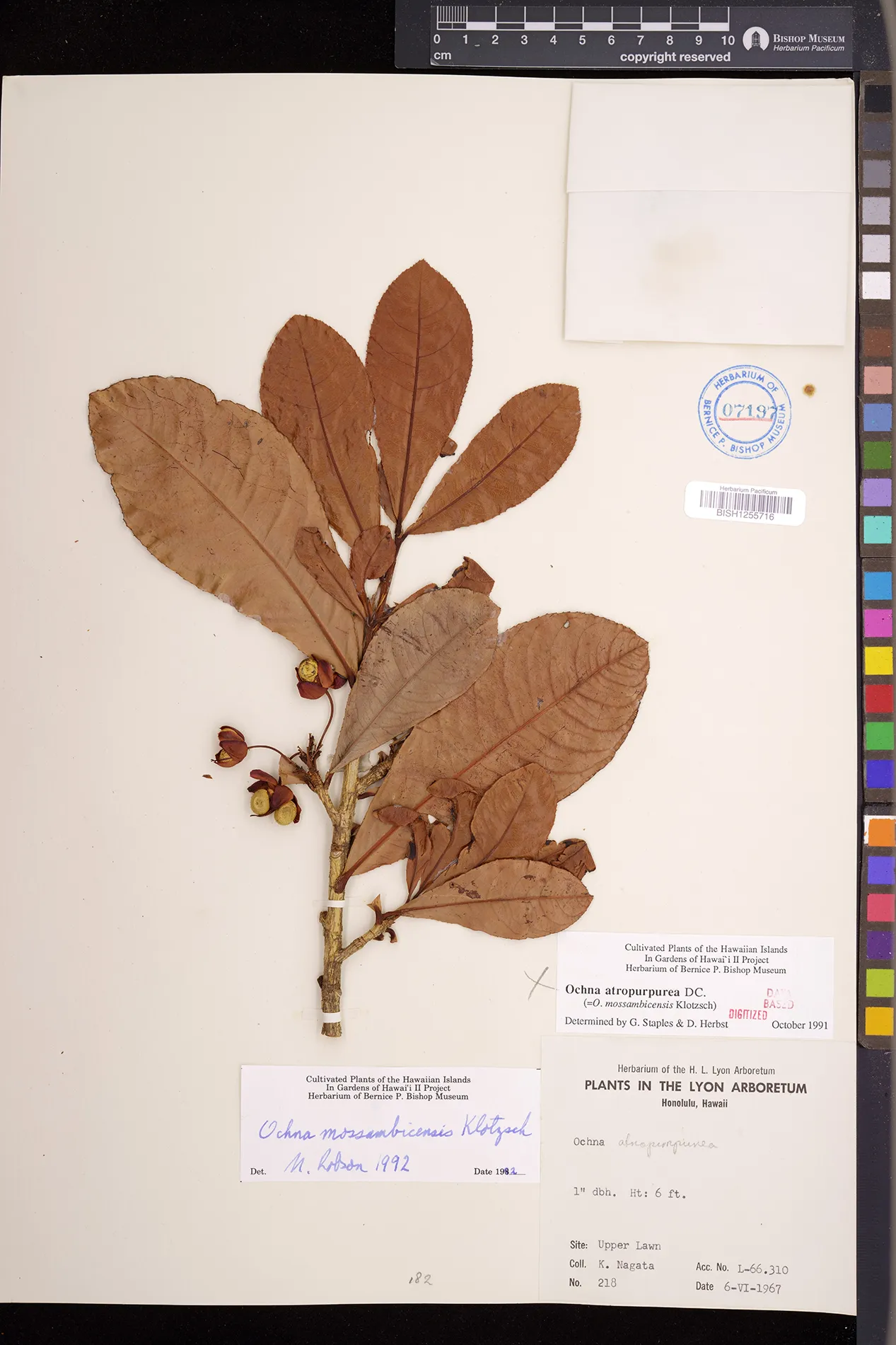 | 4 | Ochna atropurpurea | DC. | Honolulu, Foster Gardens | PRESERVED_SPECIMEN | Woolford, H.A. | s.n. | Oahu | BISH | 4/17/1950 | |