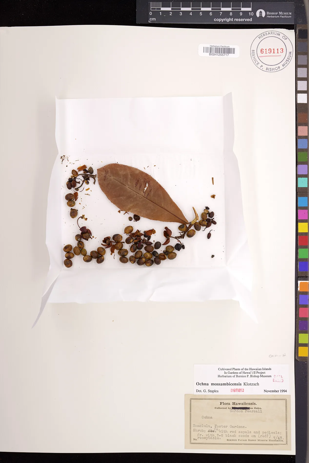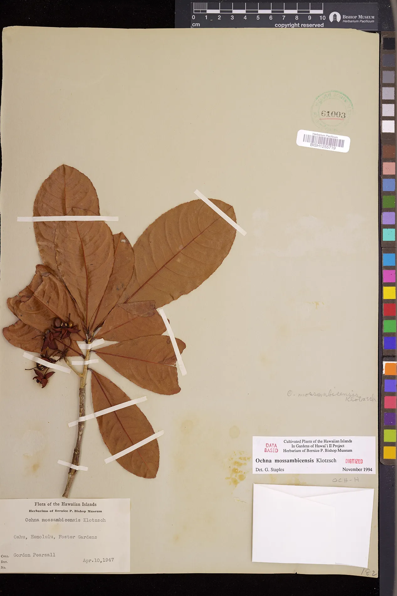 | 7 | Ochna atropurpurea | DC. | Honolulu, Foster Gardens | PRESERVED_SPECIMEN | Pearsall, G.A. | s.n. | Oahu | BISH | 4/10/1947 | |
