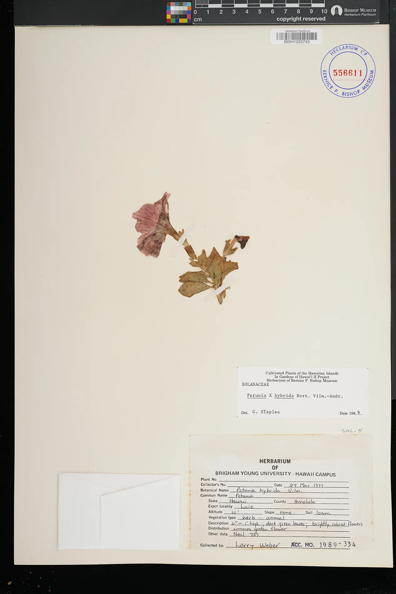 | 1 | Petunia × atkinsiana | Laie | common garden flower | PRESERVED_SPECIMEN | Weber, L. | Neal 739 | Oahu | BISH | 3/24/1977 |