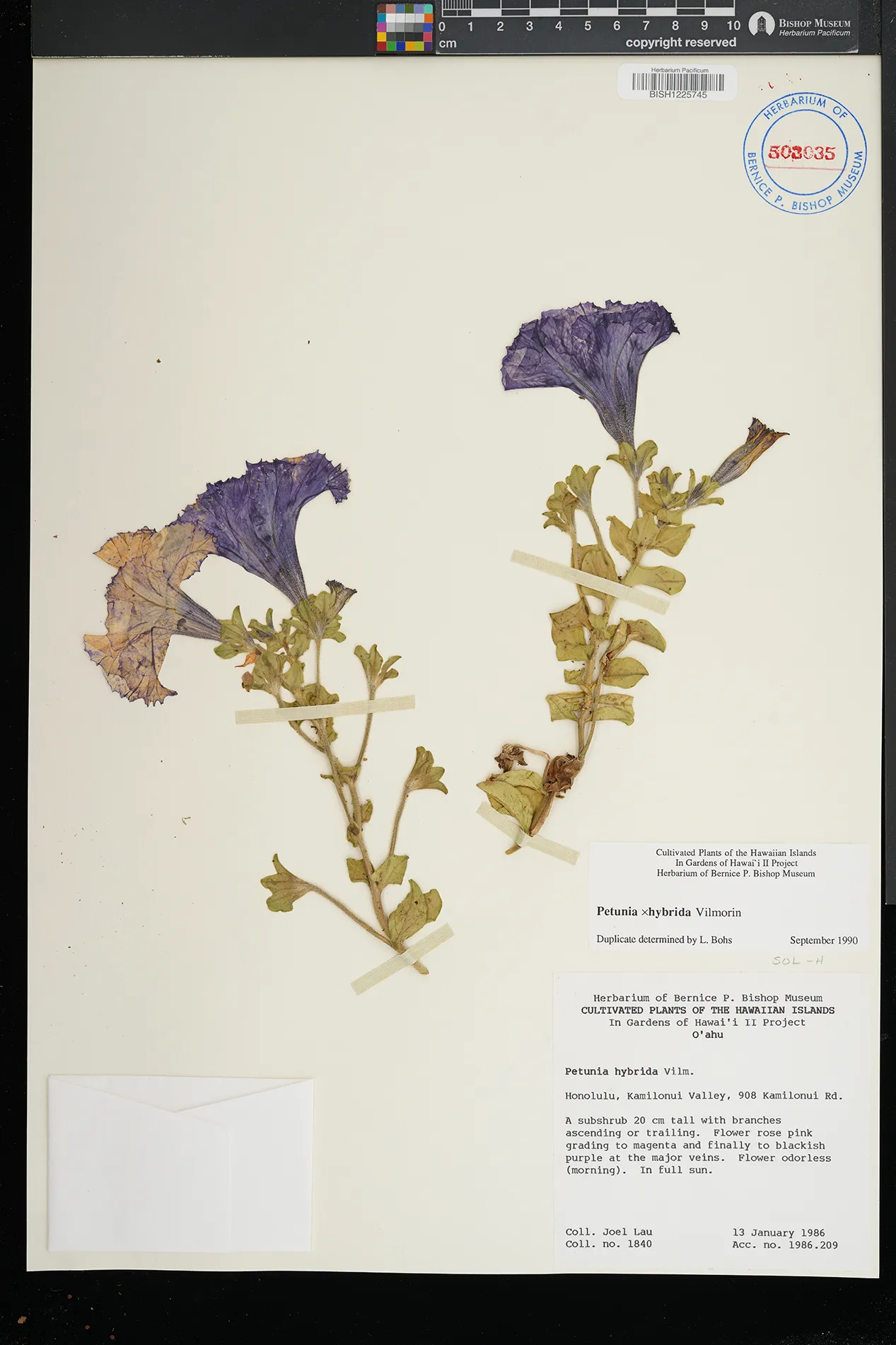 | 3 | Petunia × atkinsiana | Honolulu, Kamilonui Valley, 908 Kamilonui Rd | full sun | PRESERVED_SPECIMEN | Lau, J. | 1840 | Oahu | BISH | 1/13/1986 |