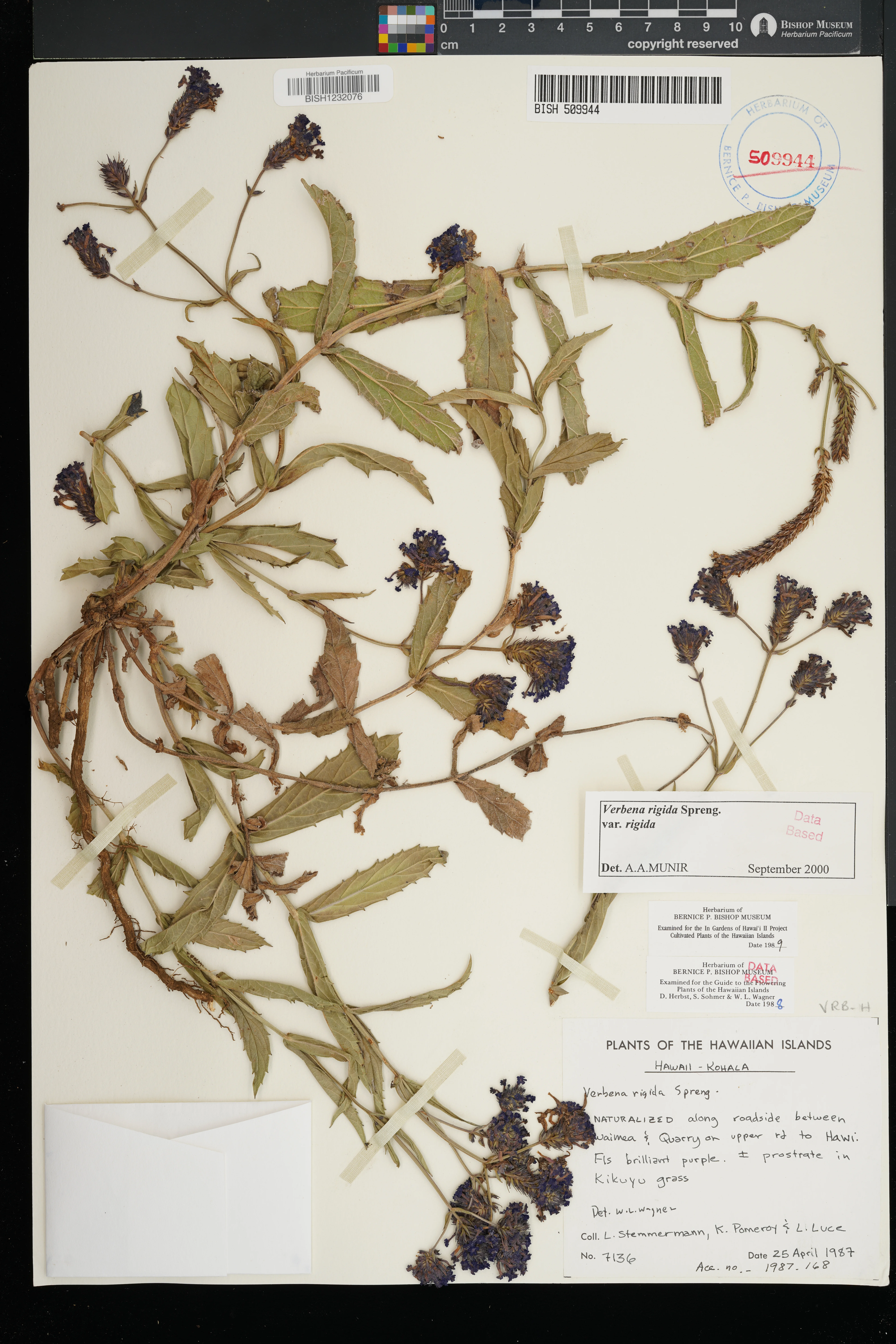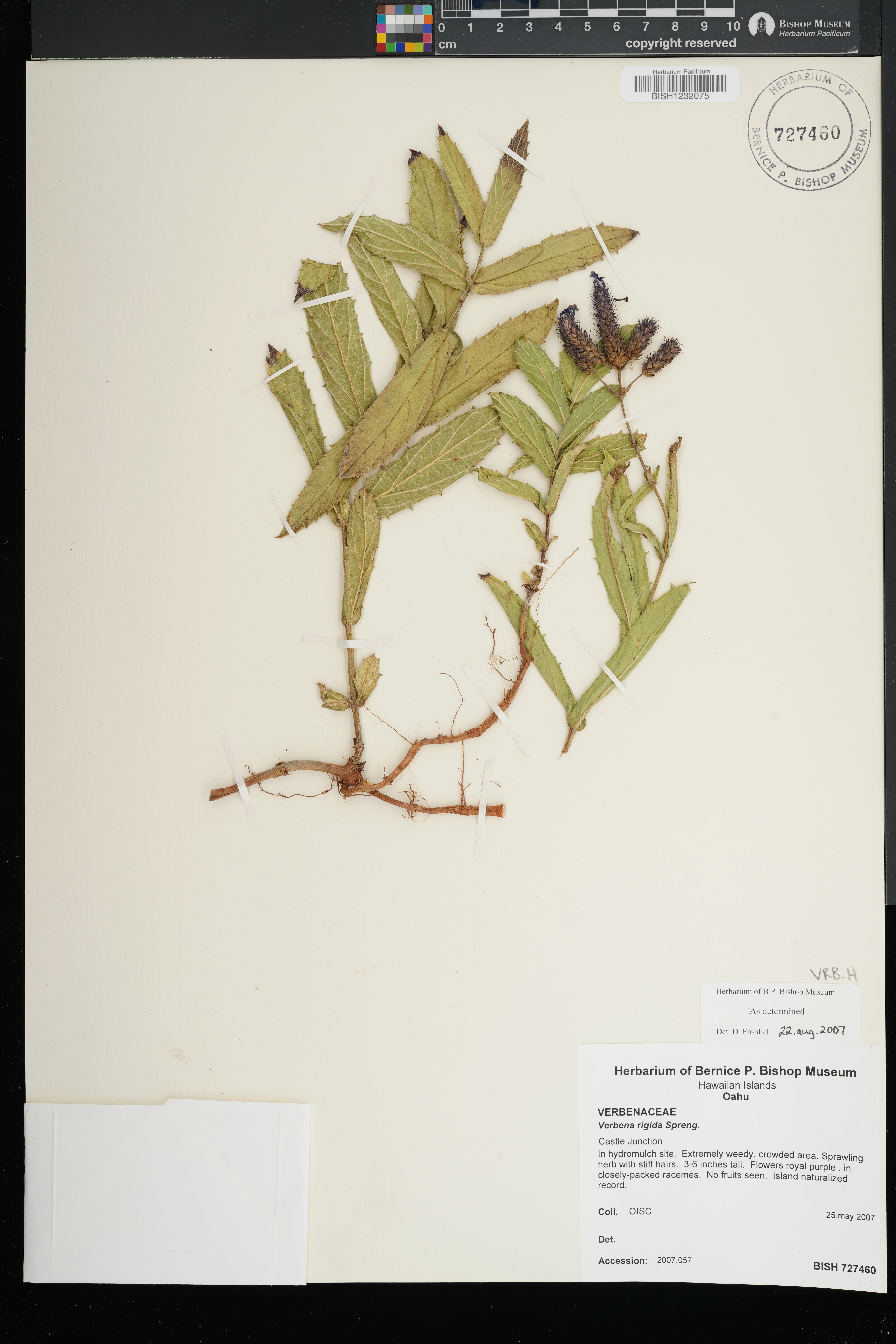1 Verbena rigida Spreng. Castle Junction In hydromulch site. Extremely weedy, crowded area. PRESERVED_SPECIMEN OISC s.n. Oahu BISH 5/25/2007