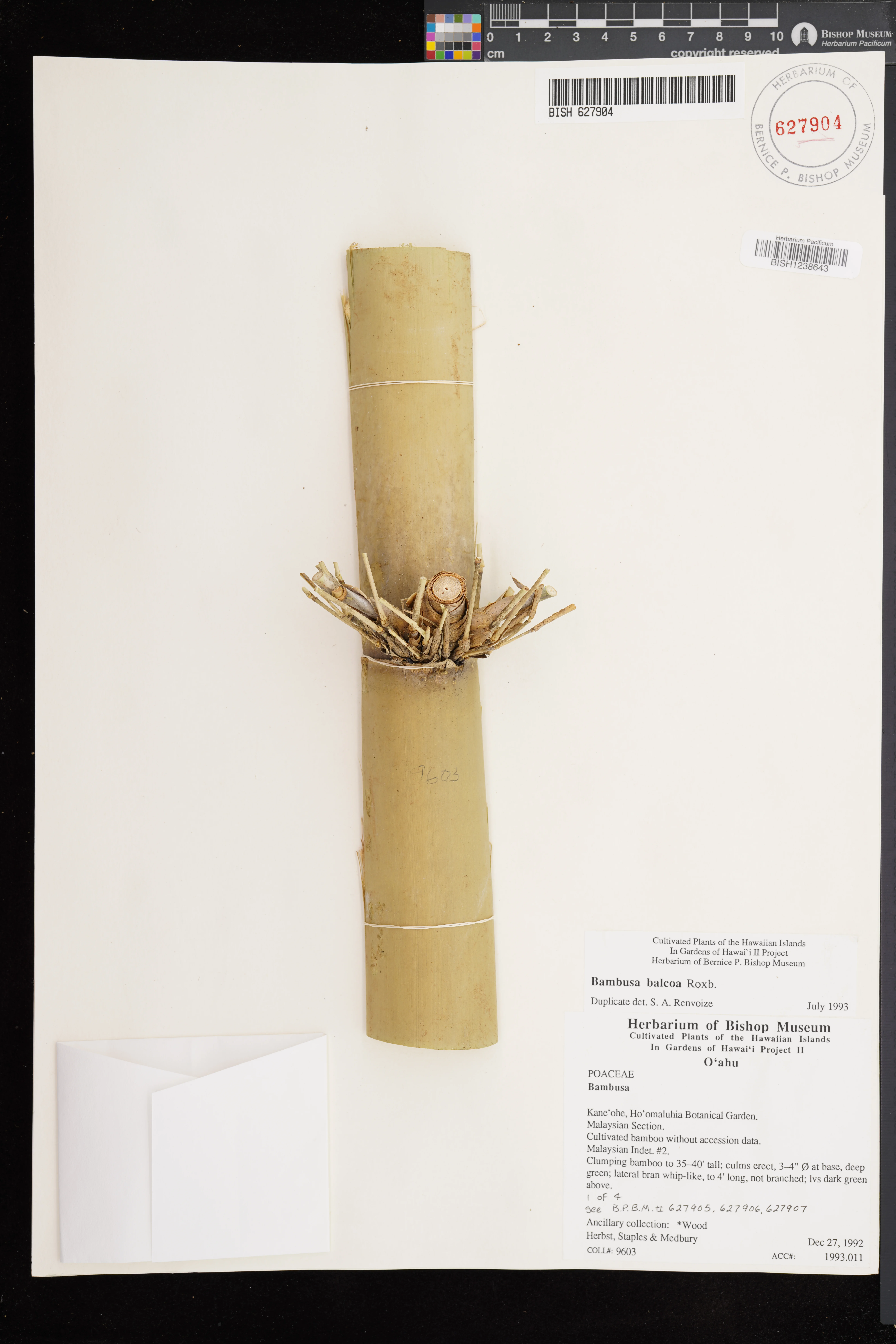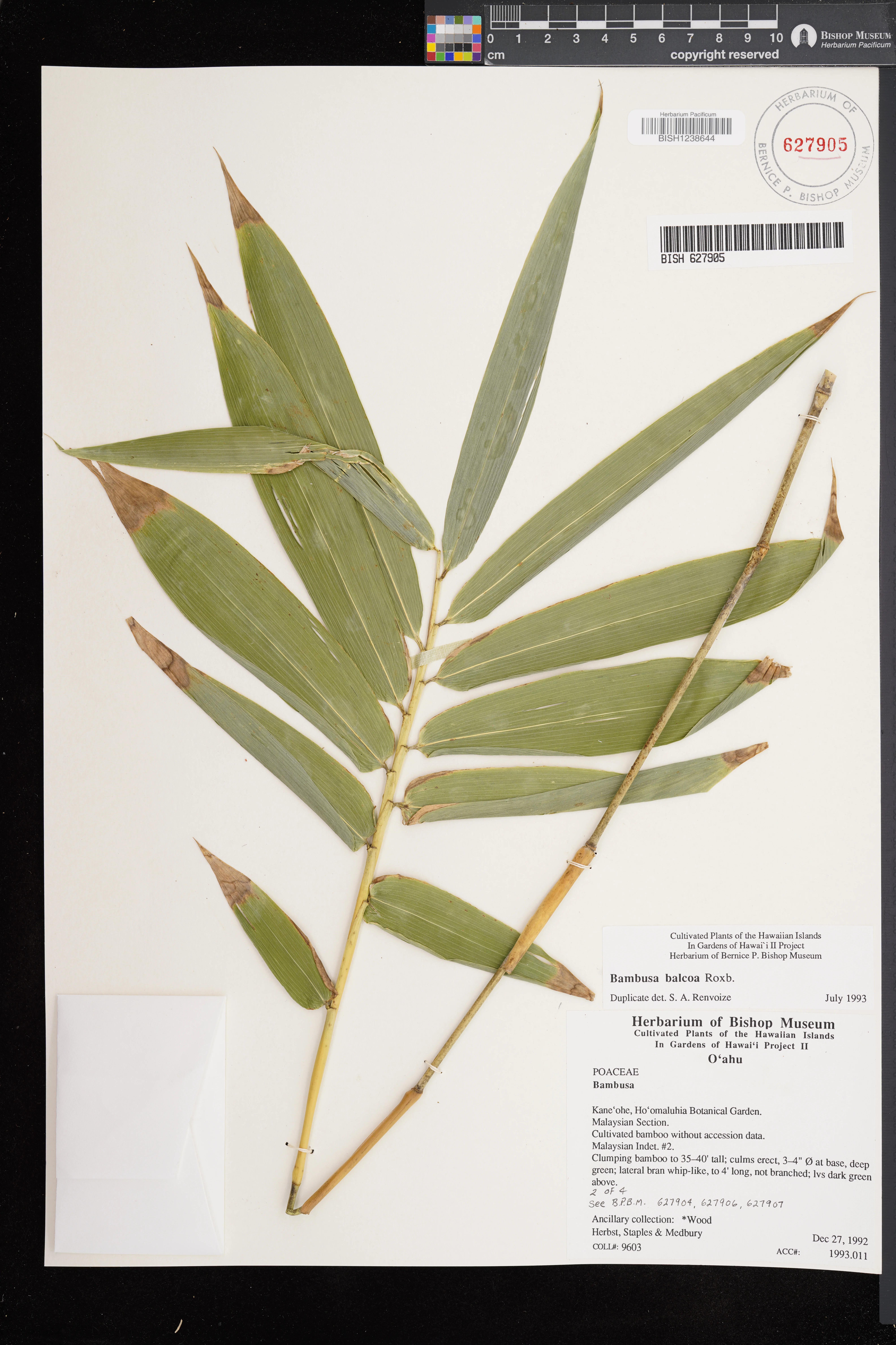 | 7 | Bambusa balcooa | Roxb. | Kaneohe: Hoomaluhia Botanical Garden, Malaysian section Malaysian Indet. #2 | PRESERVED_SPECIMEN | Herbst, D.R. | 9603 | Oahu | BISH | 12/27/1992 | |