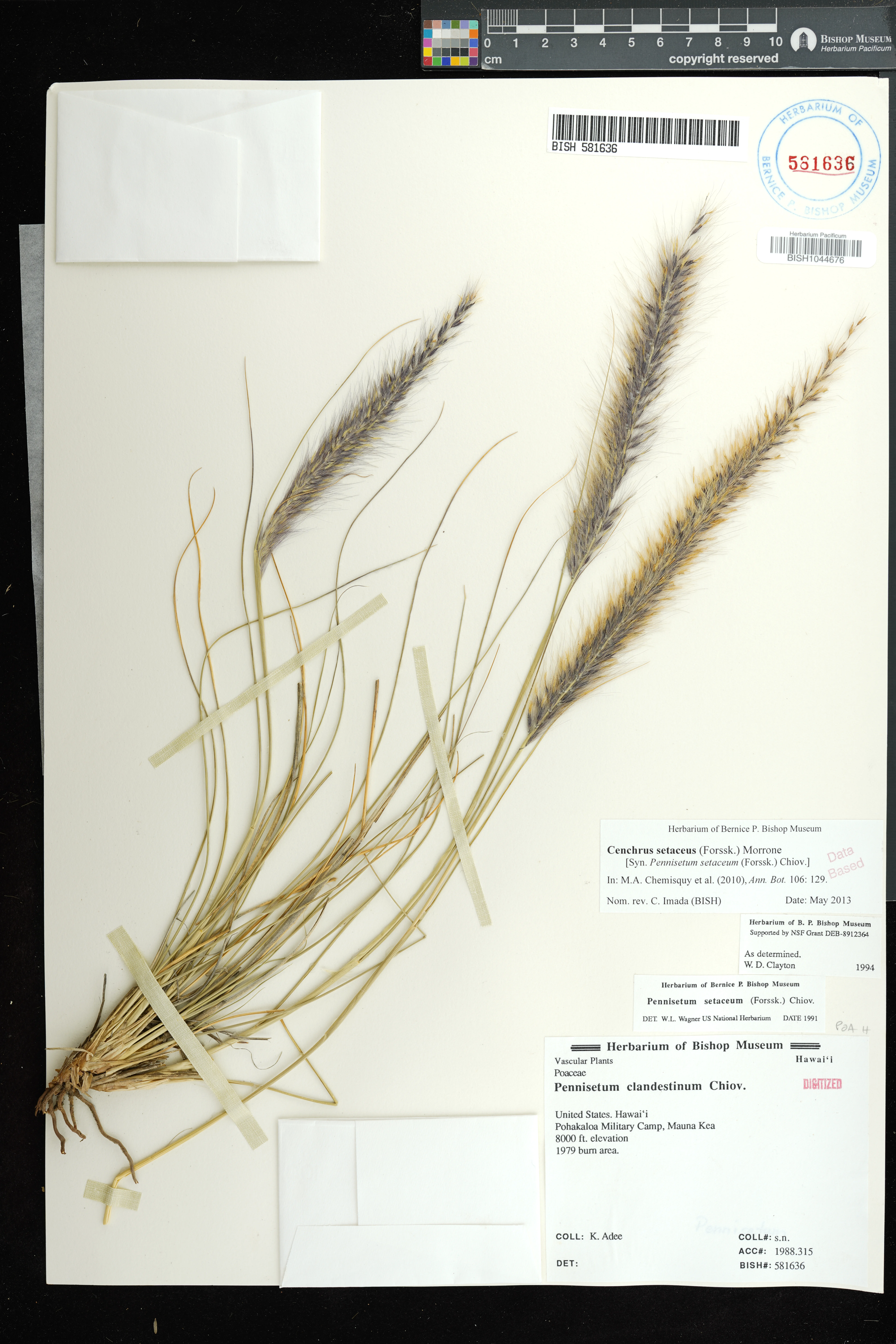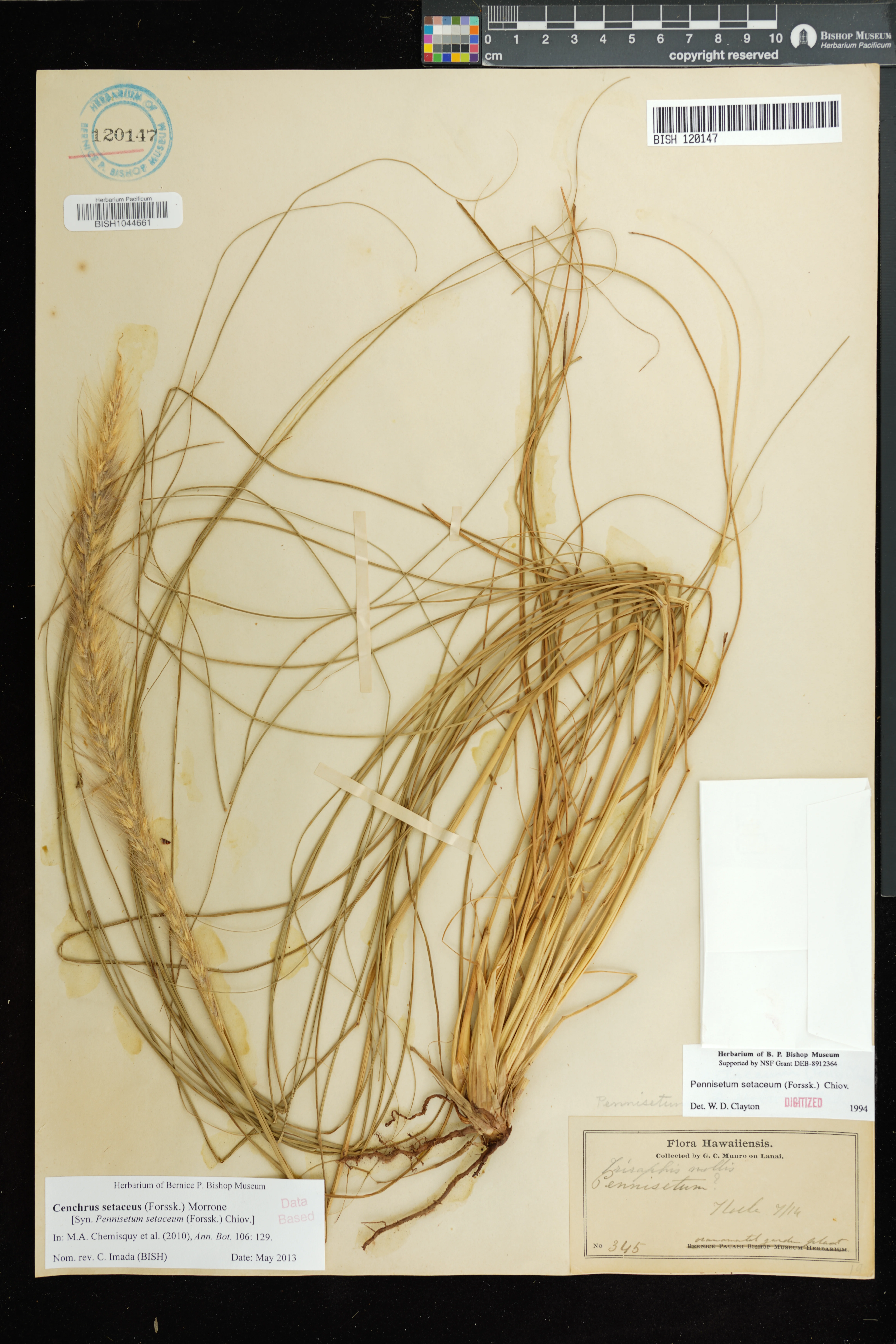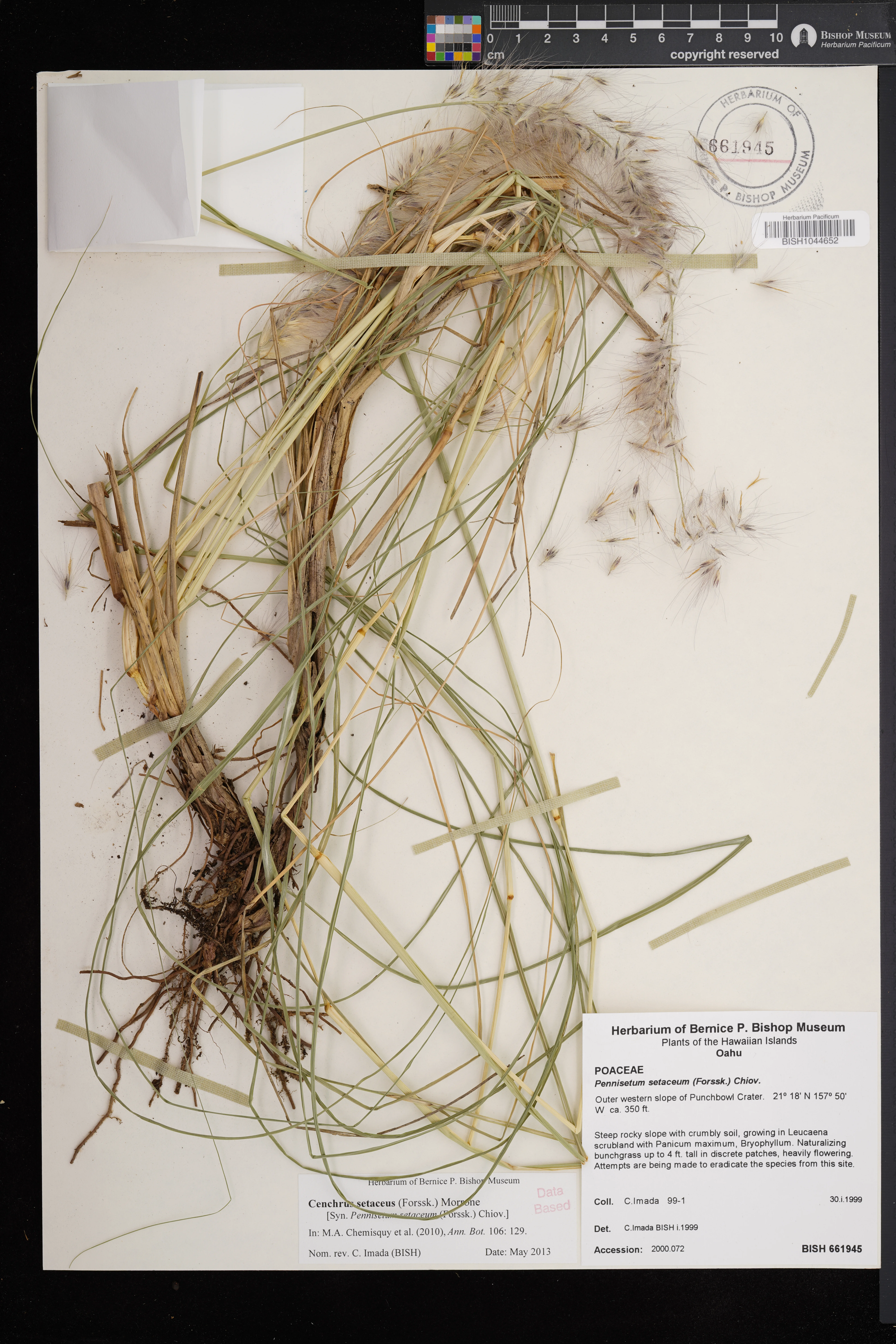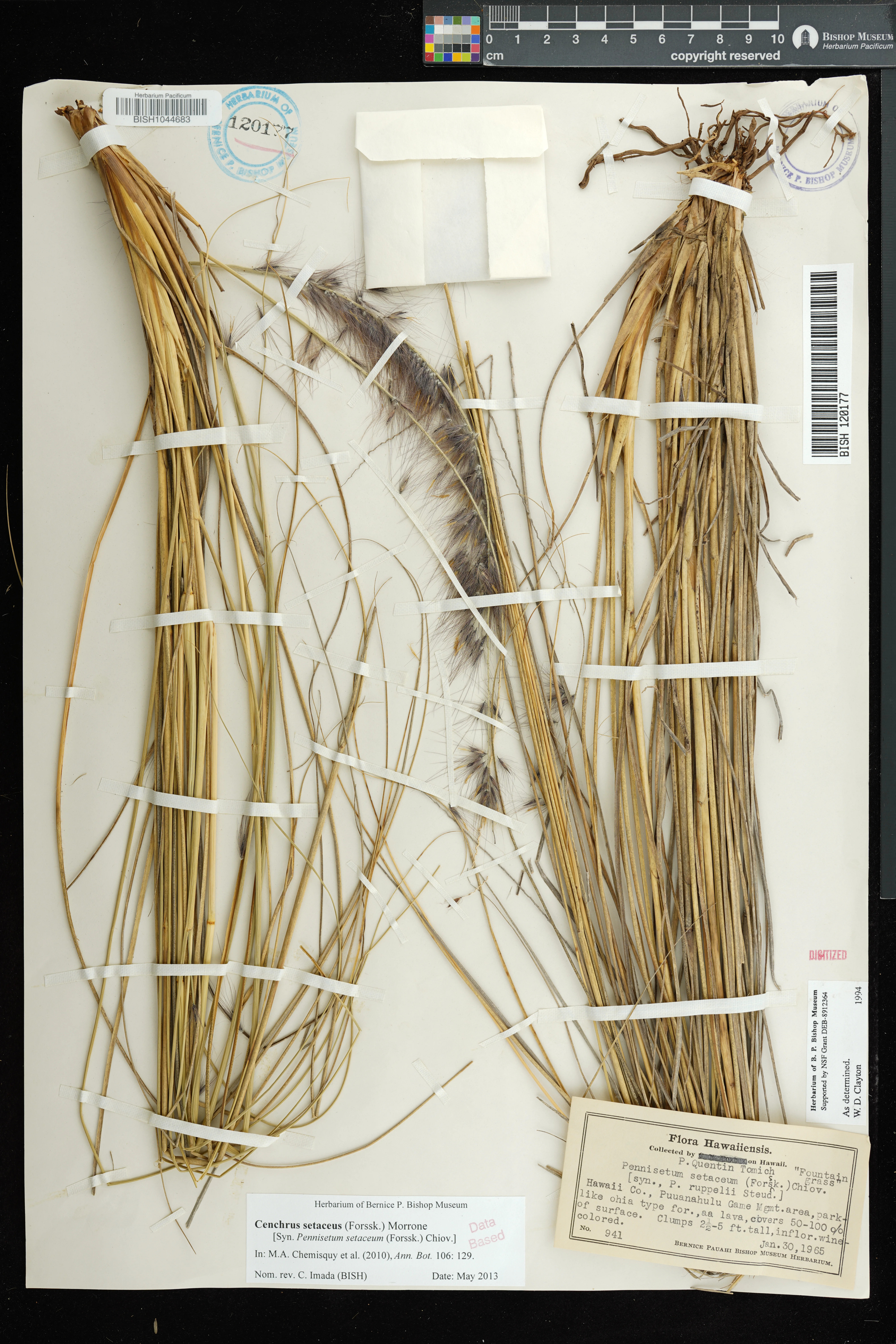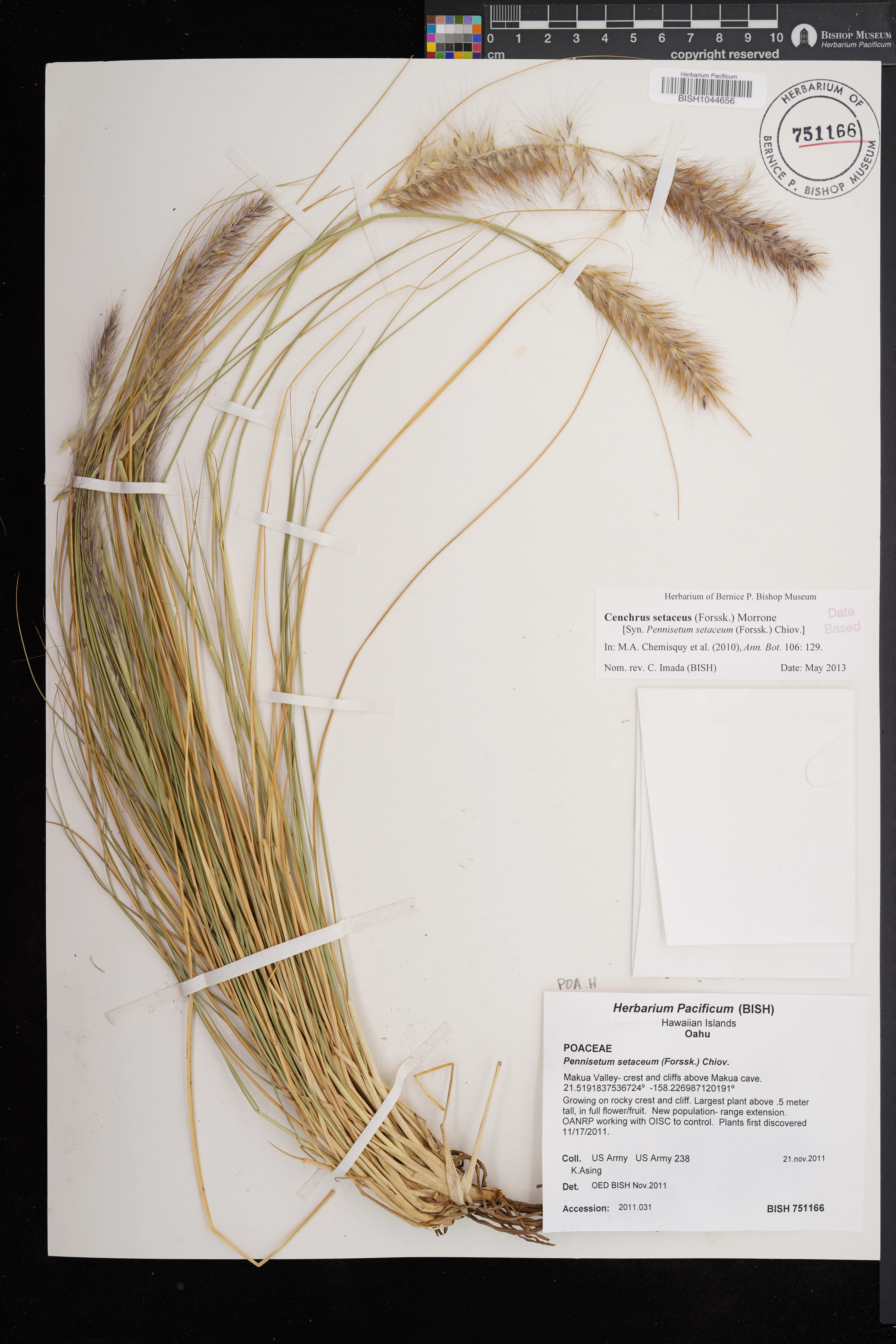 Weedy bunchgrass up to 4 ft. tall on steep rocky slopes, growing with lauae fern, Clerodendrum chinense, Bryophyllum, Psidium, Schinus. |