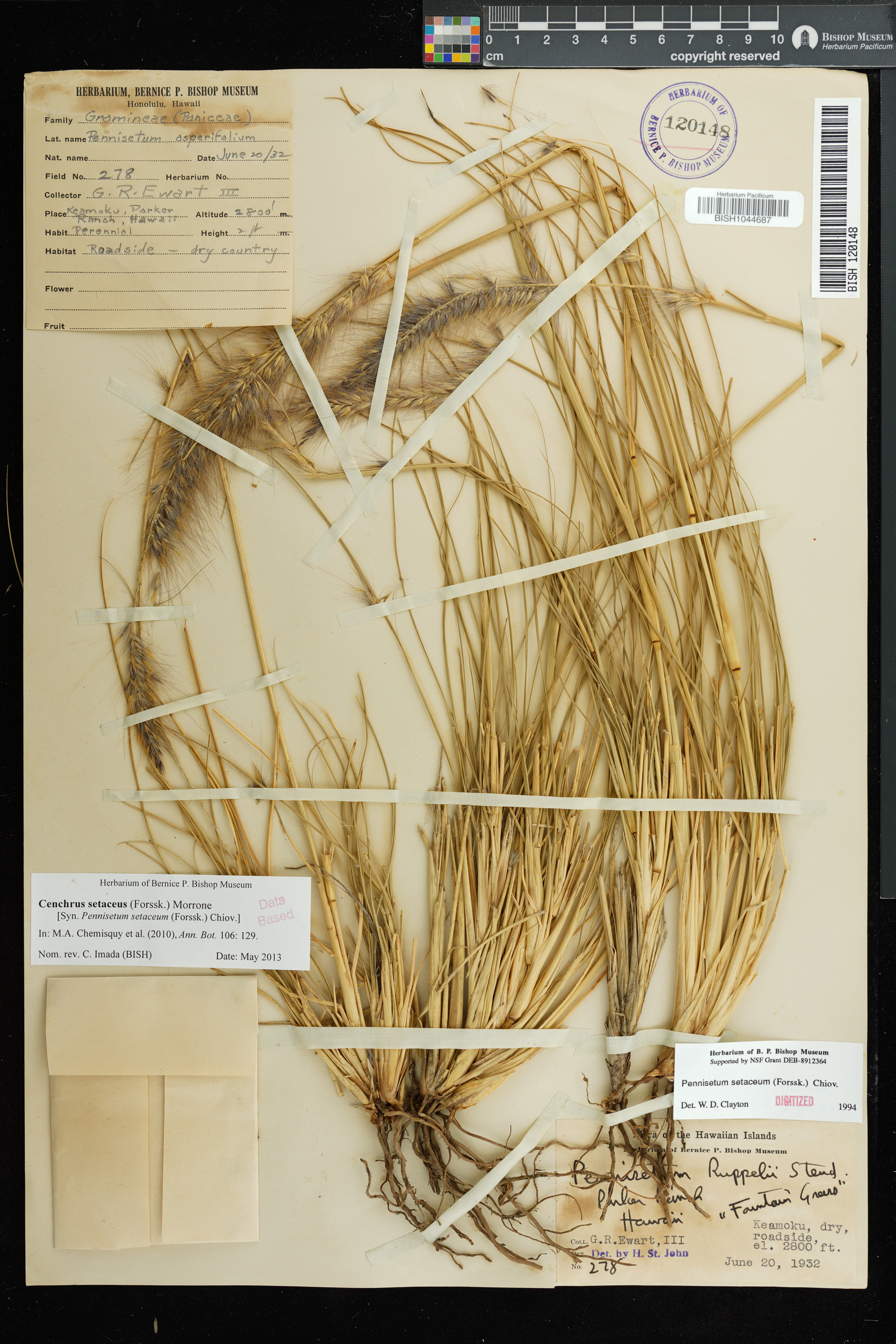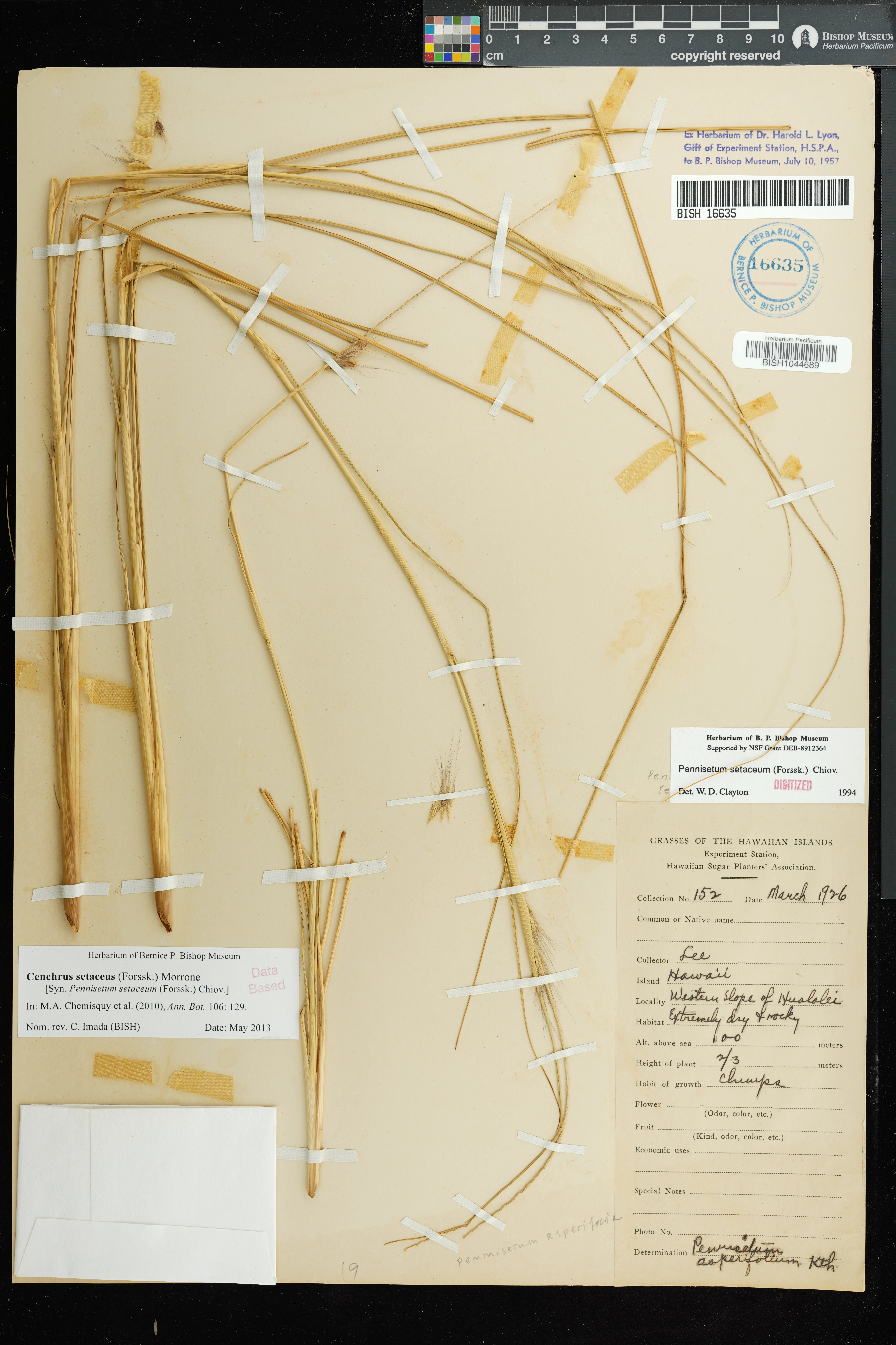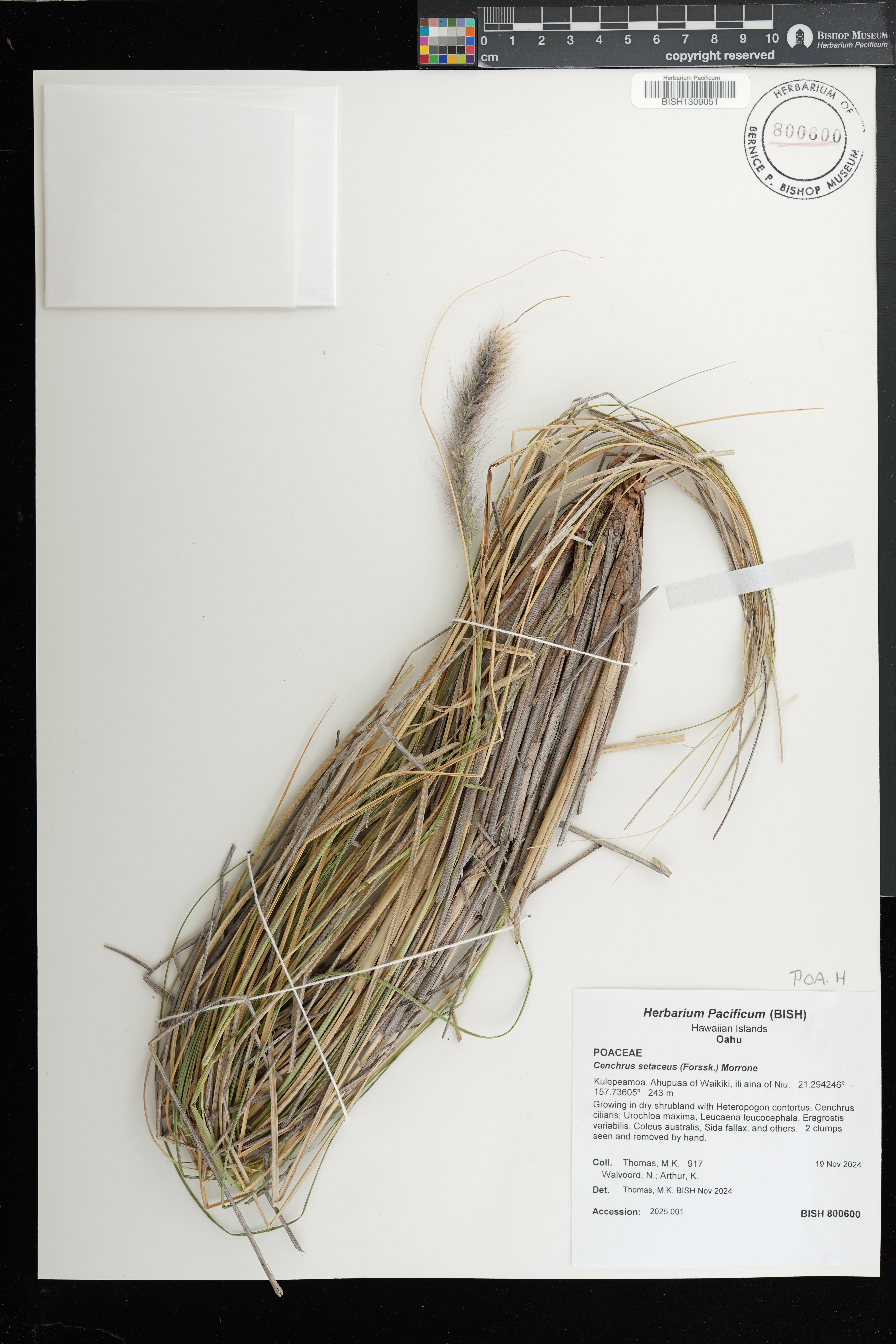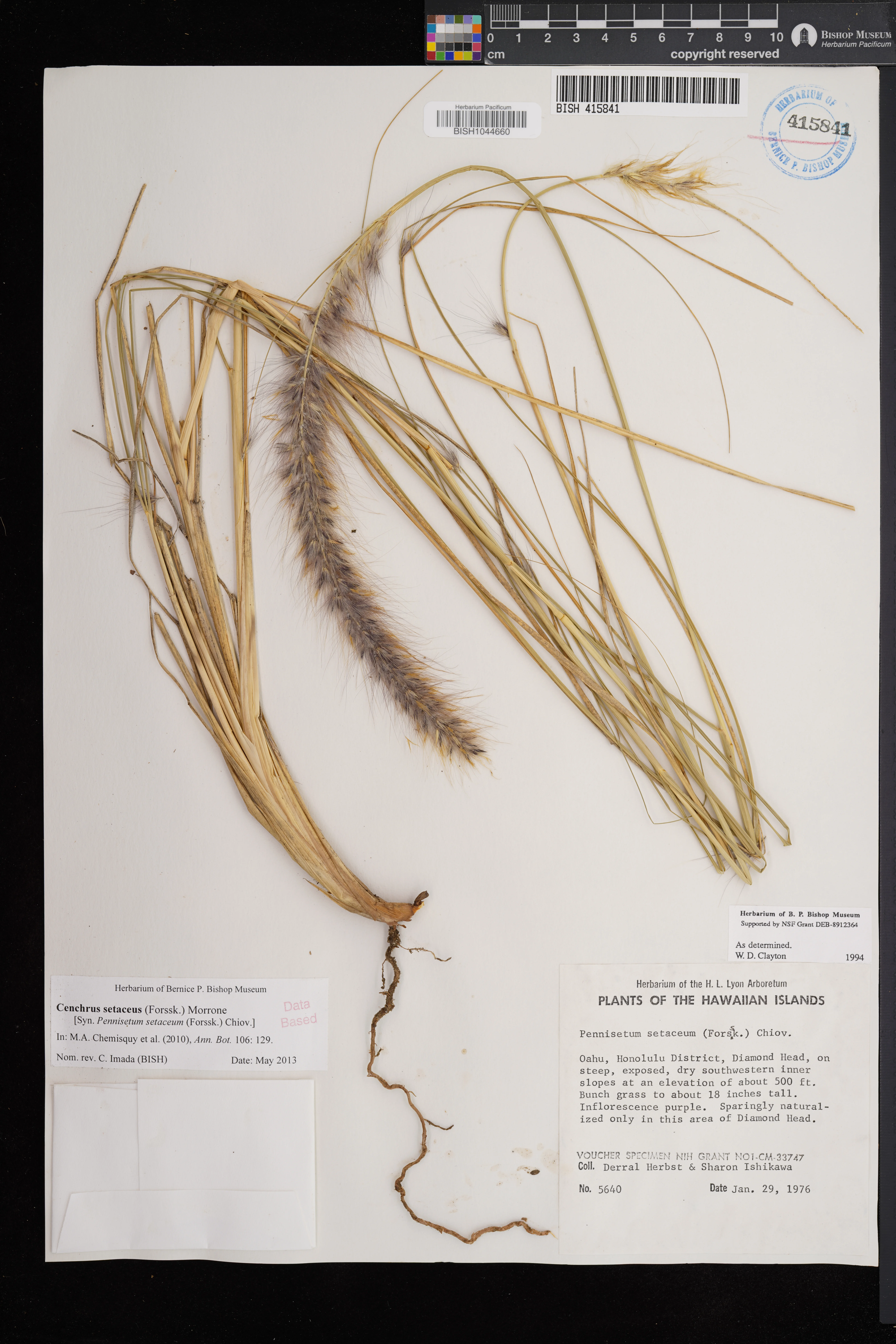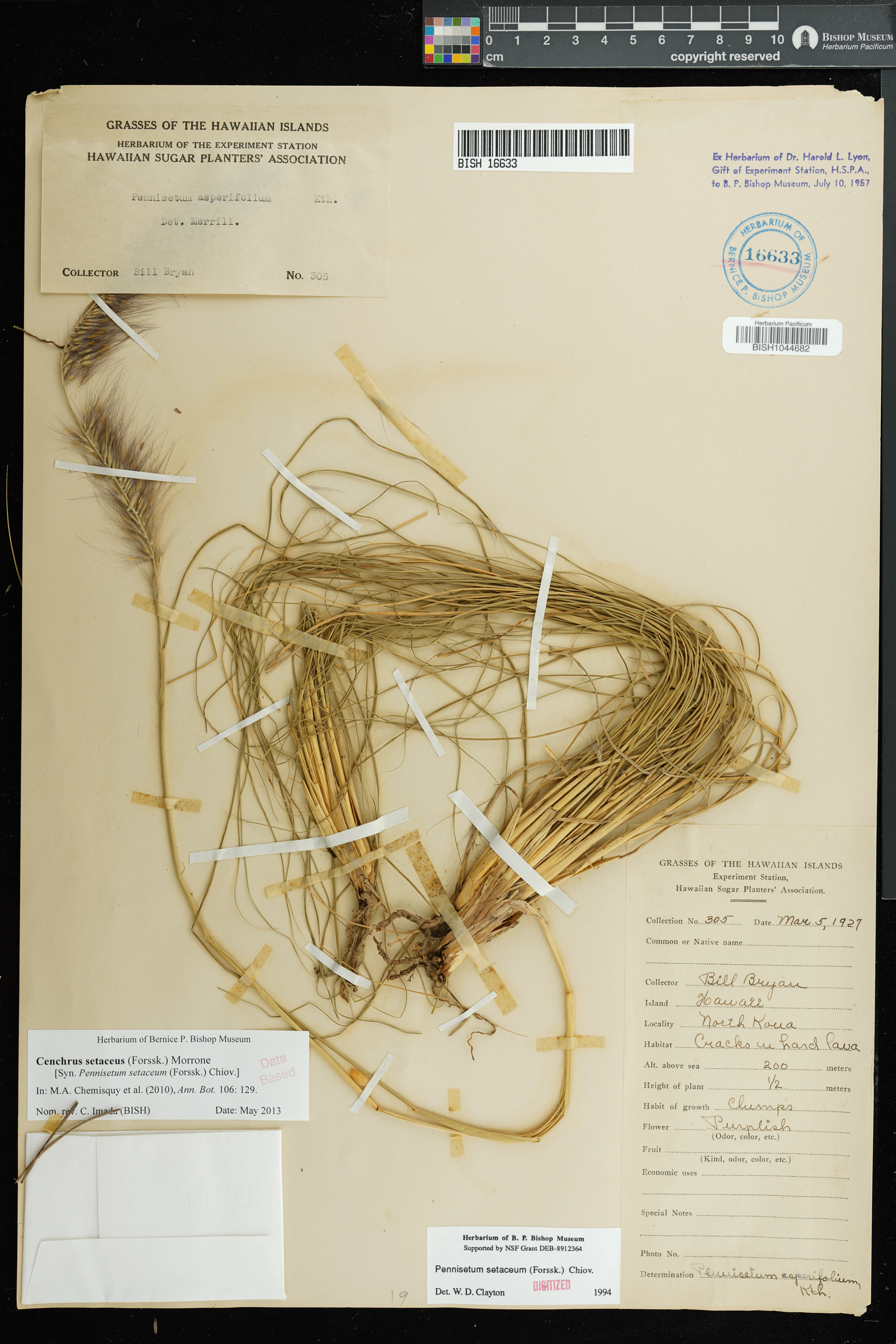Weedy bunchgrass up to 4 ft. tall on steep rocky slopes, growing with lauae fern, Clerodendrum chinense, Bryophyllum, Psidium, Schinus. |