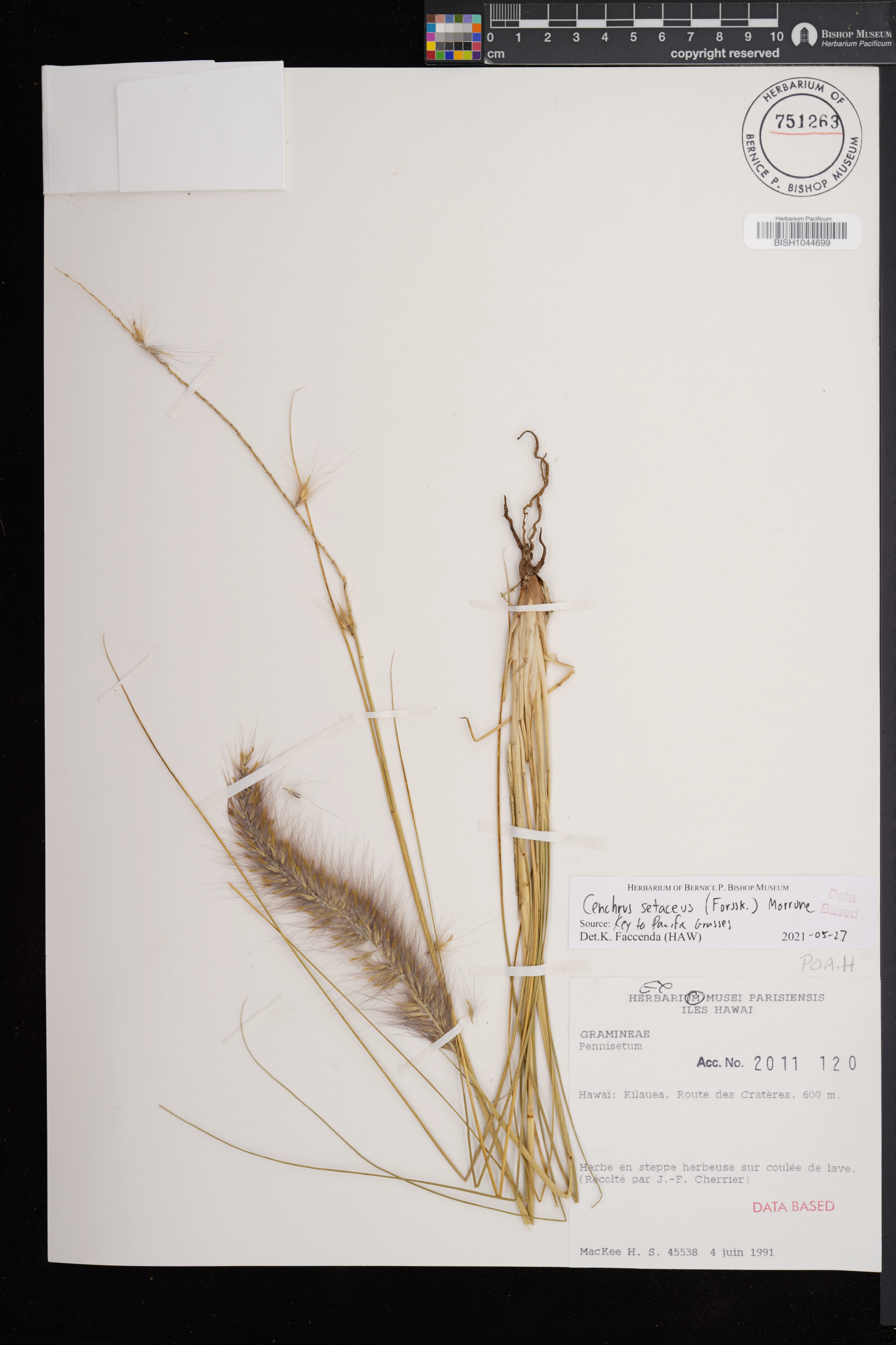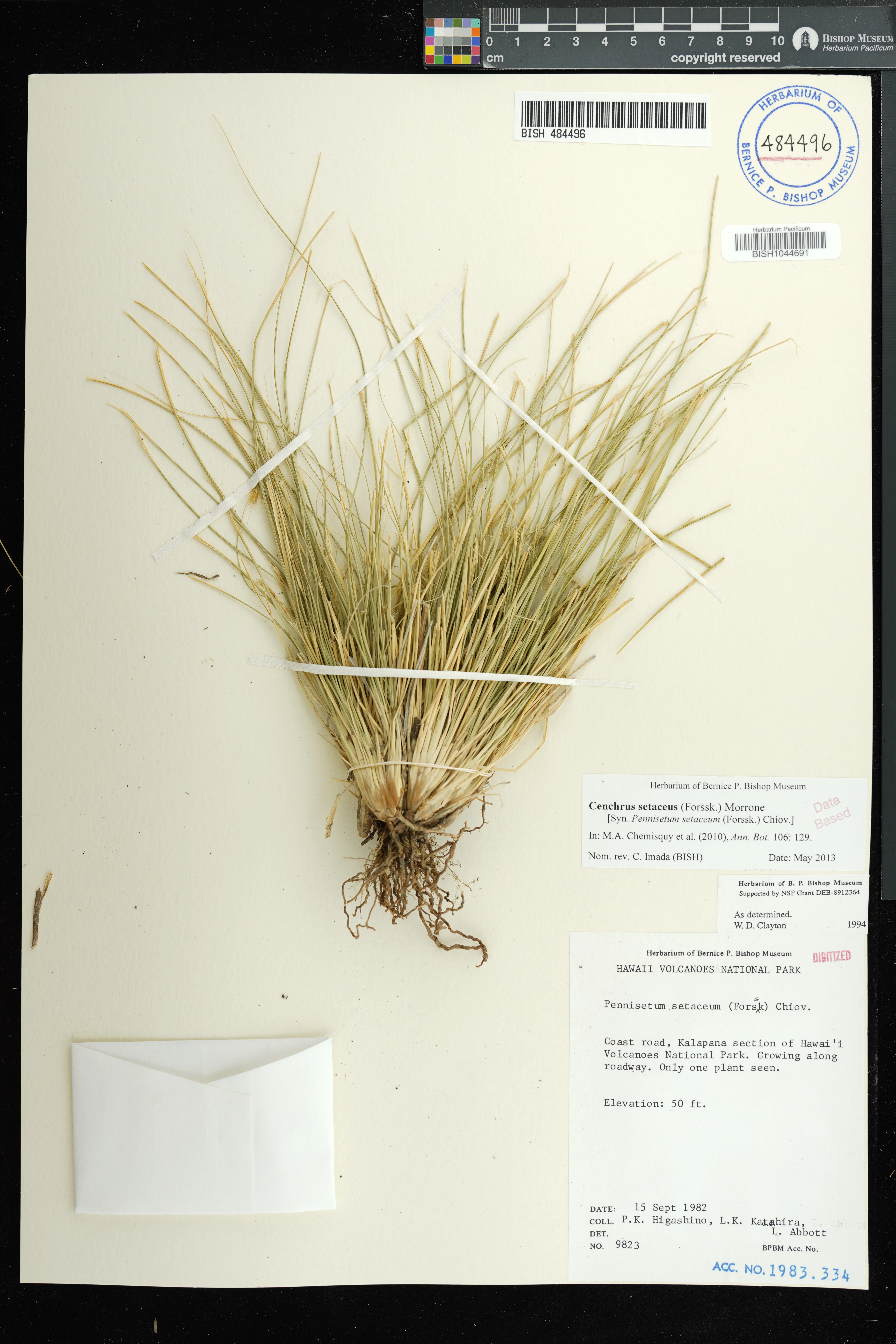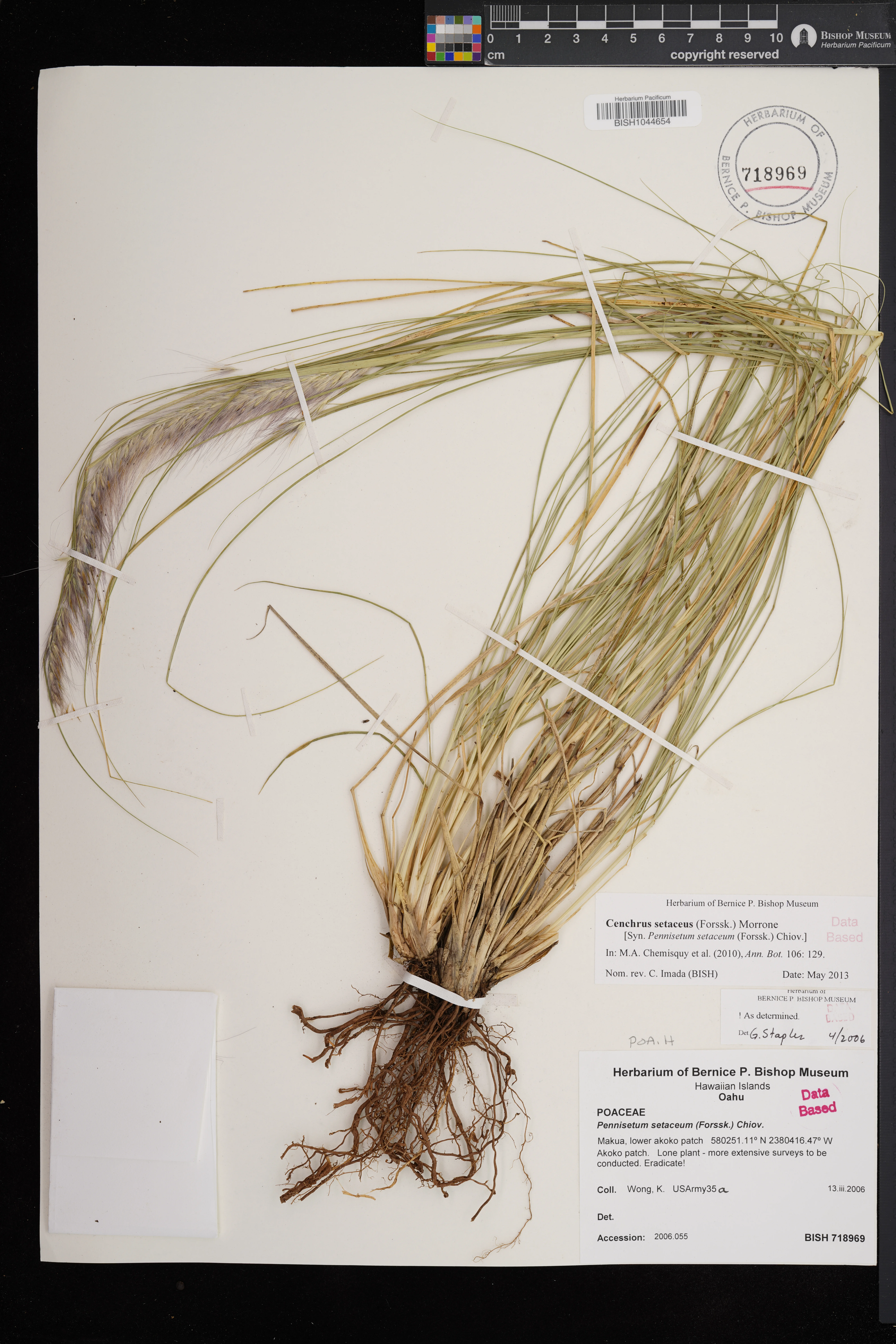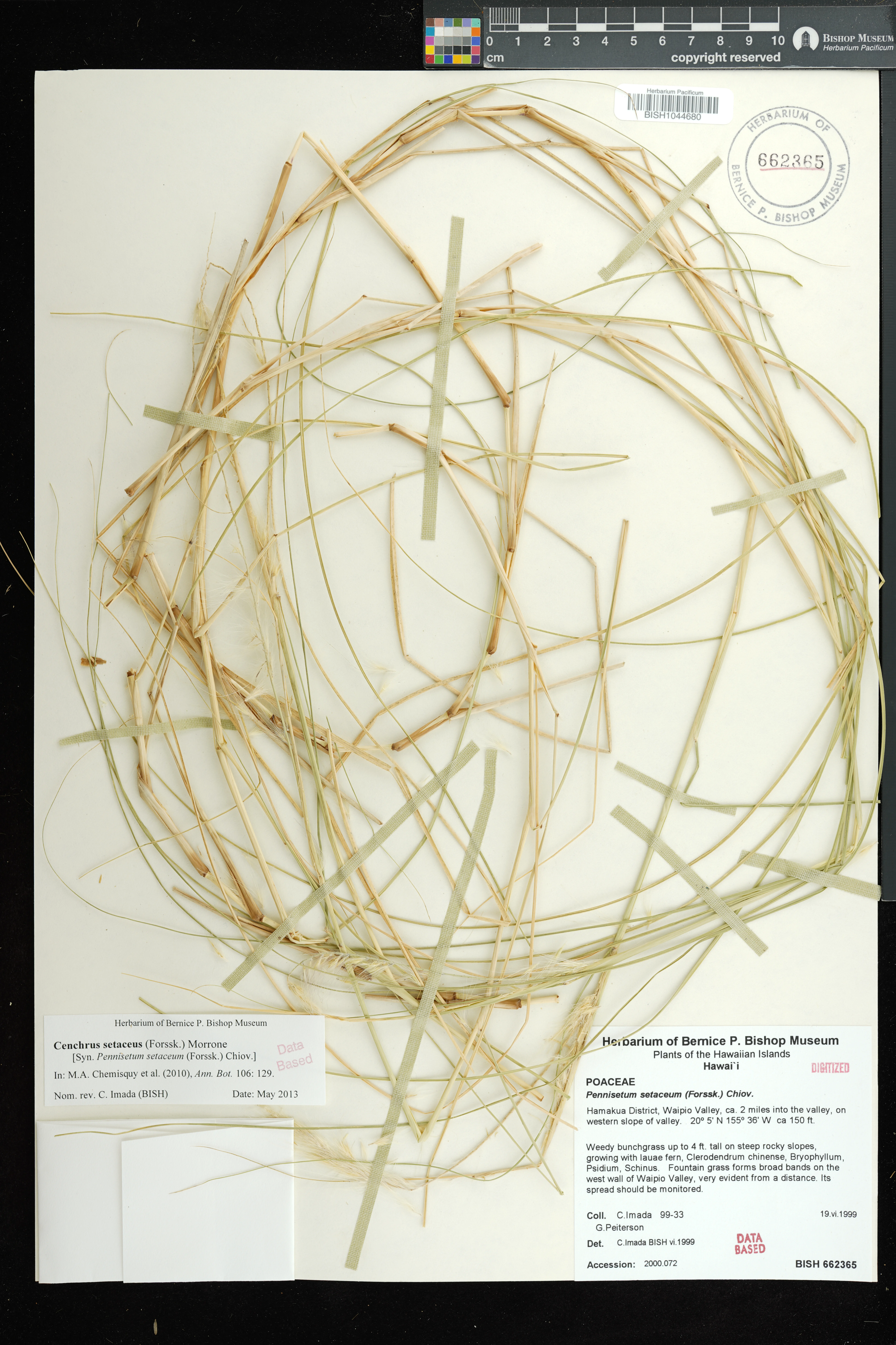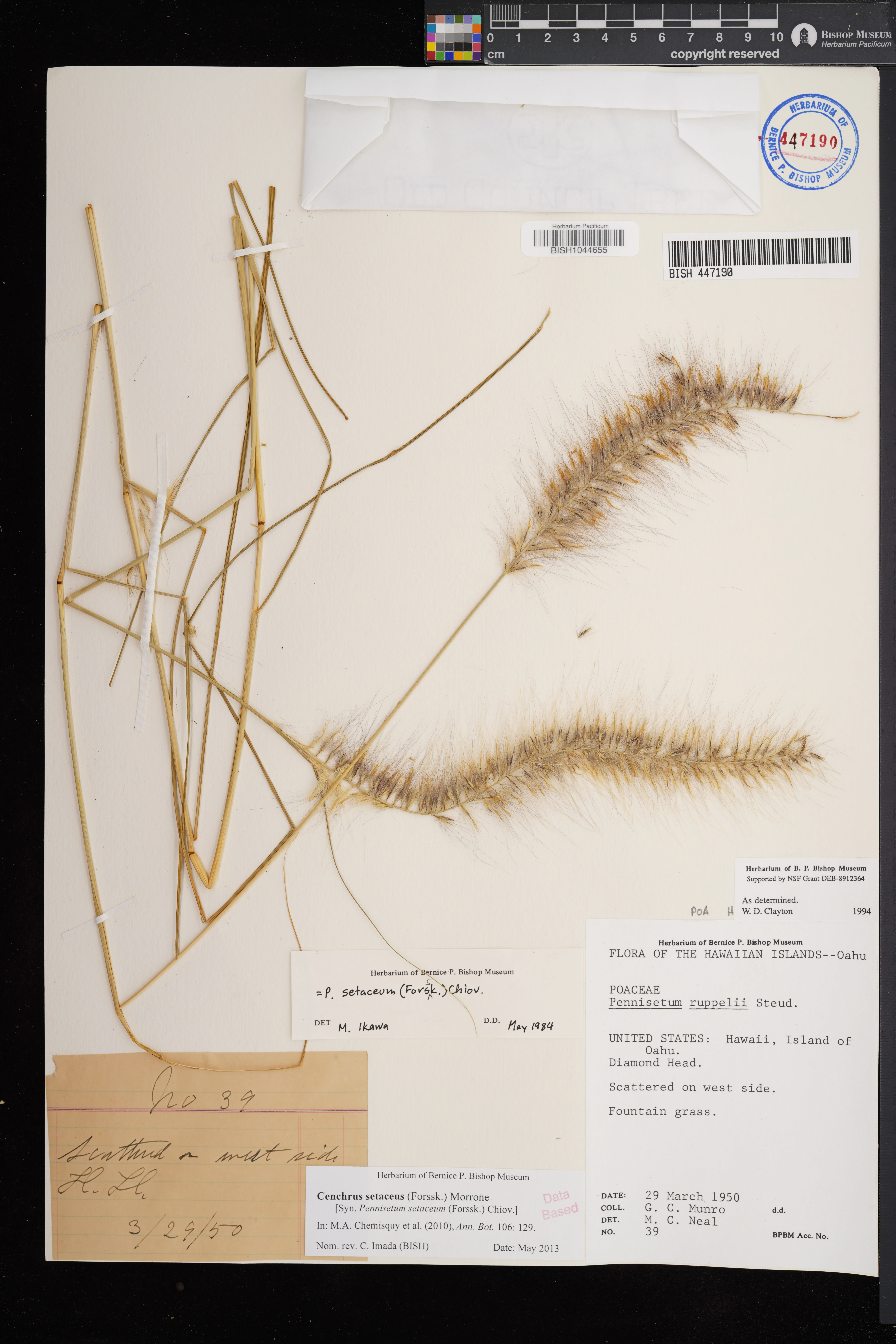 Weedy bunchgrass up to 4 ft. tall on steep rocky slopes, growing with lauae fern, Clerodendrum chinense, Bryophyllum, Psidium, Schinus. |
