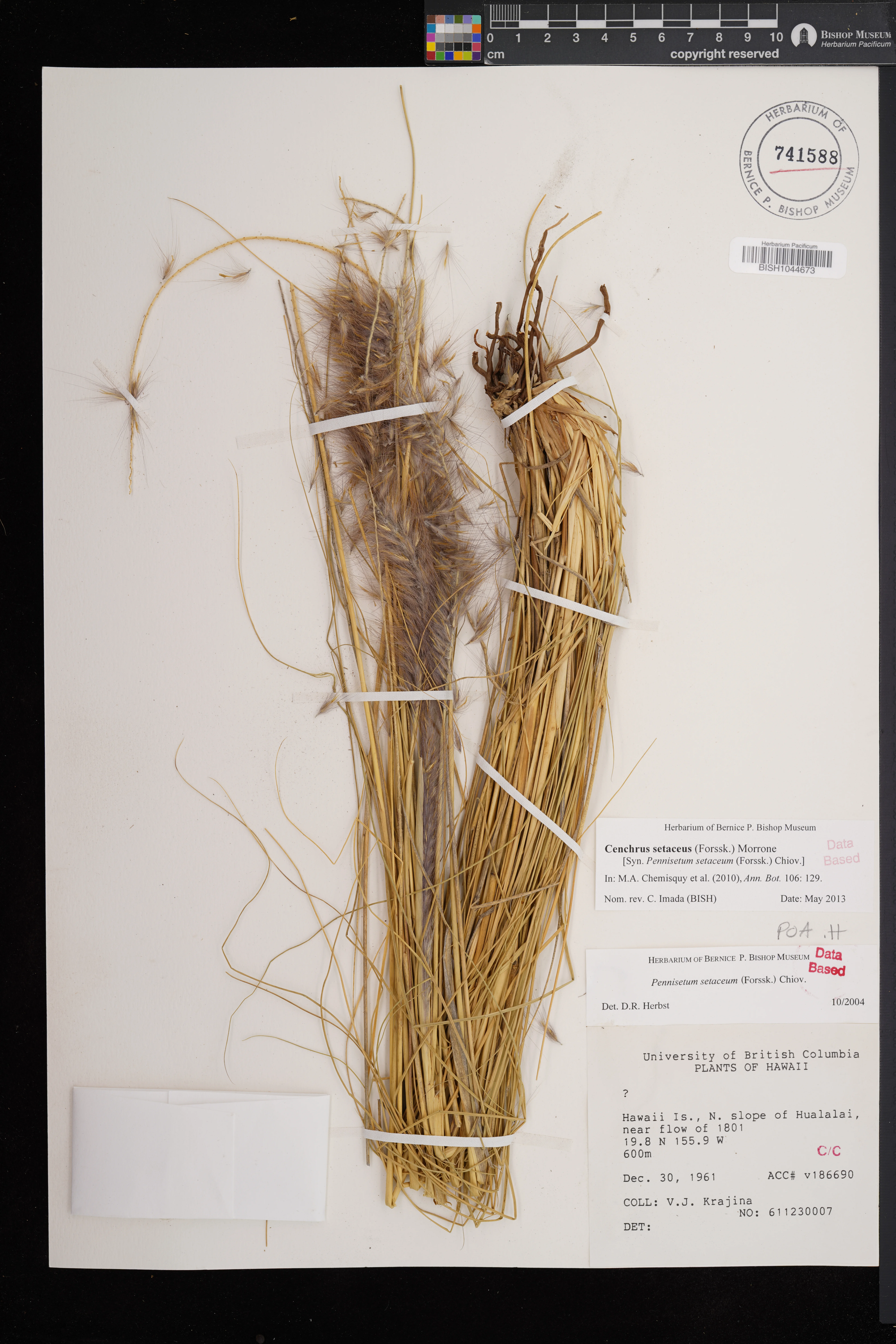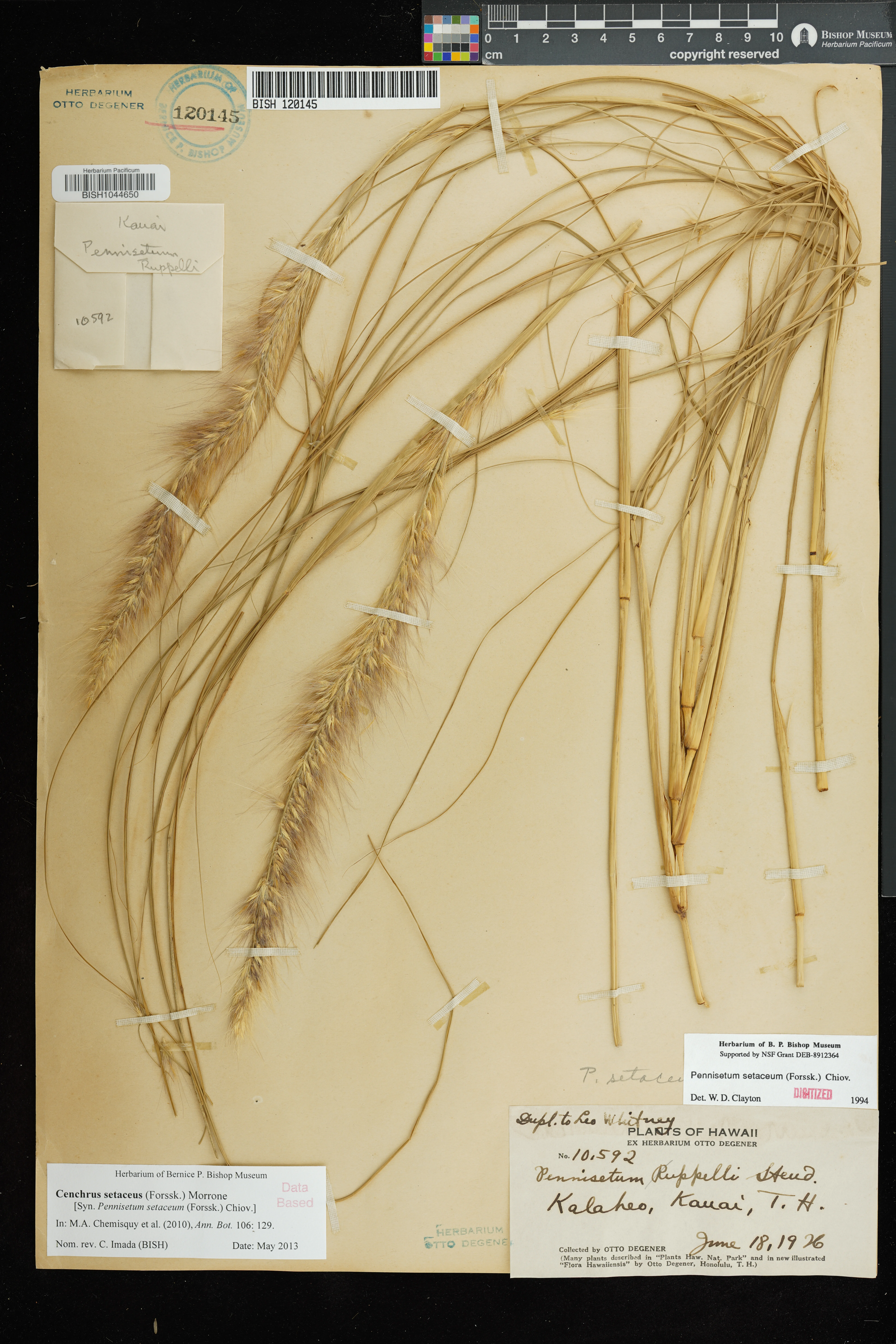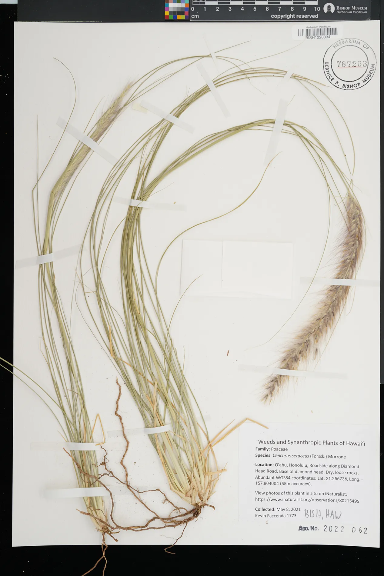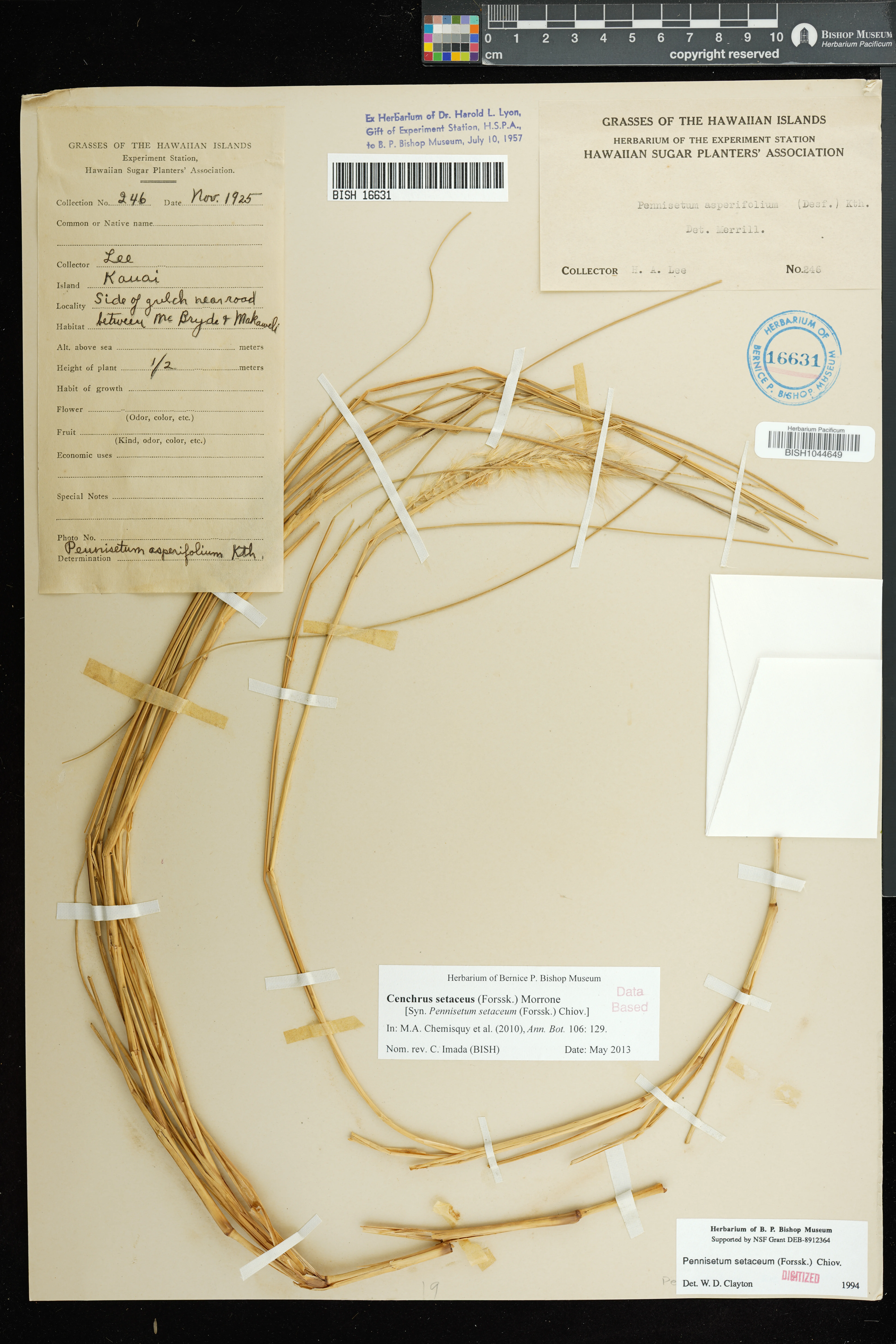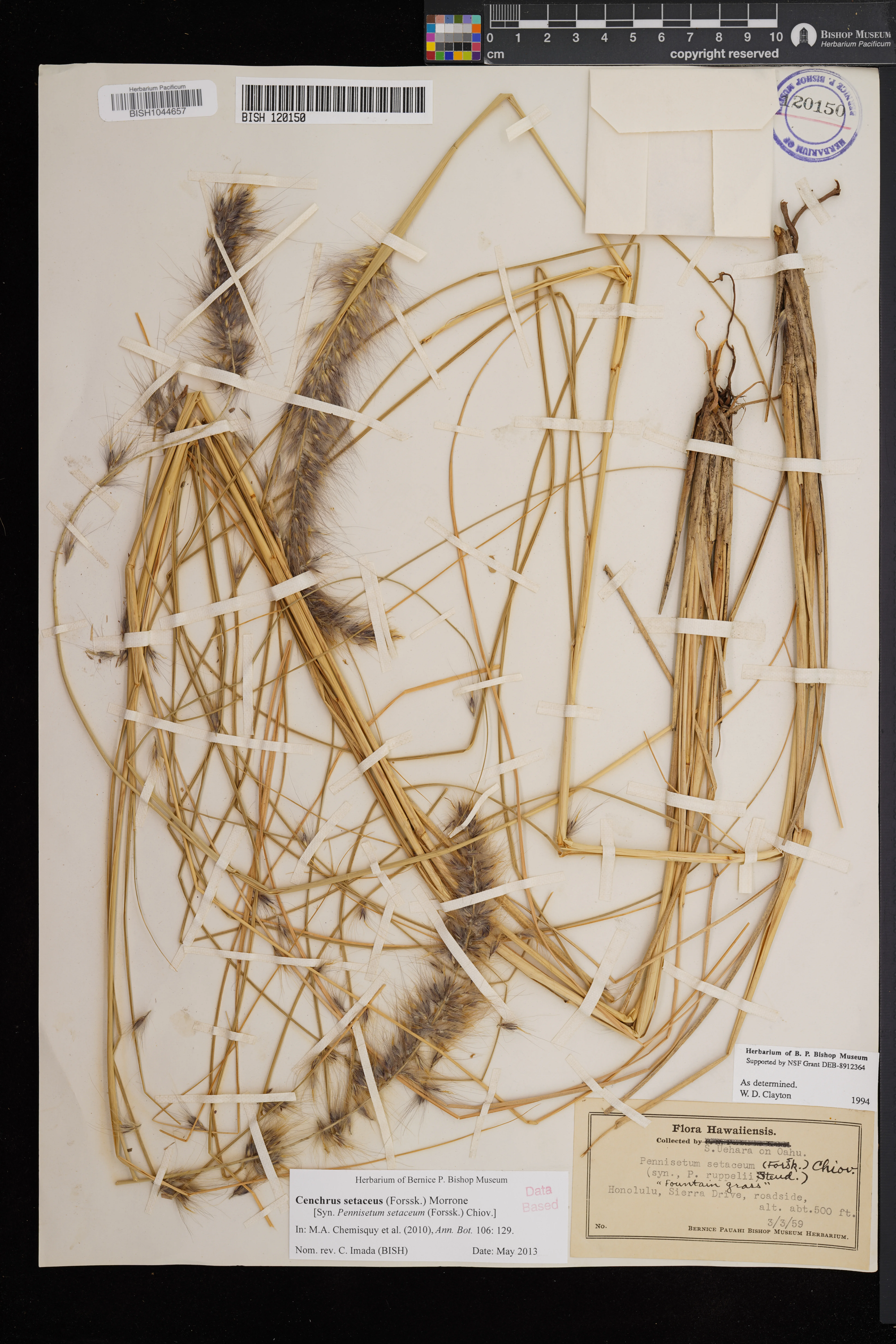 Weedy bunchgrass up to 4 ft. tall on steep rocky slopes, growing with lauae fern, Clerodendrum chinense, Bryophyllum, Psidium, Schinus. |
