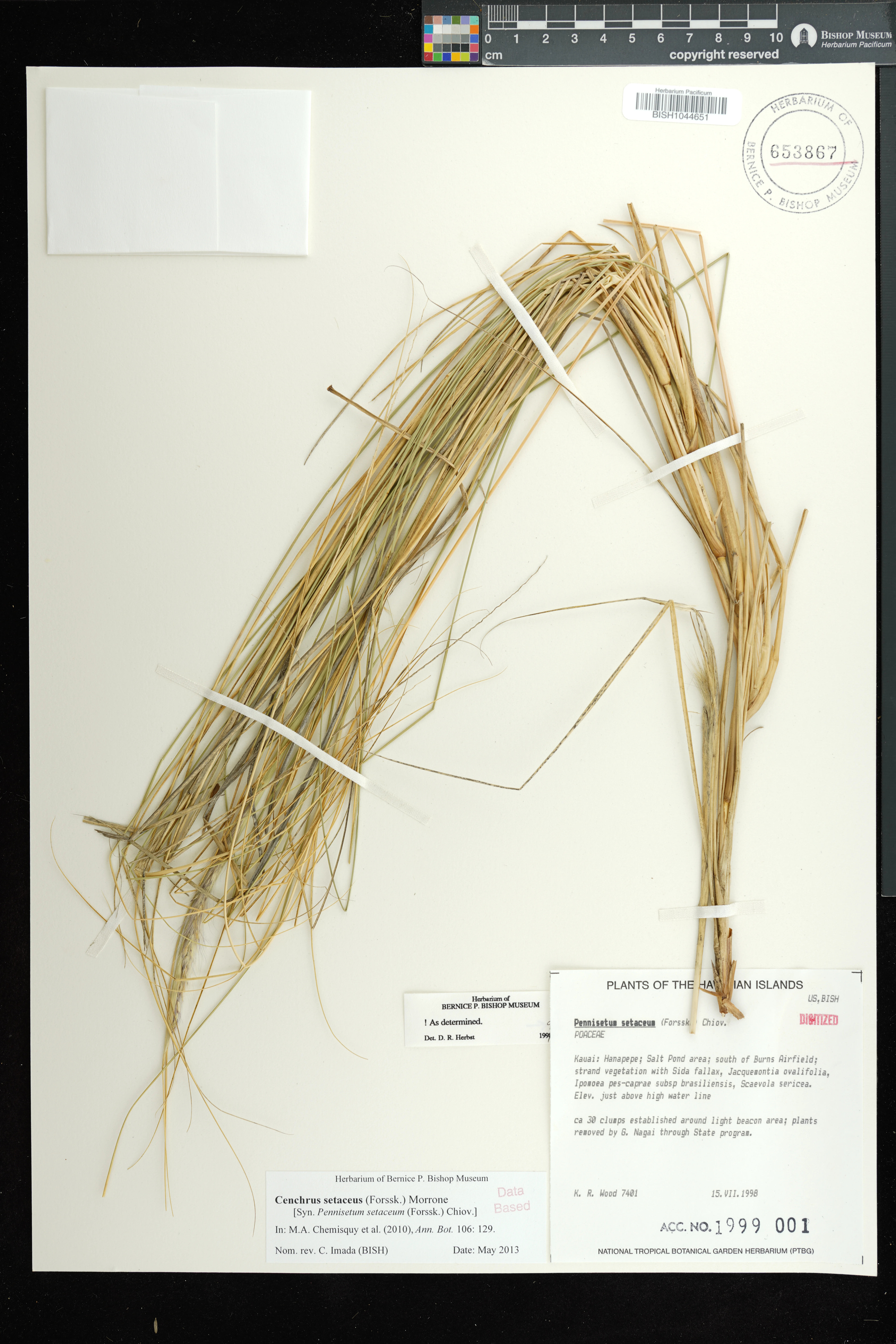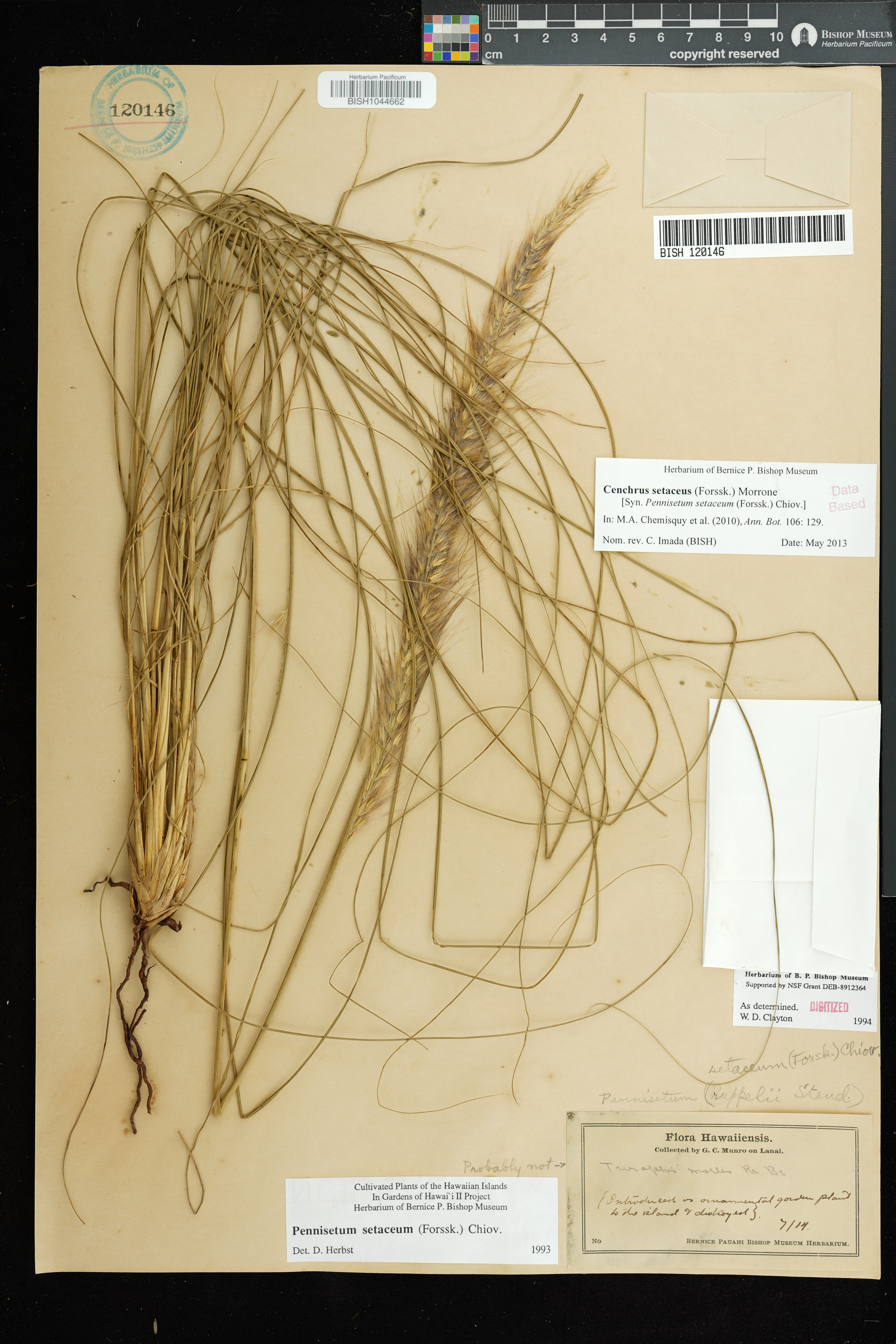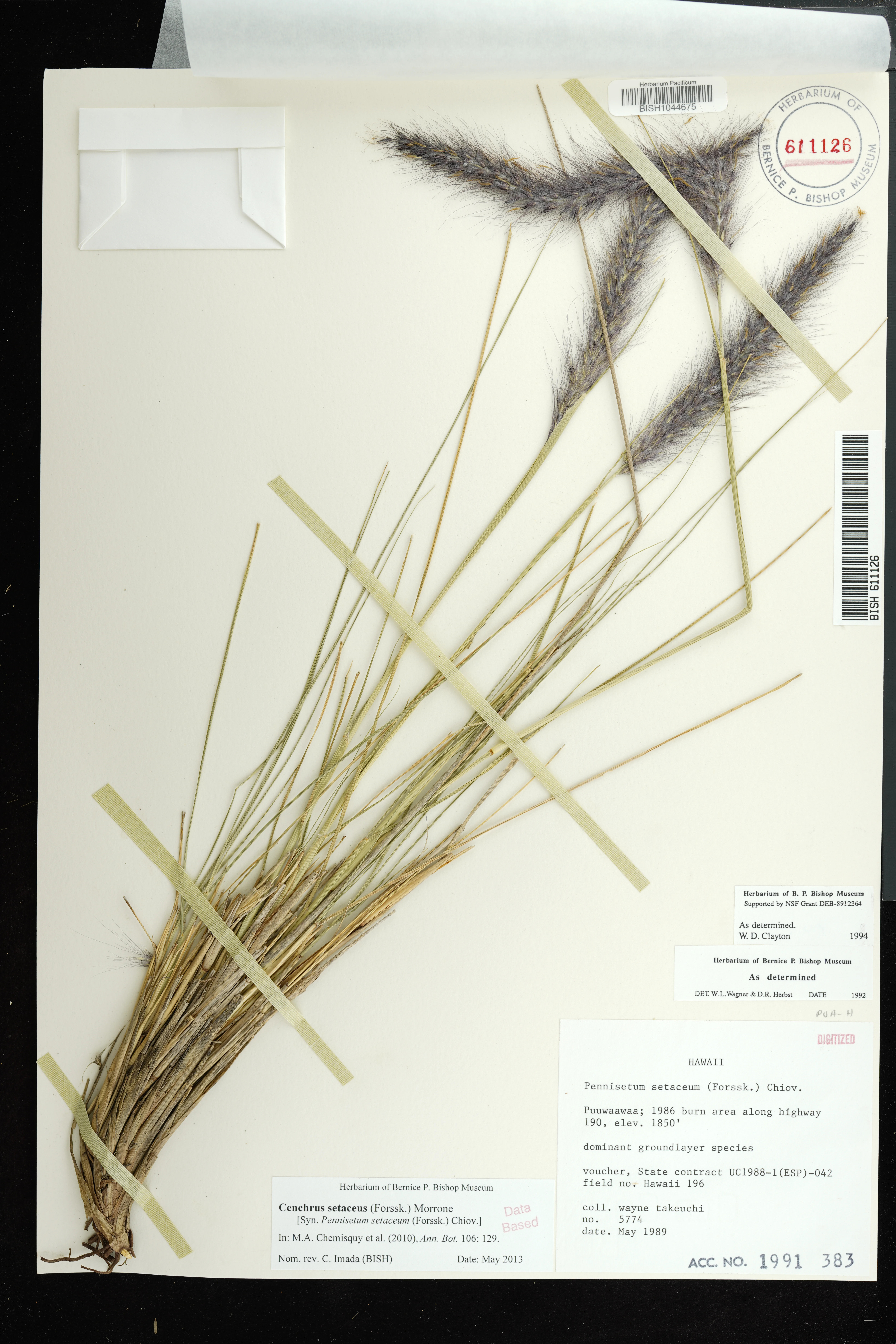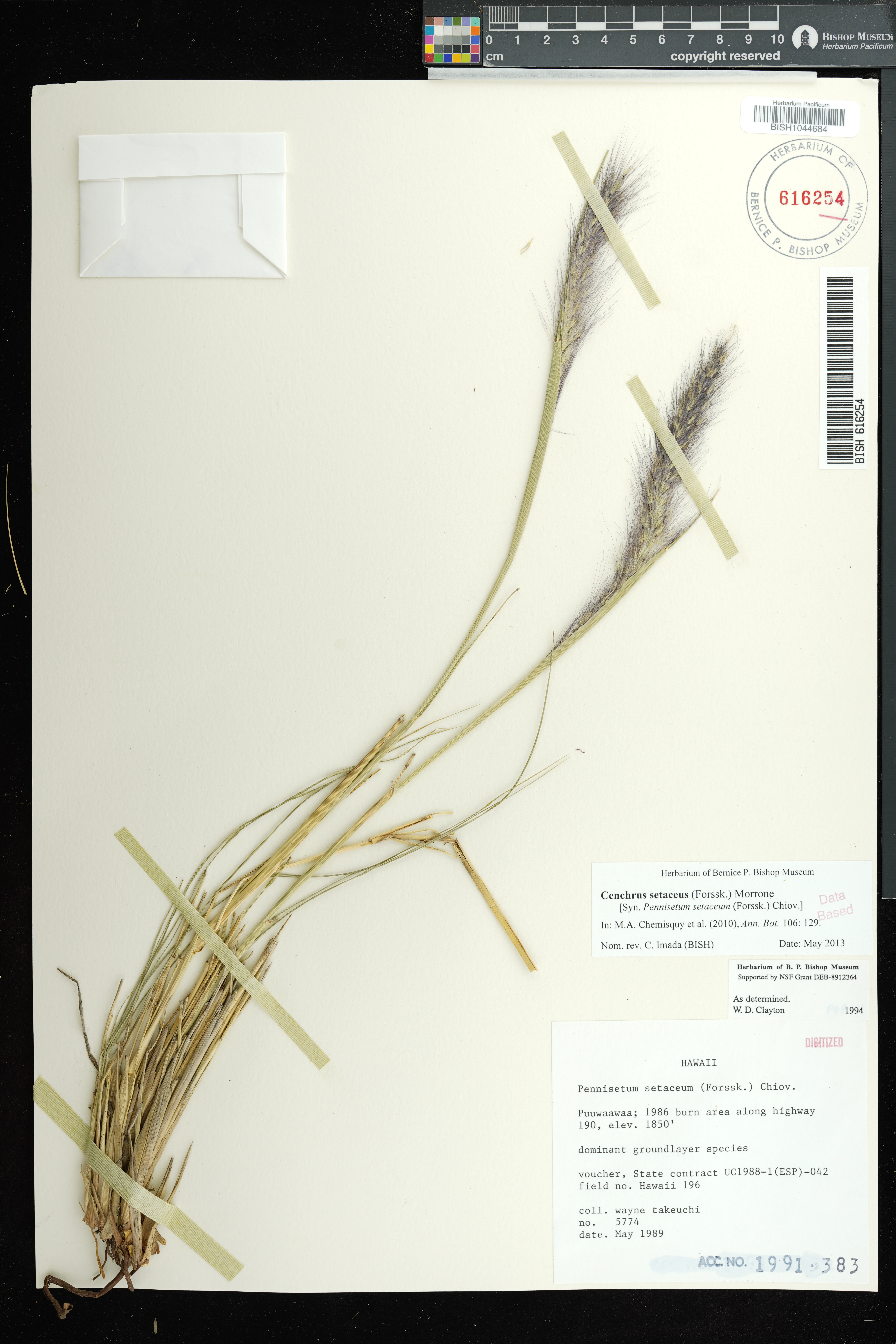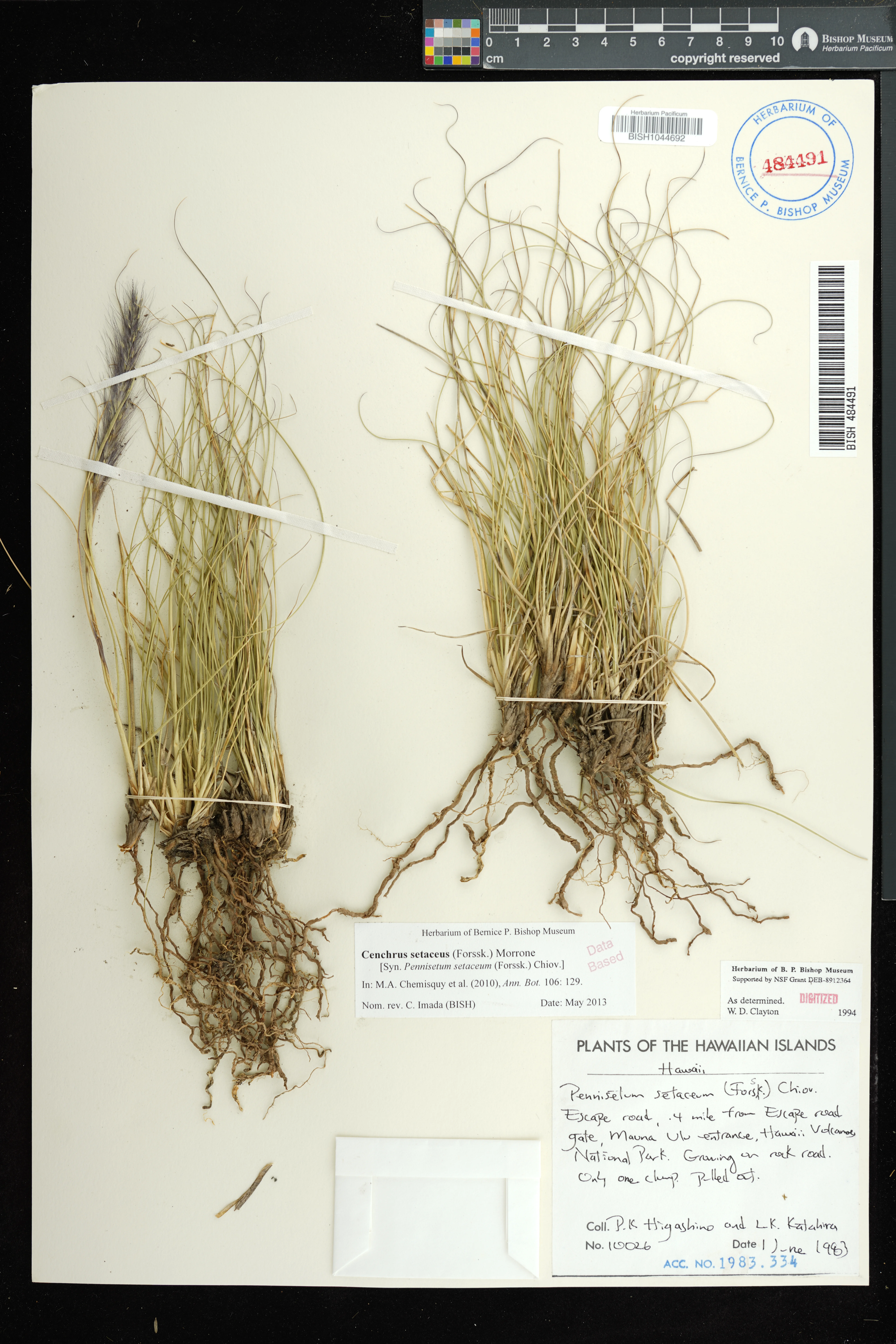 Weedy bunchgrass up to 4 ft. tall on steep rocky slopes, growing with lauae fern, Clerodendrum chinense, Bryophyllum, Psidium, Schinus. |