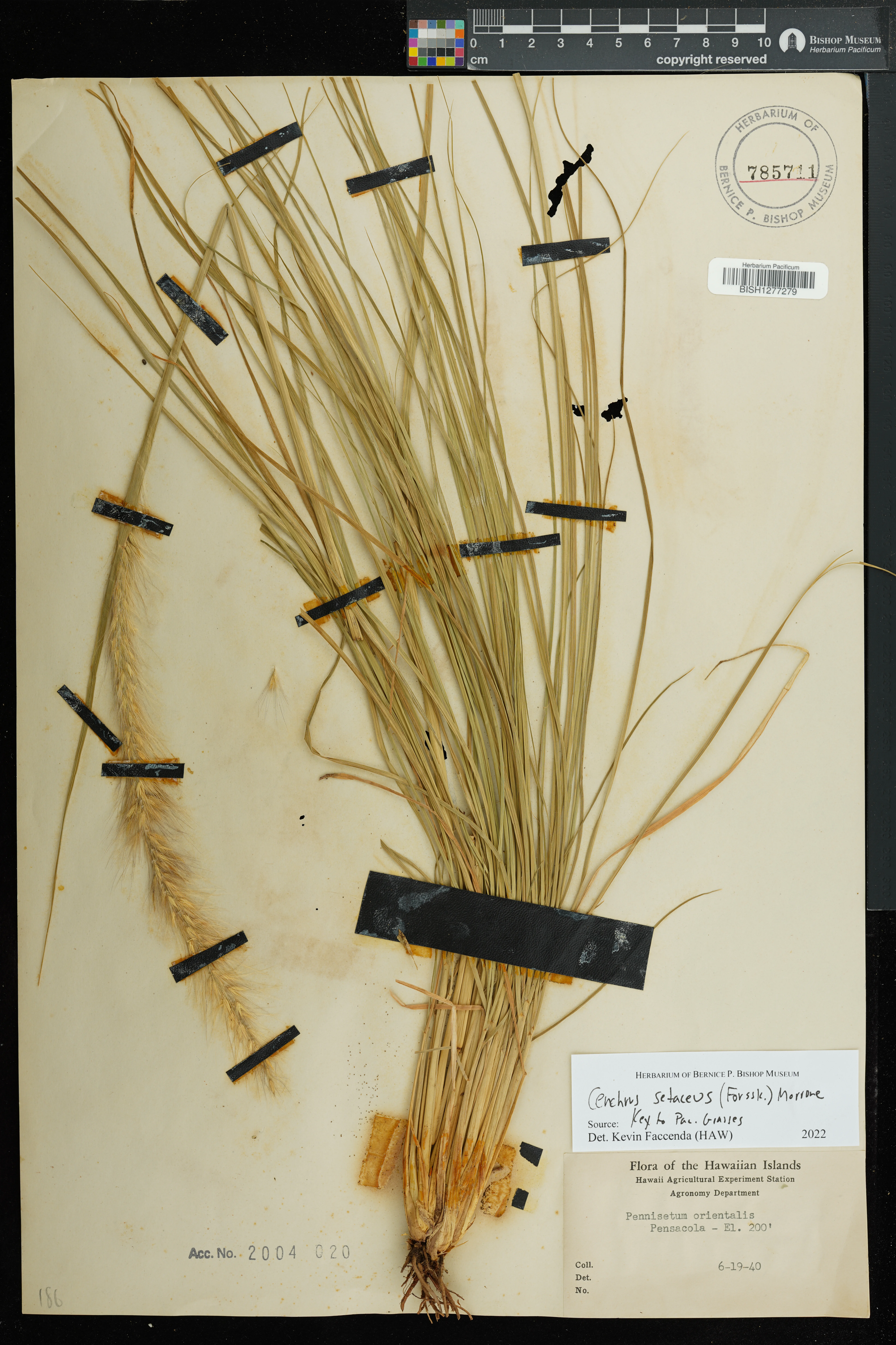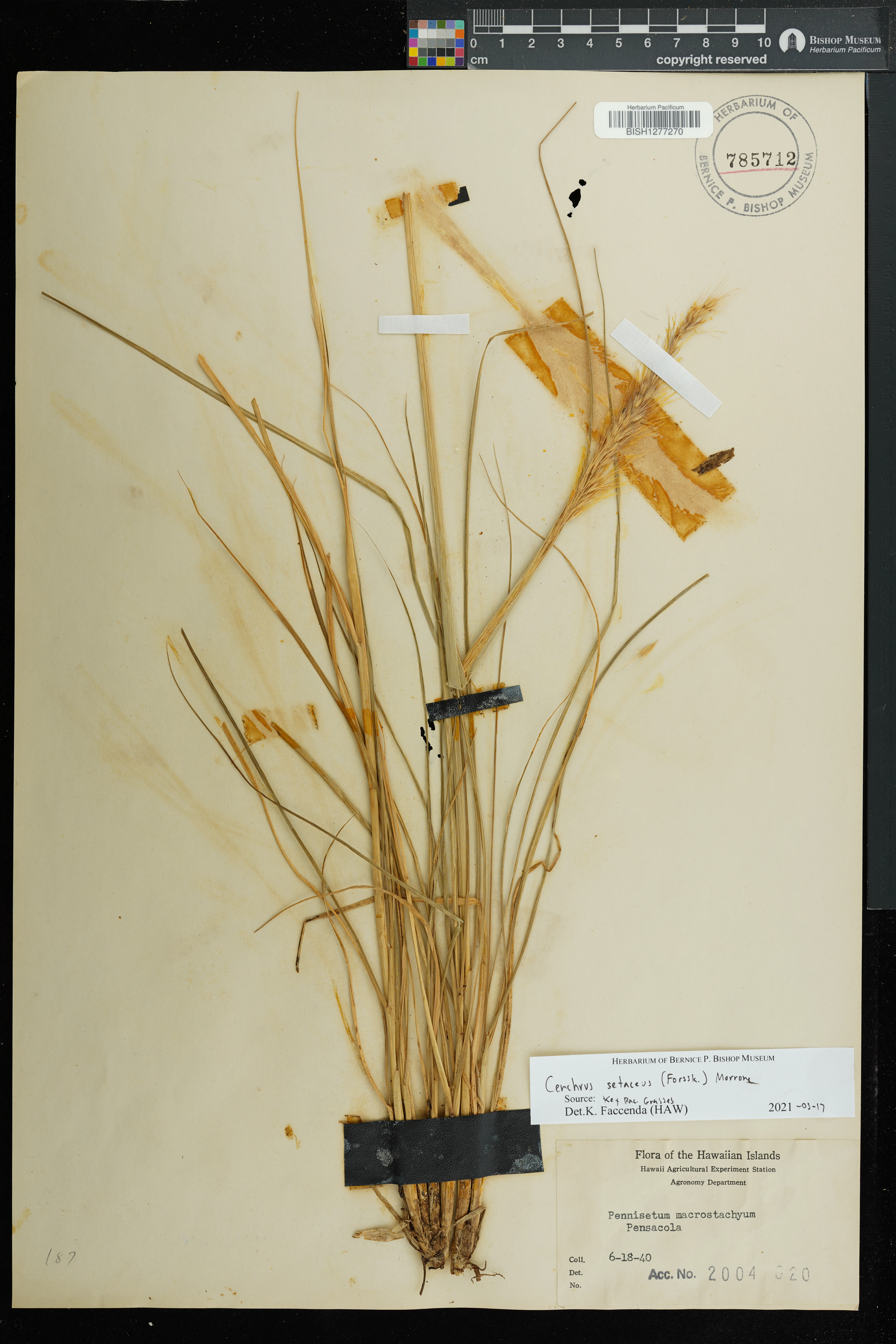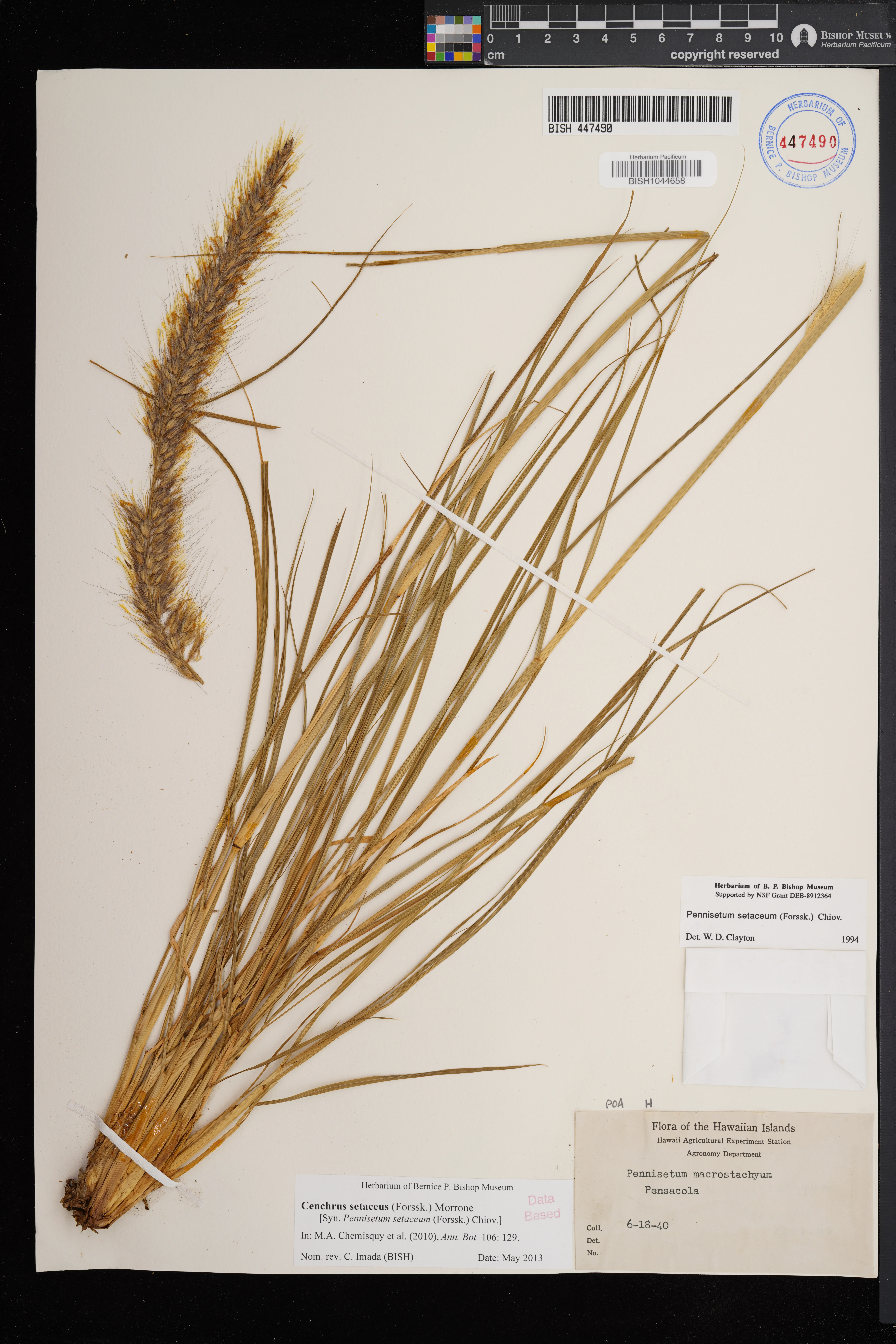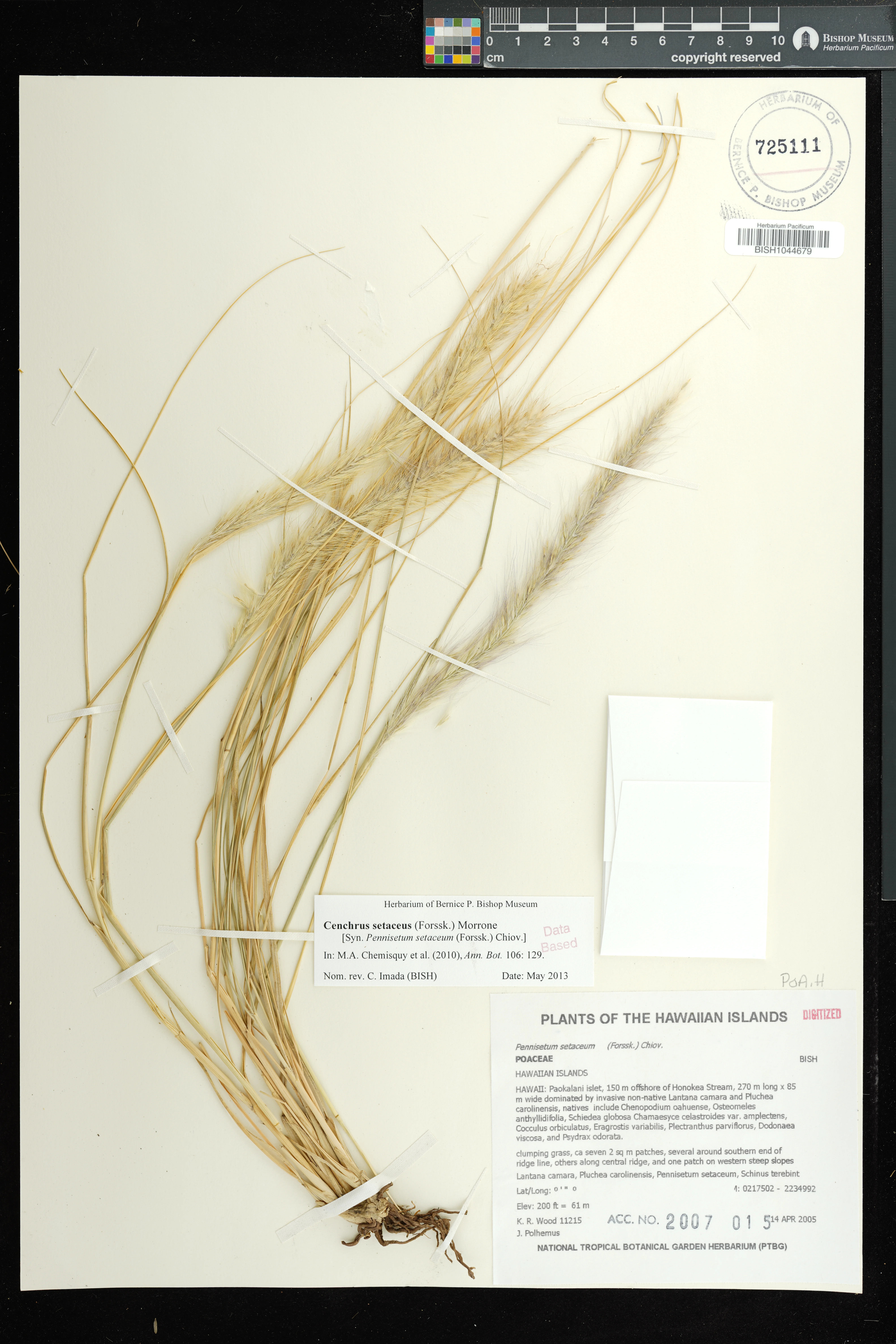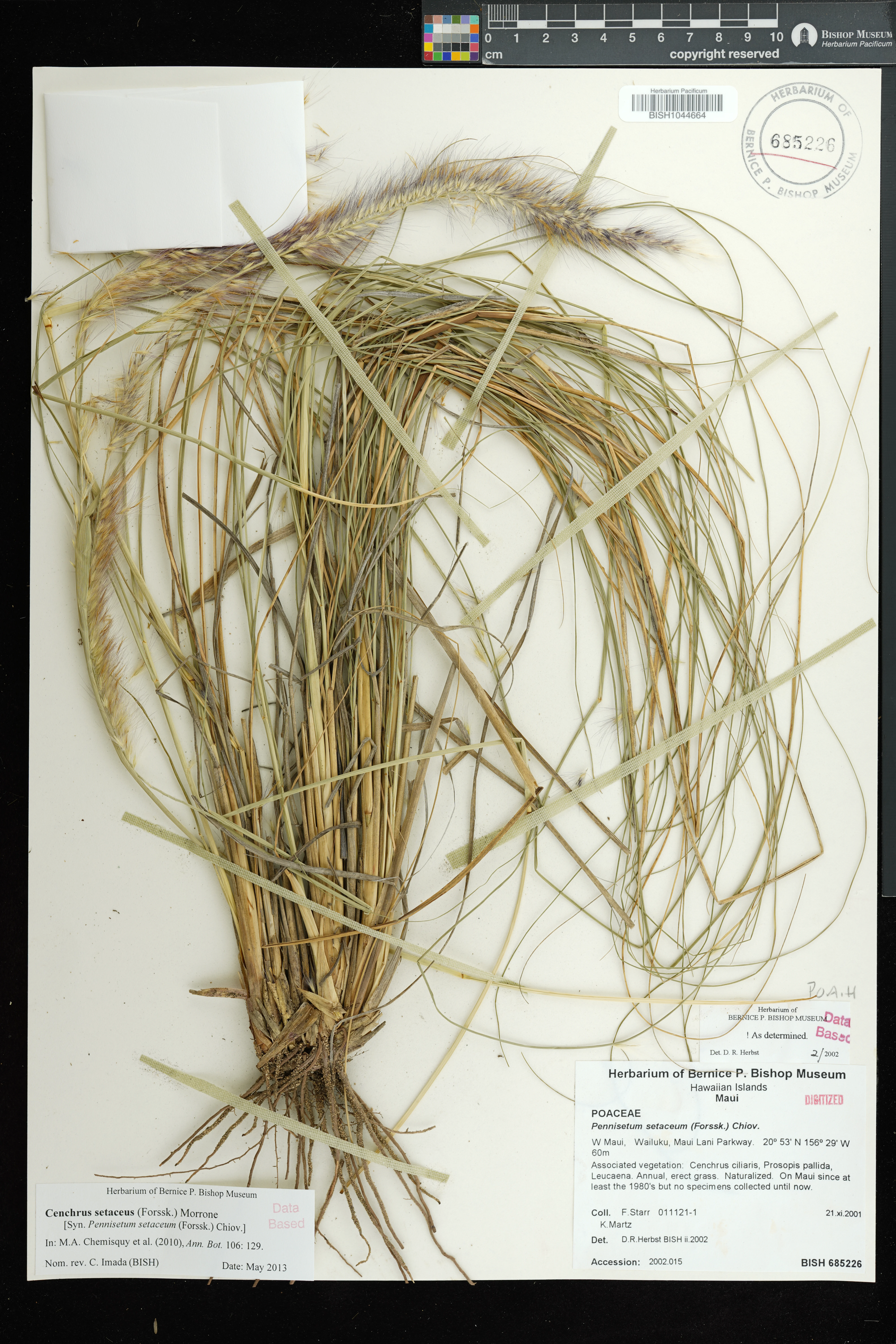 Weedy bunchgrass up to 4 ft. tall on steep rocky slopes, growing with lauae fern, Clerodendrum chinense, Bryophyllum, Psidium, Schinus. |