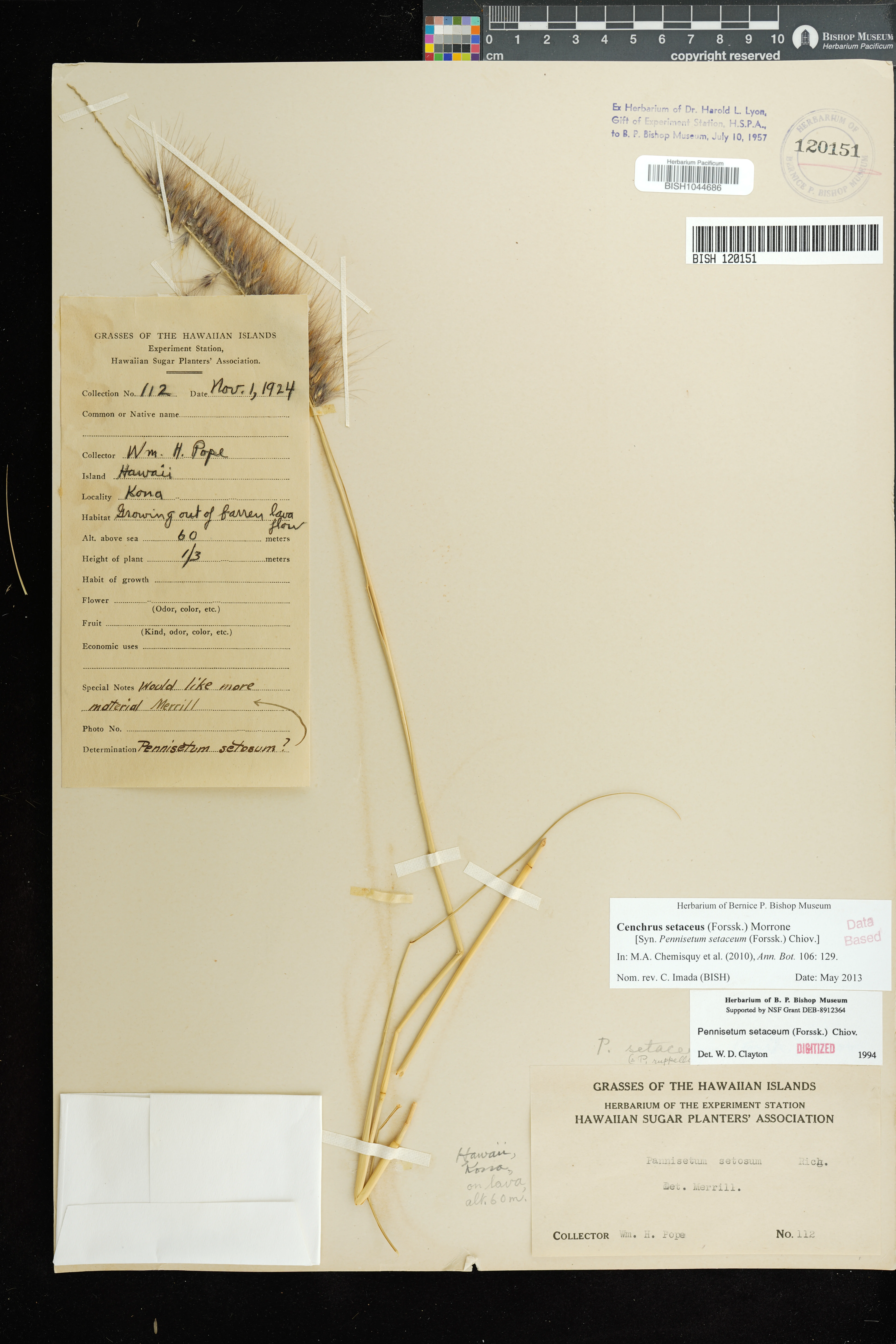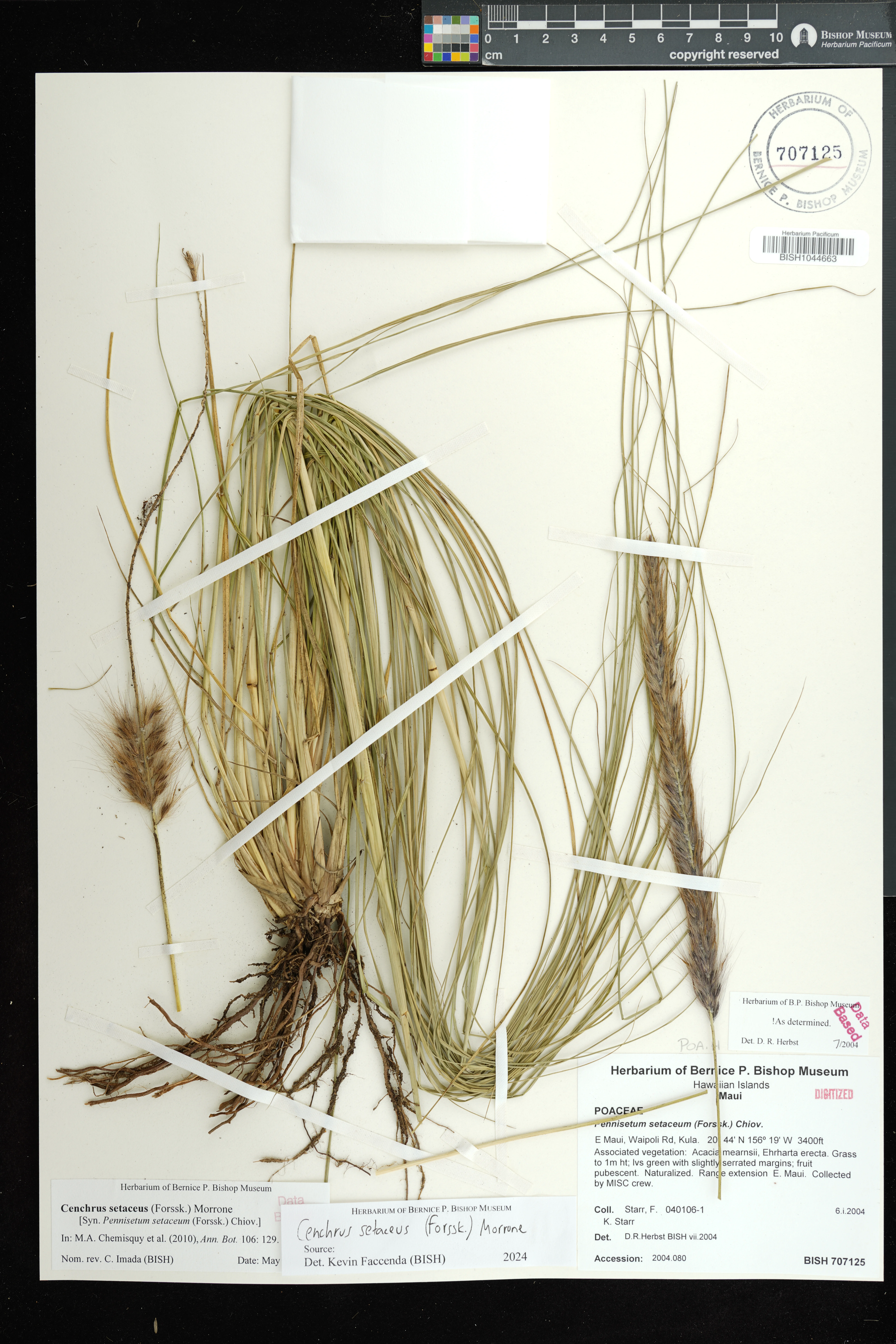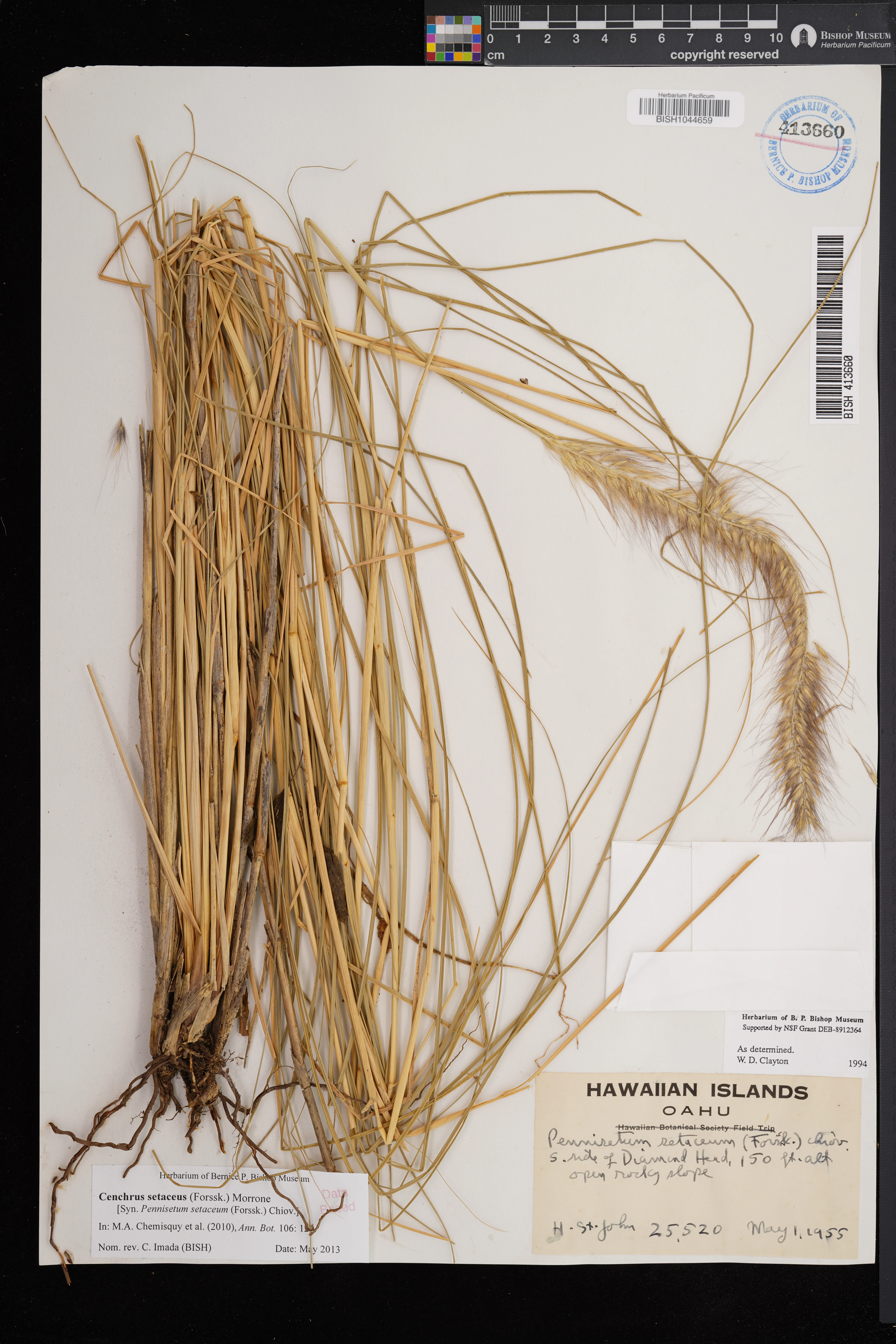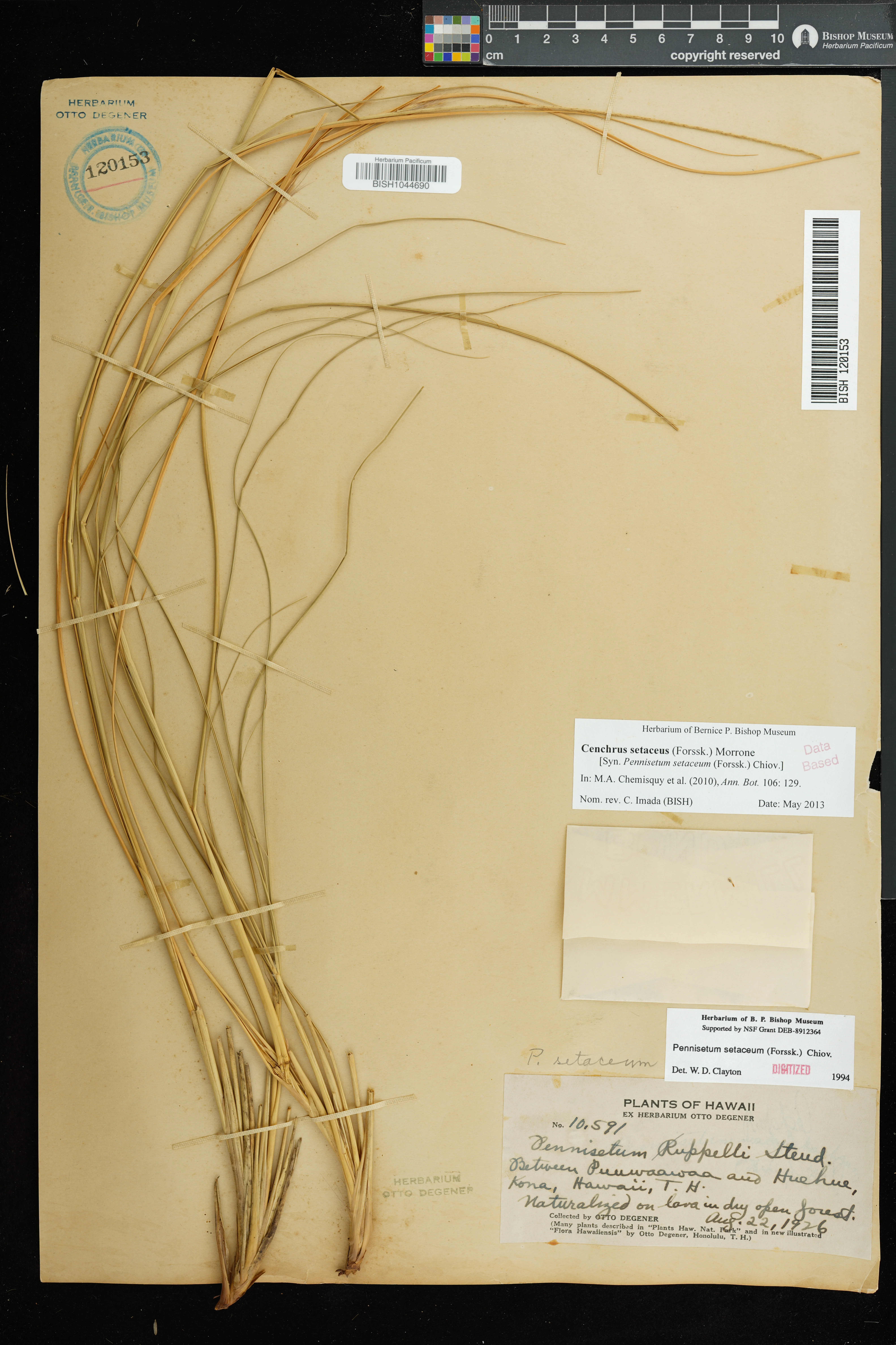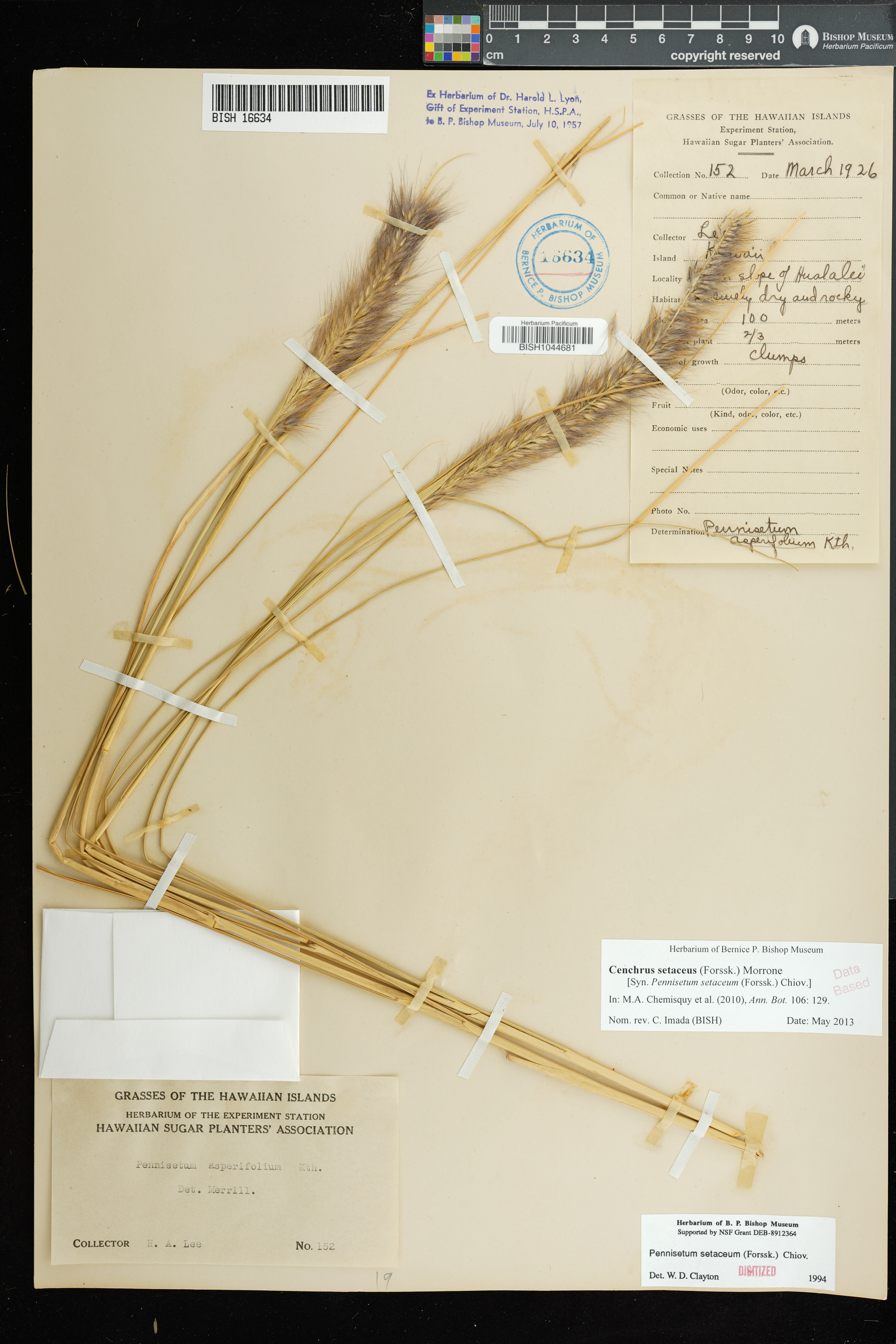 Weedy bunchgrass up to 4 ft. tall on steep rocky slopes, growing with lauae fern, Clerodendrum chinense, Bryophyllum, Psidium, Schinus. |