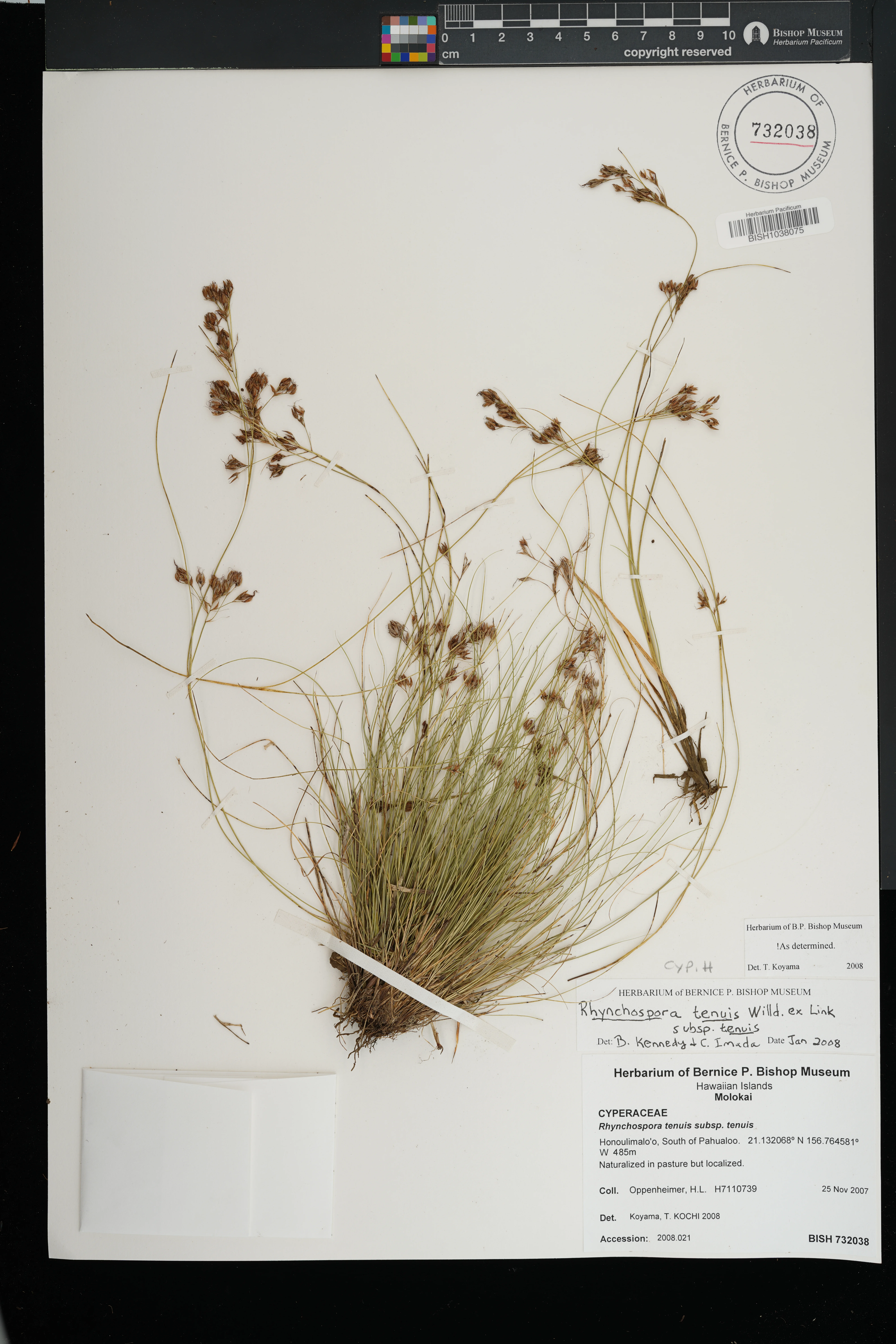 | 4 | Rhynchospora tenuis subsp. tenuis | honouli maloo, s of pahualoo | Naturalized in pasture but localized. | PRESERVED_SPECIMEN | oppenheimer, h.l. | collector number: h7110739 | Molokai | BISH | 11/25/2007 | |
