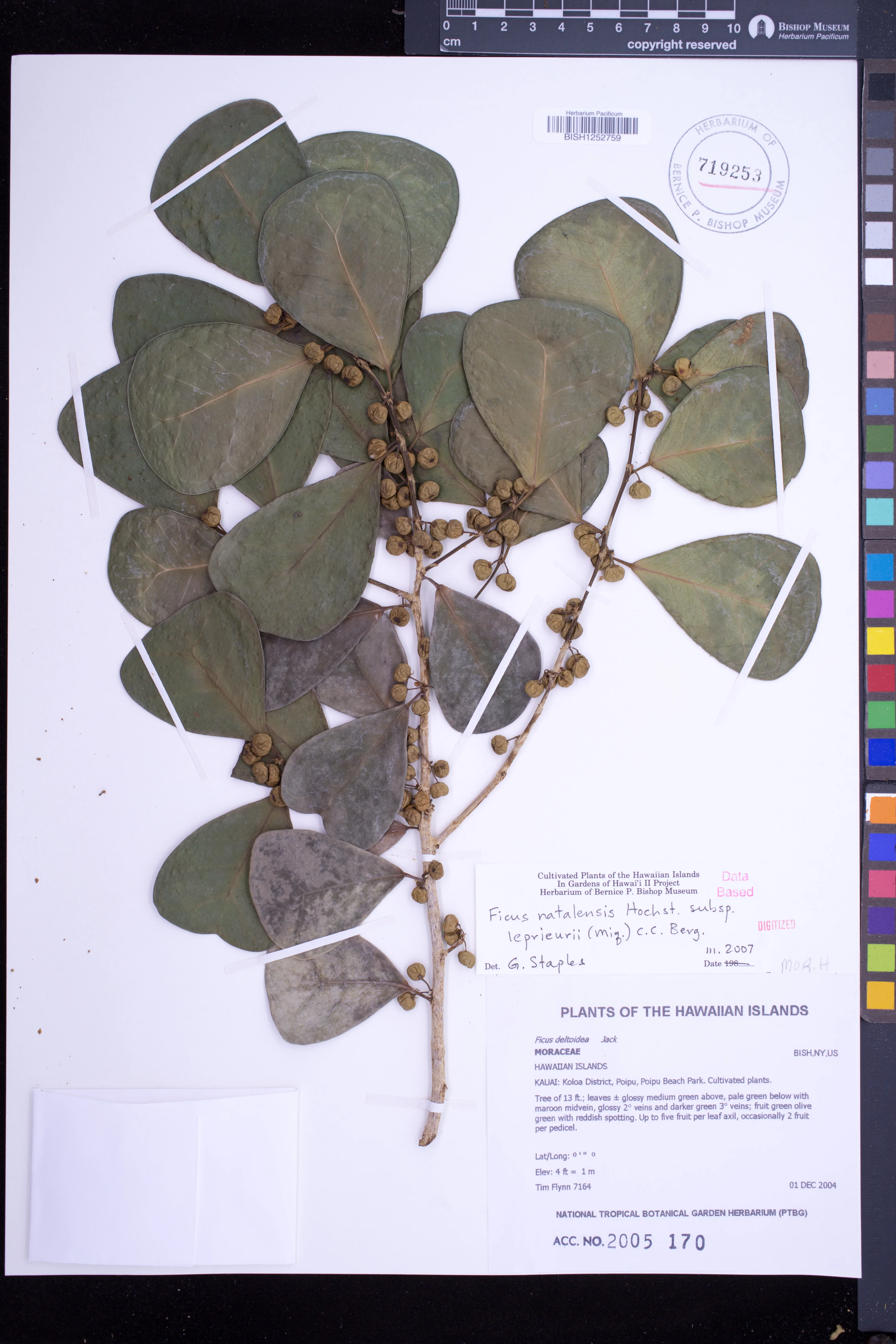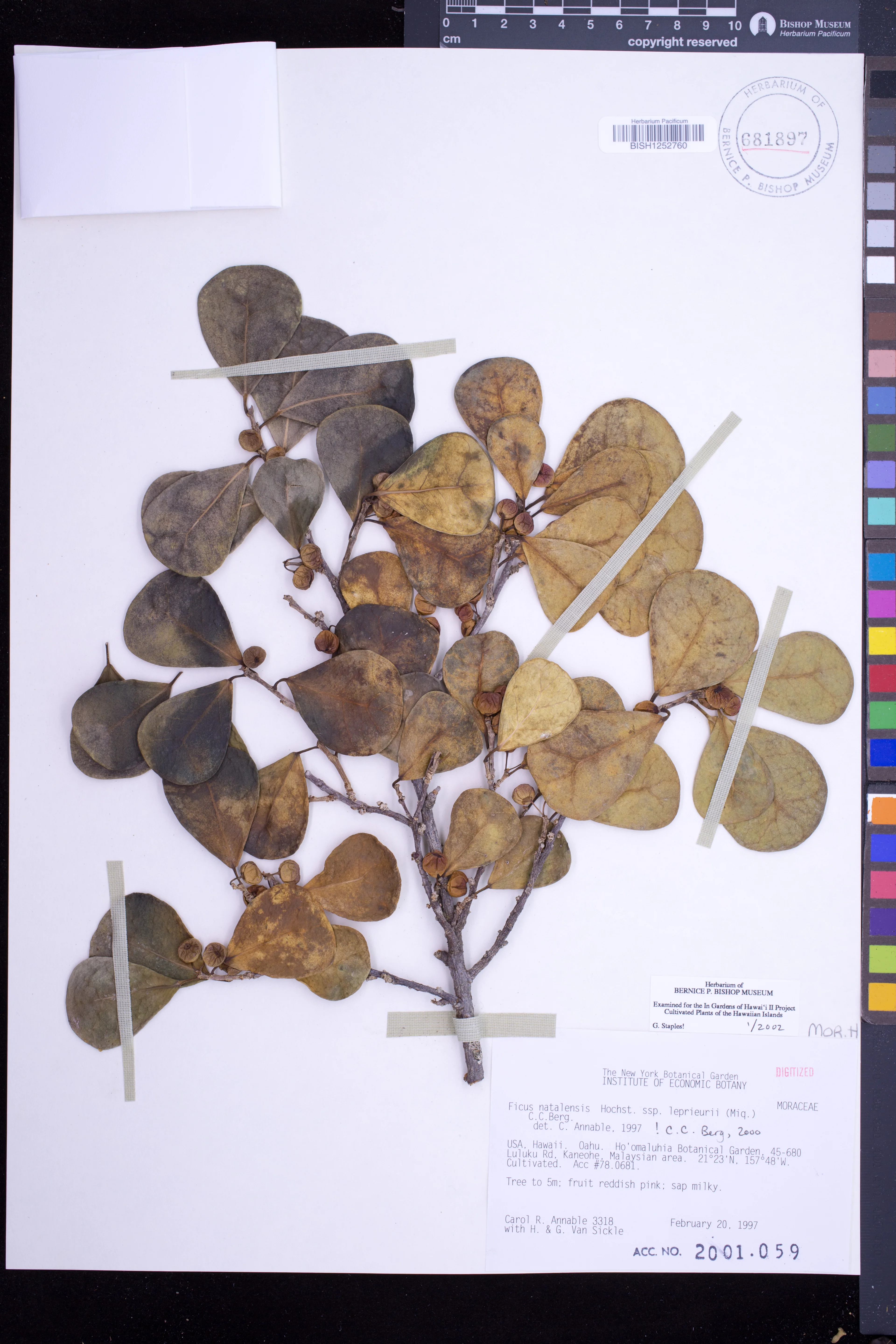 | 2 | Ficus natalensis subsp. leprieurii | (Miq.) C.C.Berg | Koloa, Poipu Beach Park | PRESERVED_SPECIMEN | Flynn, T. | 7164 | Kauai | BISH | 12/1/2004 | |