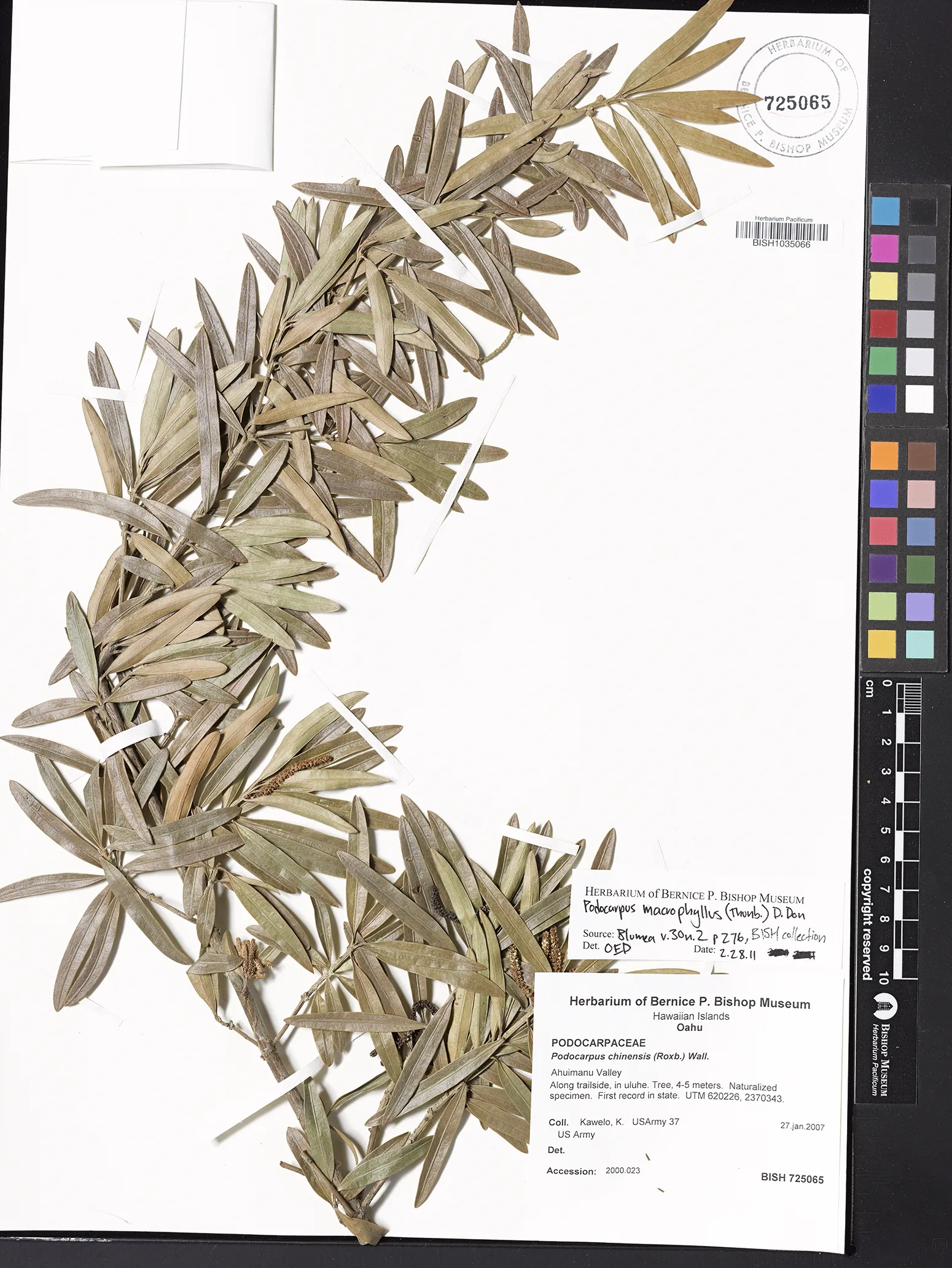 | 4 | Podocarpus macrophyllus | (Thunb.) Sweet | Ahuimanu Valley | Along trailside, in uluhe. | PRESERVED_SPECIMEN | Kawelo, K. | USARMY 037b | Oahu | BISH | 1/27/2007 |